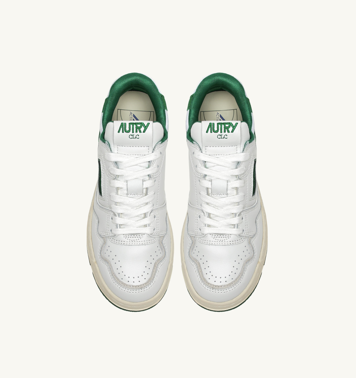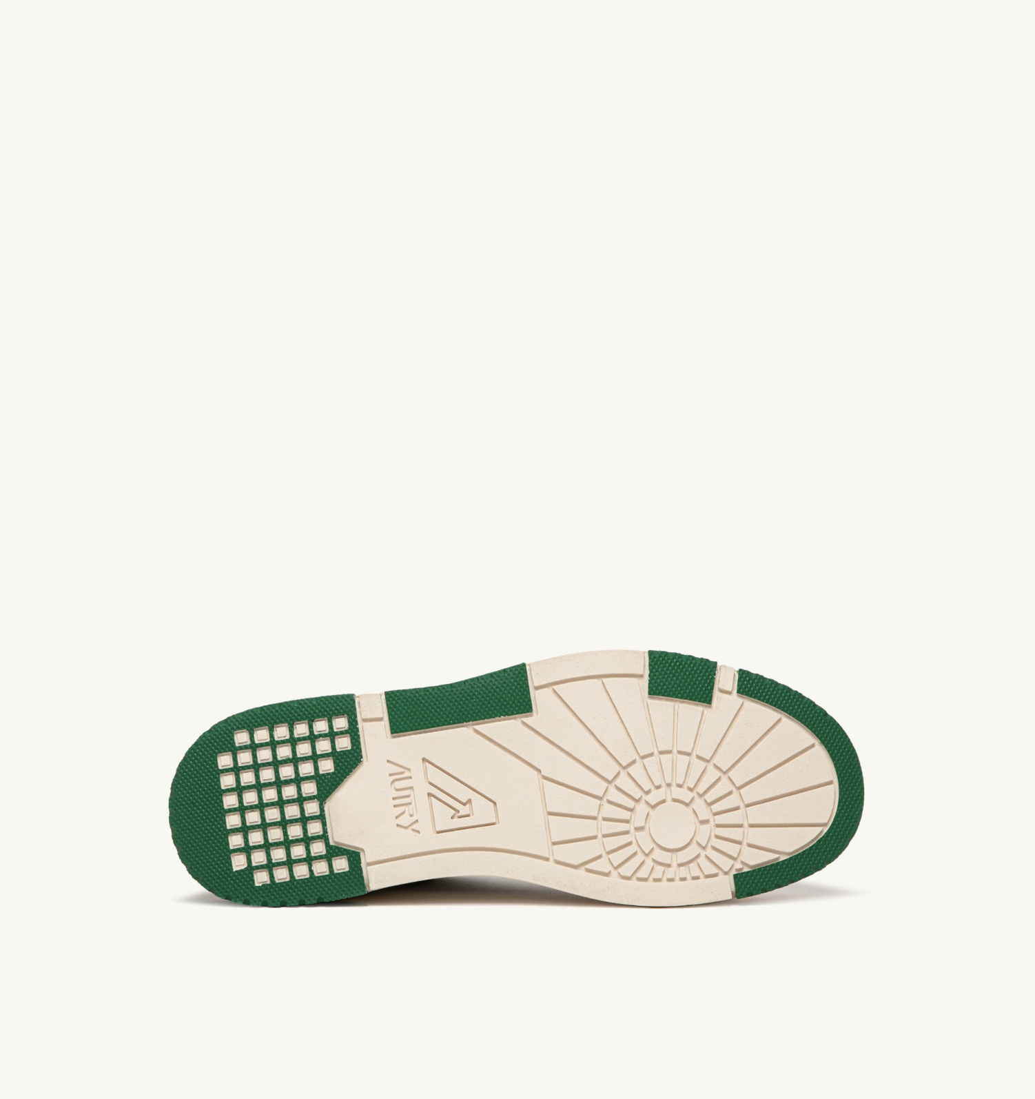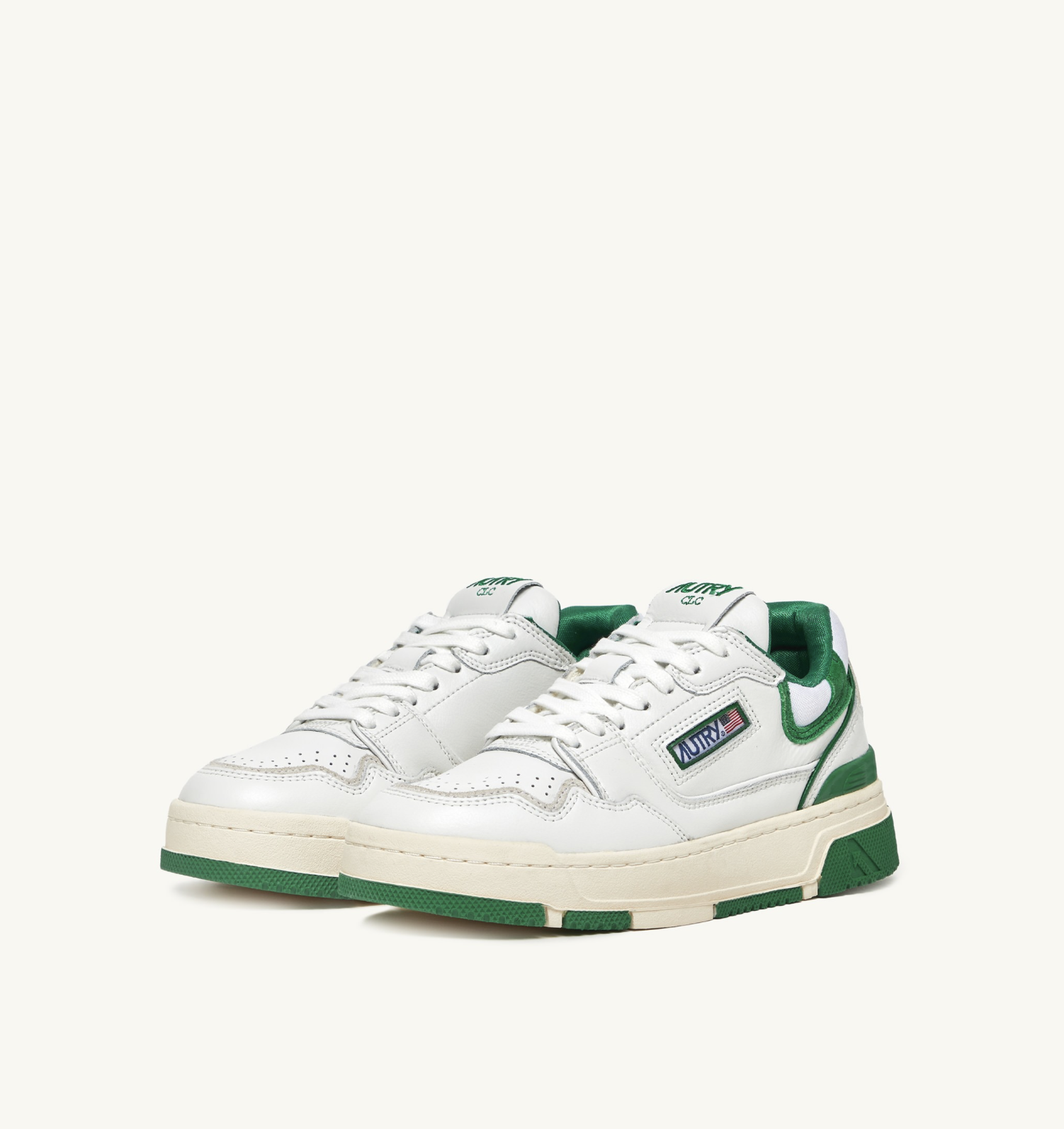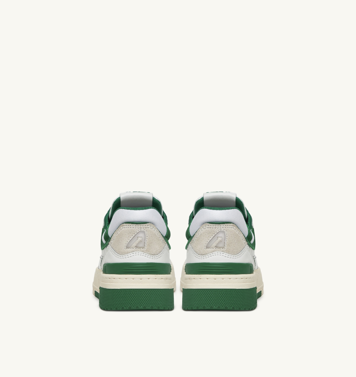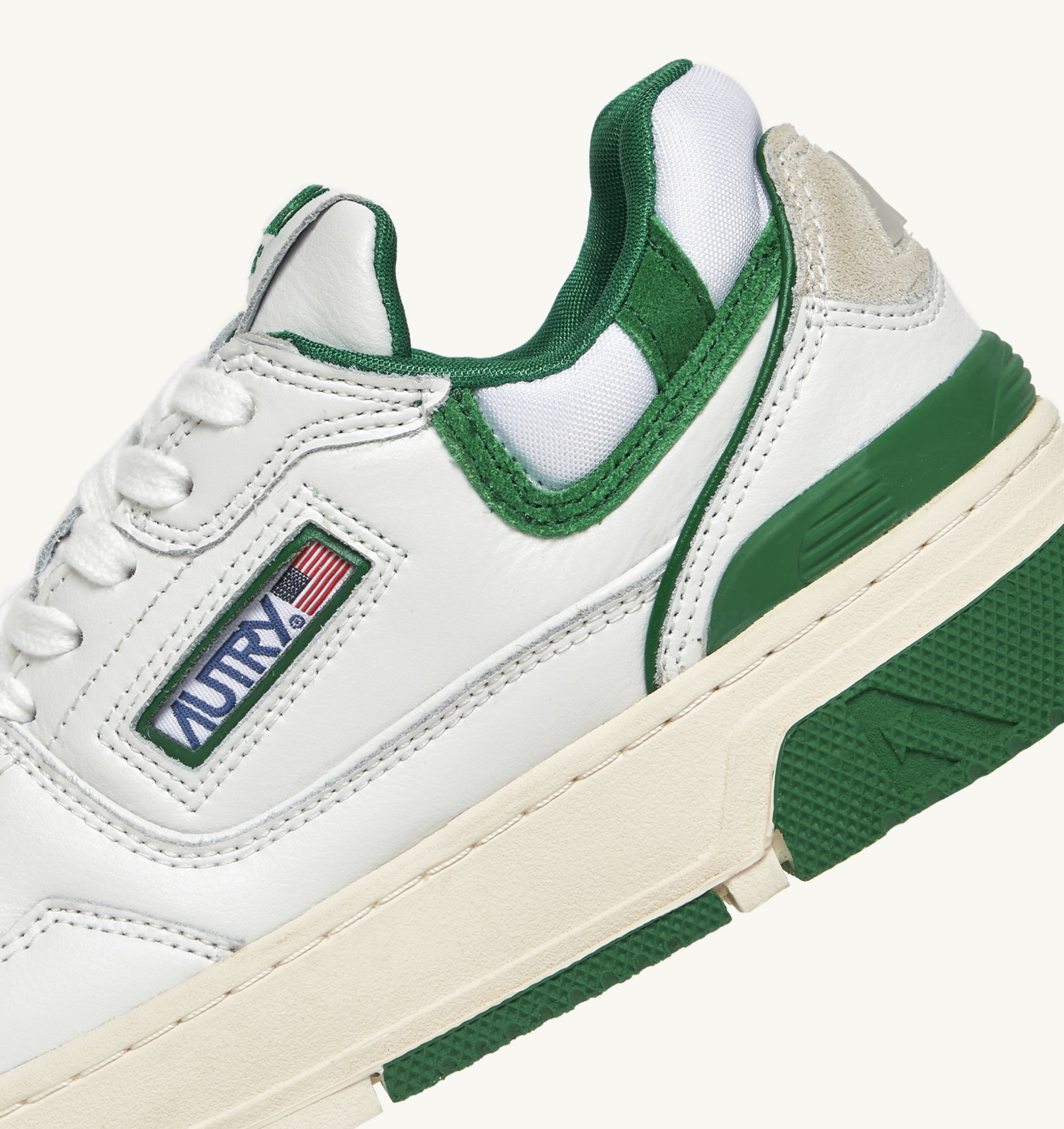 Мужская модель выполнена из белой кожи с зелеными замшевыми деталями, отличается смелой и привлекательной формой, мягким сетчатым воротником вокруг лодыжки и внутренней поддержкой, обеспечивающей дополнительную опору для пятки. Отличительной особенностью является высокая резиновая подошва с рельефным протектором, чередующимся белым и зеленым цветом, подчеркивающим уличный стиль.