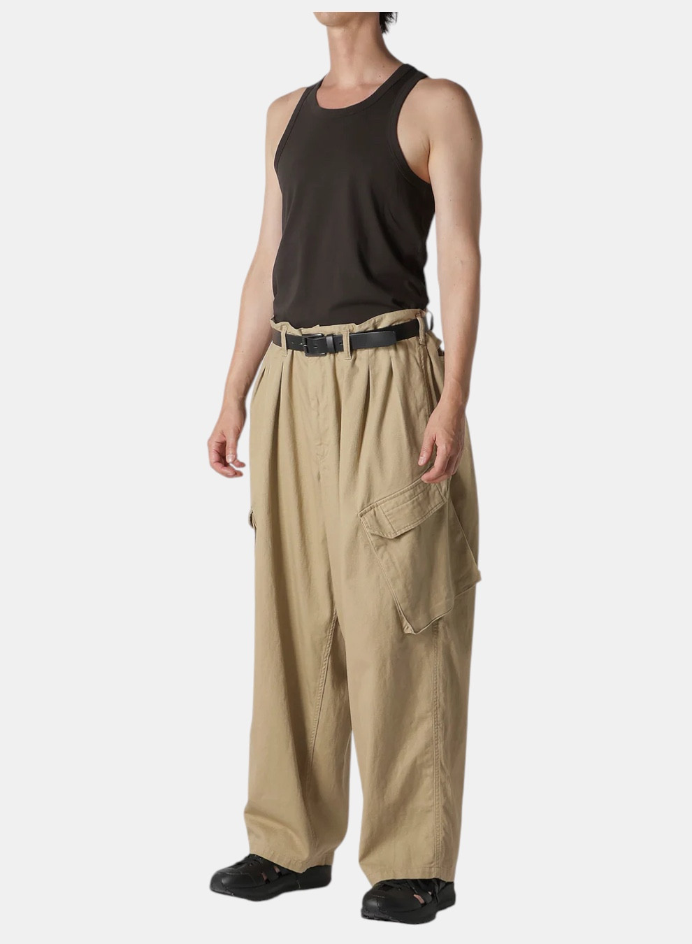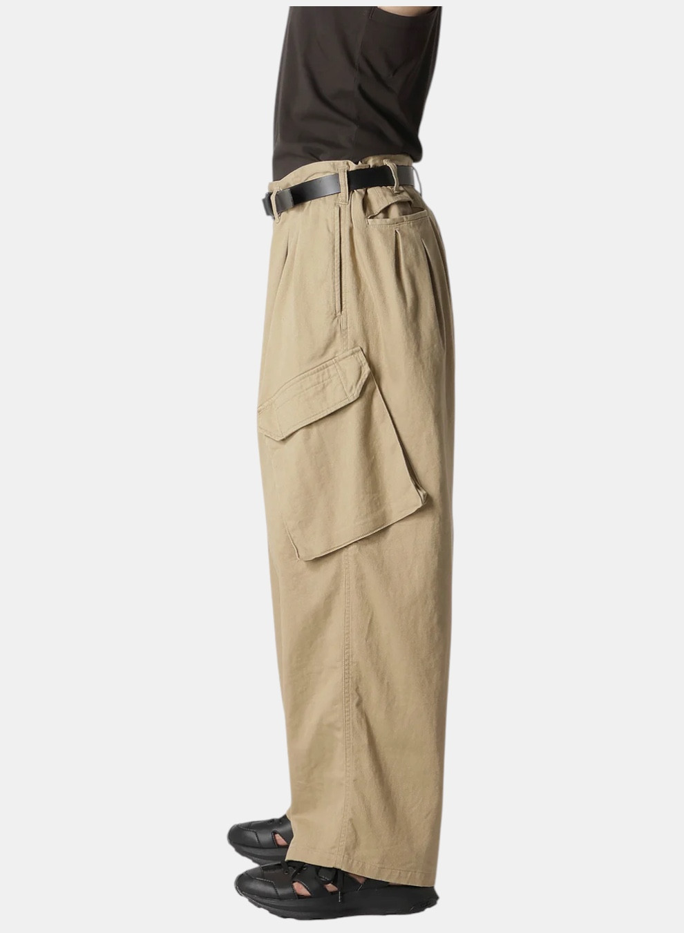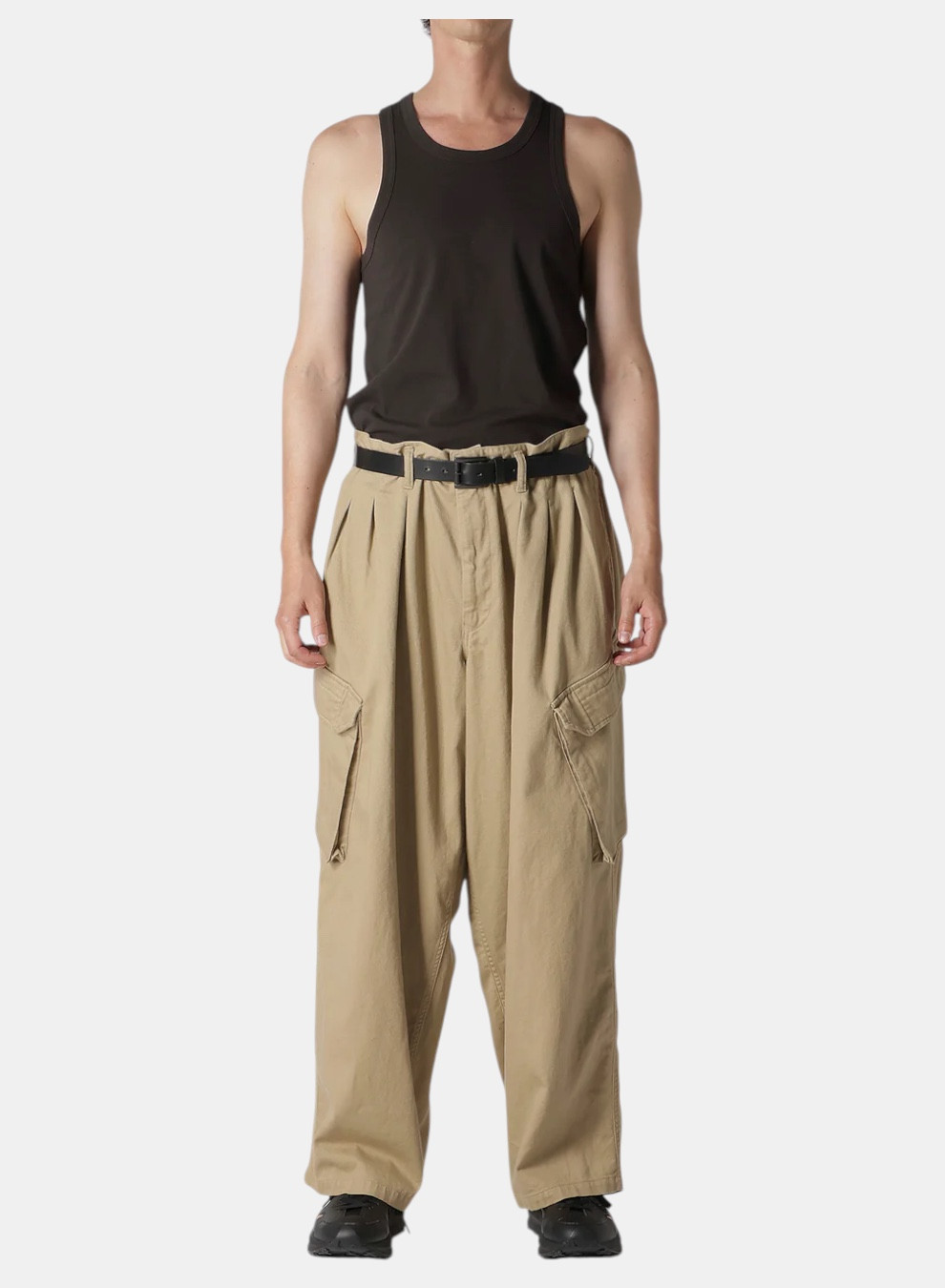 Брюки со складками изготовлены из саржевой ткани, сотканной из толстых нитей, образующих диагональные линии, называемые твилом. Крутой угол (45 градусов и более) линий твила обеспечивает легкое отведение воды, что делает ткань прочной и пригодной для рабочей одежды.