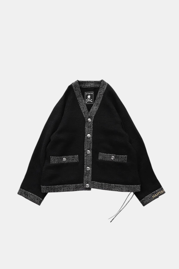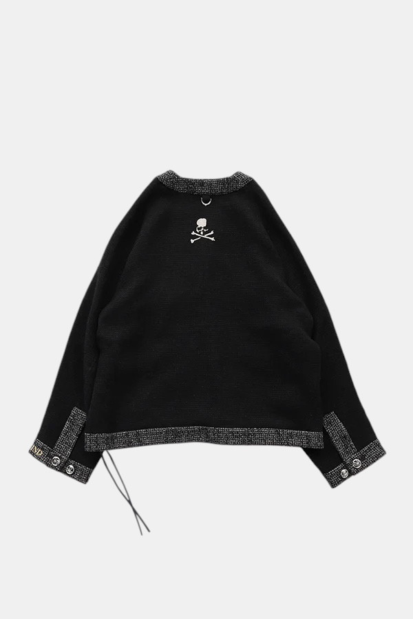 Кардиган из твида, изготовленный из ткани сотканной в два раза дольше обычной, что создает ощущение мягкости, воздушности и элегантной отделки. Вышивка в виде черепа на спине.