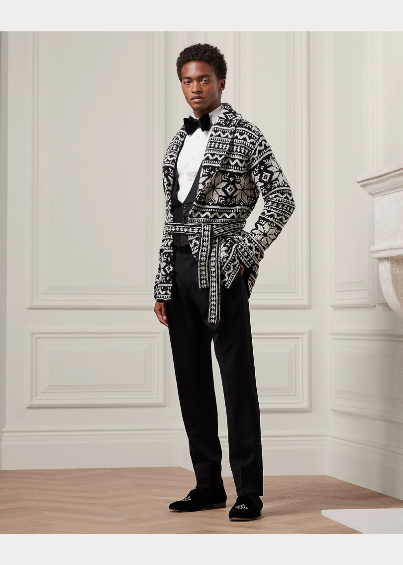 Кардиган с шалью и поясом выполнен в ярком узоре из плотного кашемира из Италии и Шотландии. Спереди застегивается на настоящие роговые пуговицы.