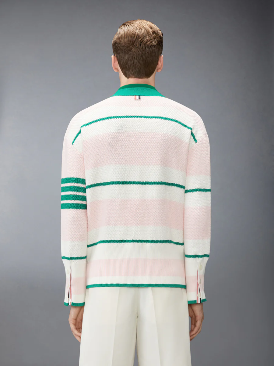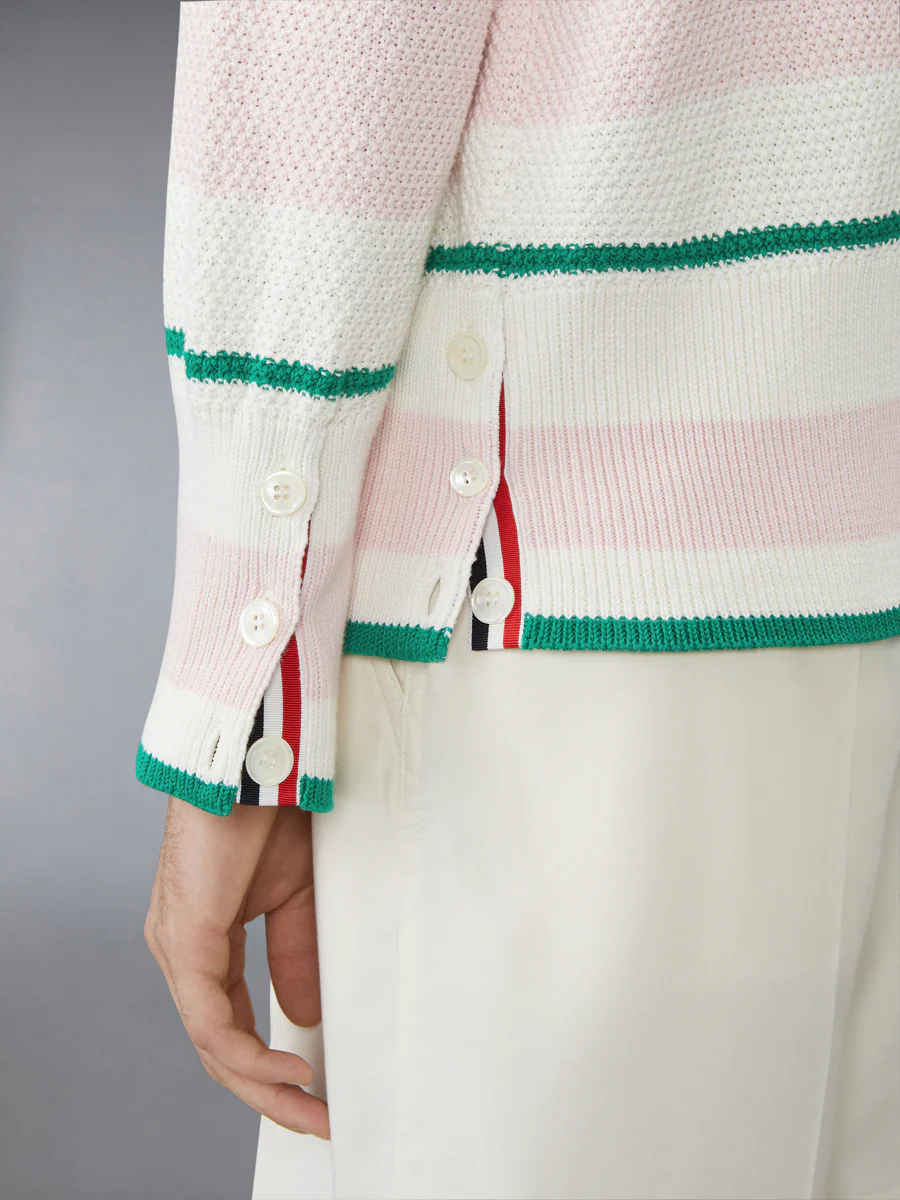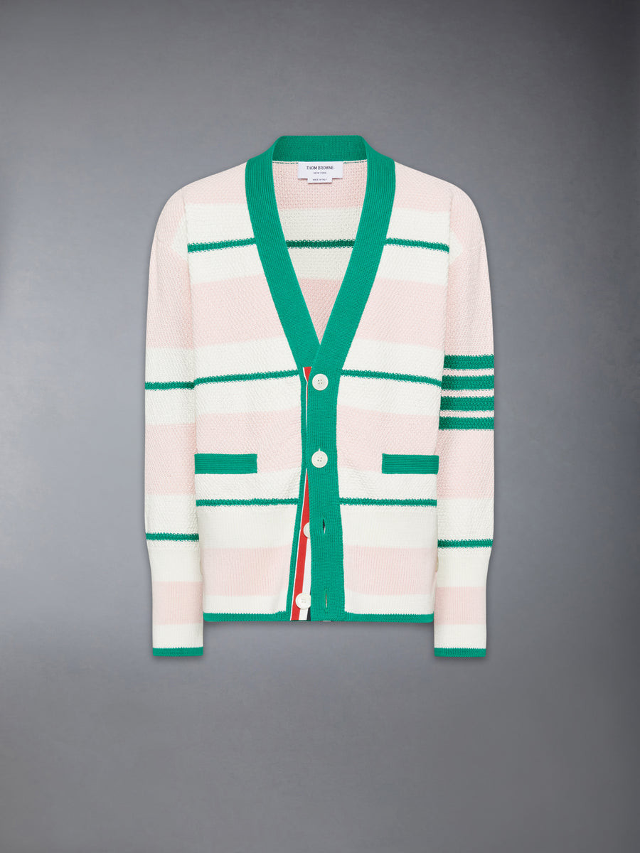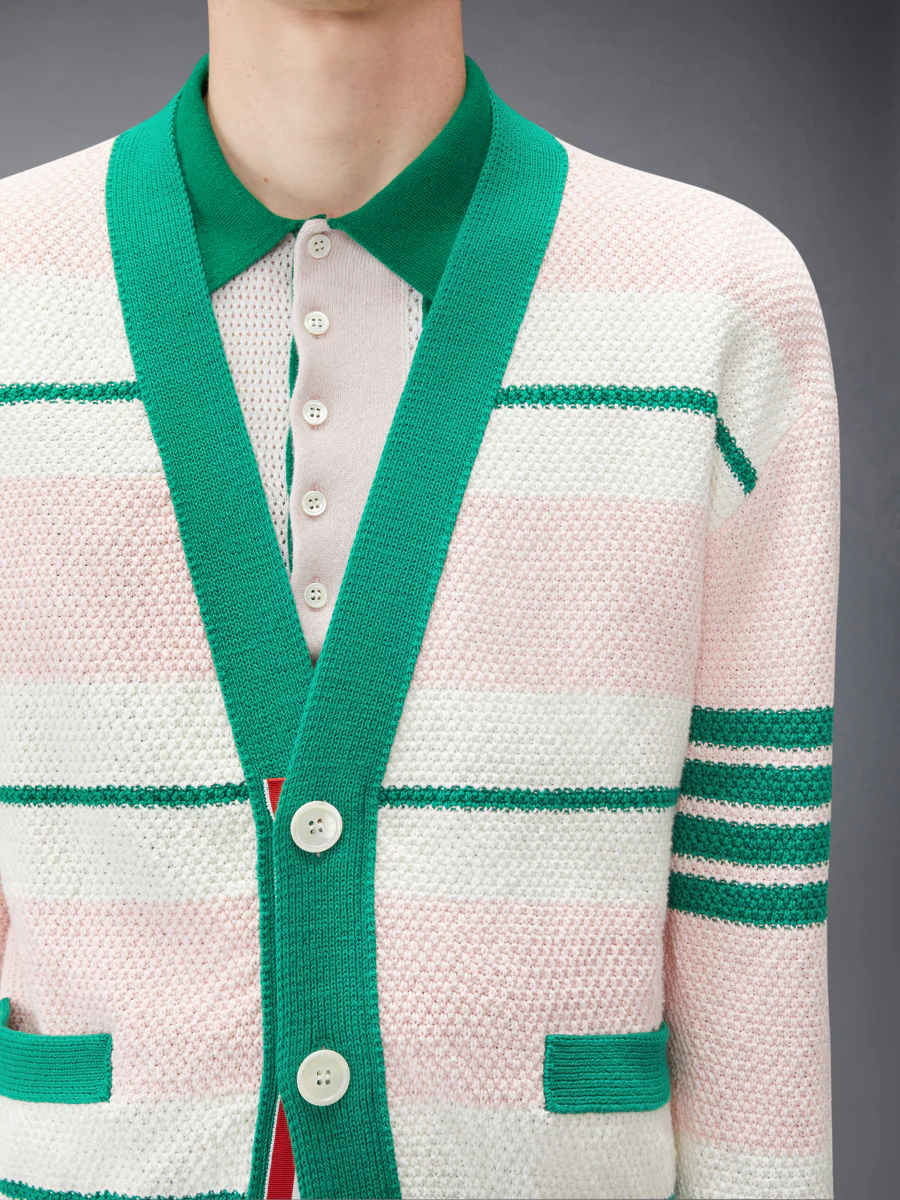 Kардиган с V-образным вырезом, связанный плотной хлопковой вязкой, воплощает в себе фирменный стиль бренда, сочетающий строгость униформы и мастерство. Плотная текстура придает изделию структуру и глубину, дополненные полосками 4-Bar и отделкой из репсовой ленты RWB — символом классических кодов, усовершенствованных благодаря точности.