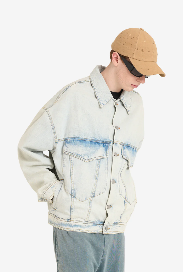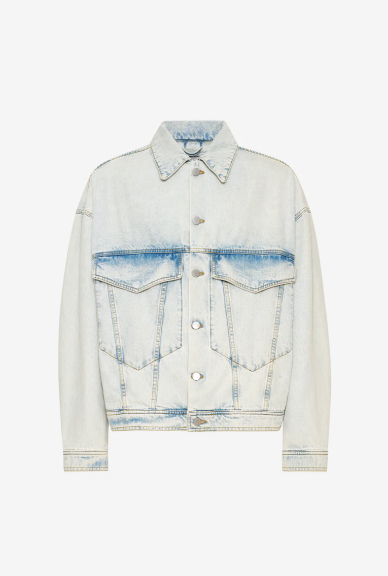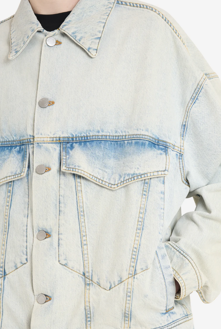 Джинсовая куртка Loose Denim Bleach Blue с длинными рукавами. Имеет отложной воротник и застежку на пуговицы спереди. На груди расположены накладные карманы, а на талии — прорезные. Манжеты застегиваются на одну пуговицу. Регулируемые пуговицы на подоле сзади. Куртка имеет специальную окраску и эффект мятой ткани для создания винтажного вида.