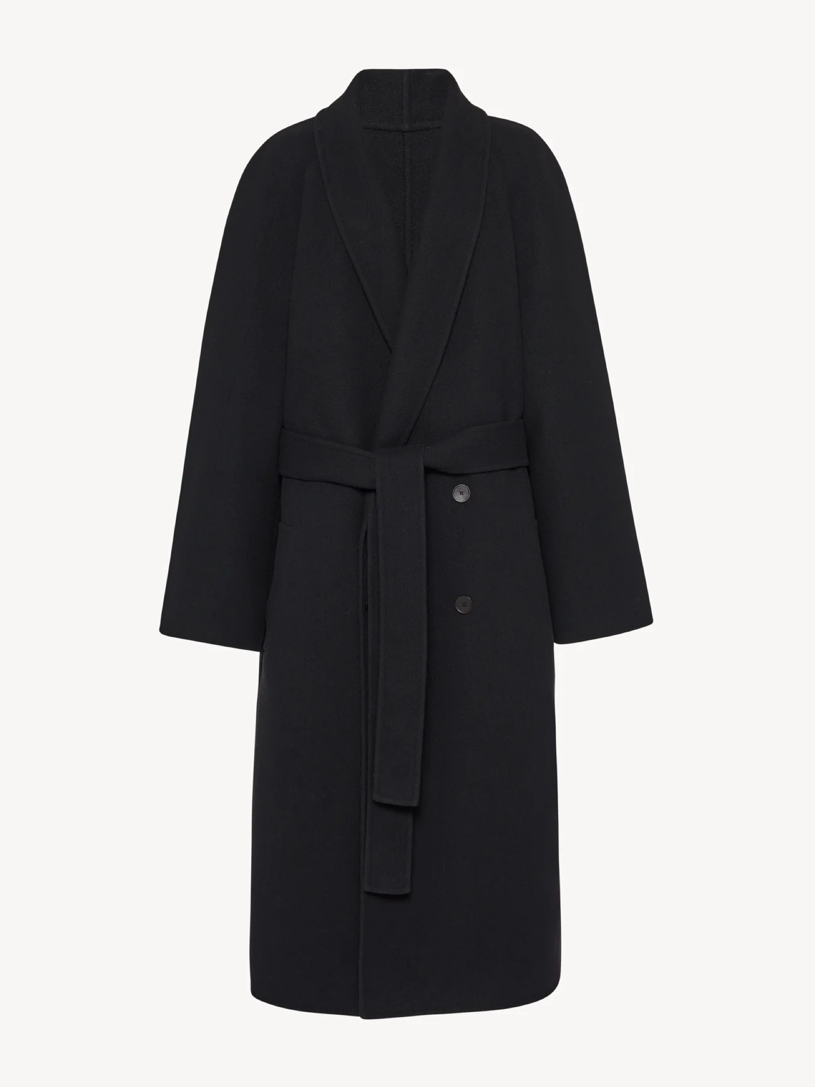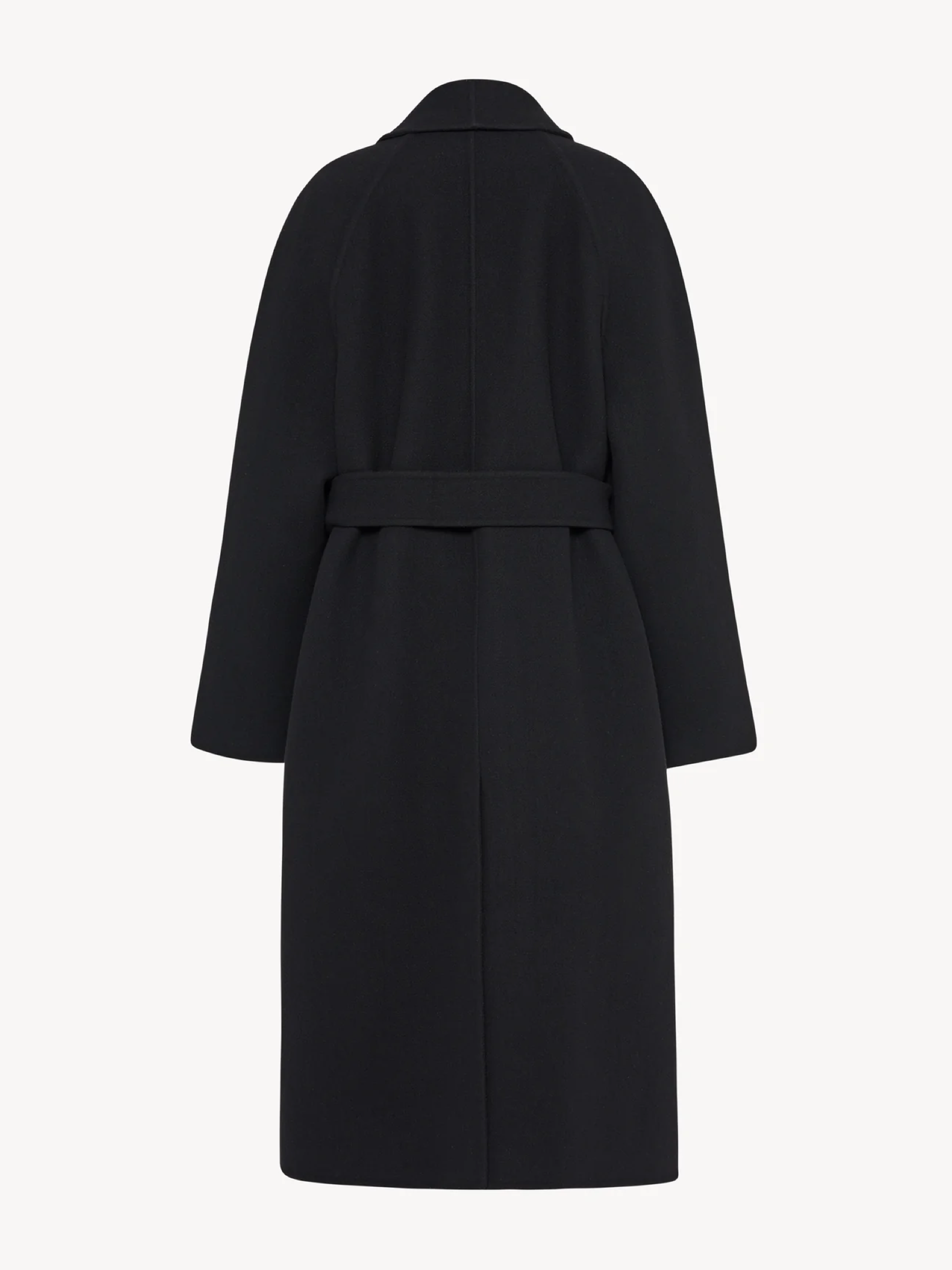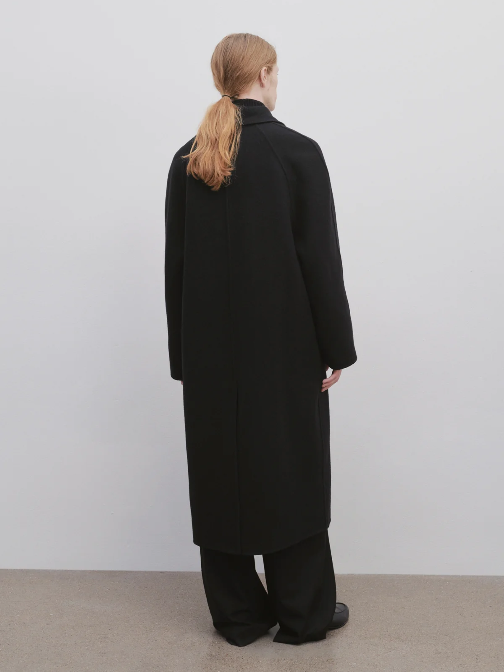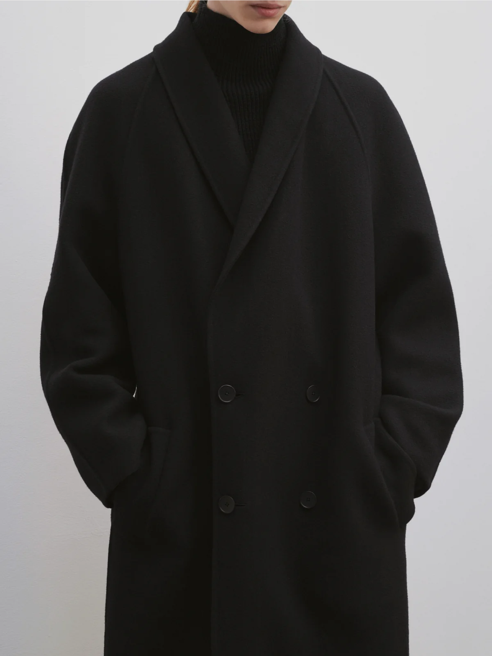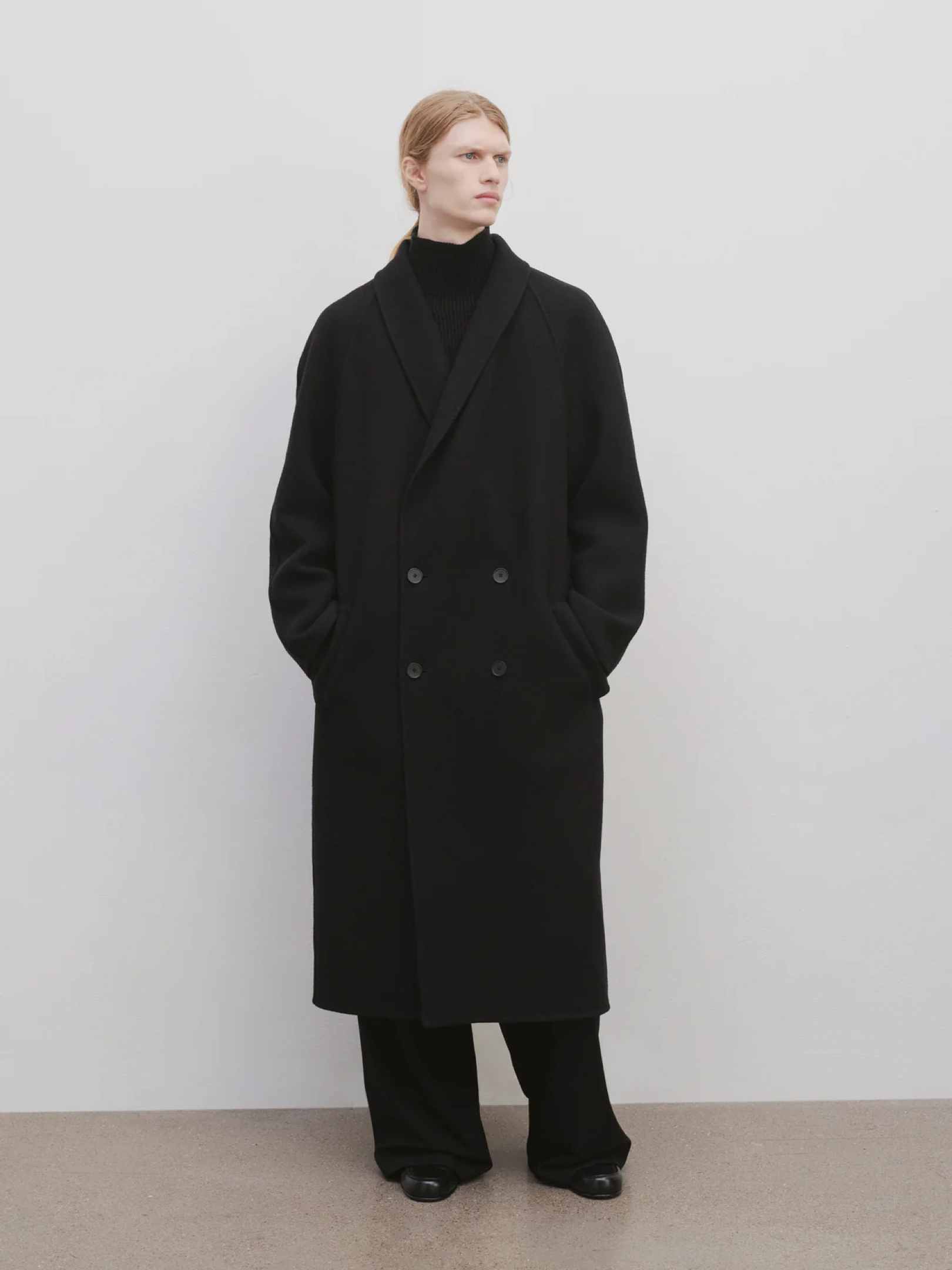Двубортное пальто длиной до колена из валяной шерсти свободного кроя, с высоким шалевым воротником, открытой планкой на четырех пуговицах и шлицевым швом по центру спины.