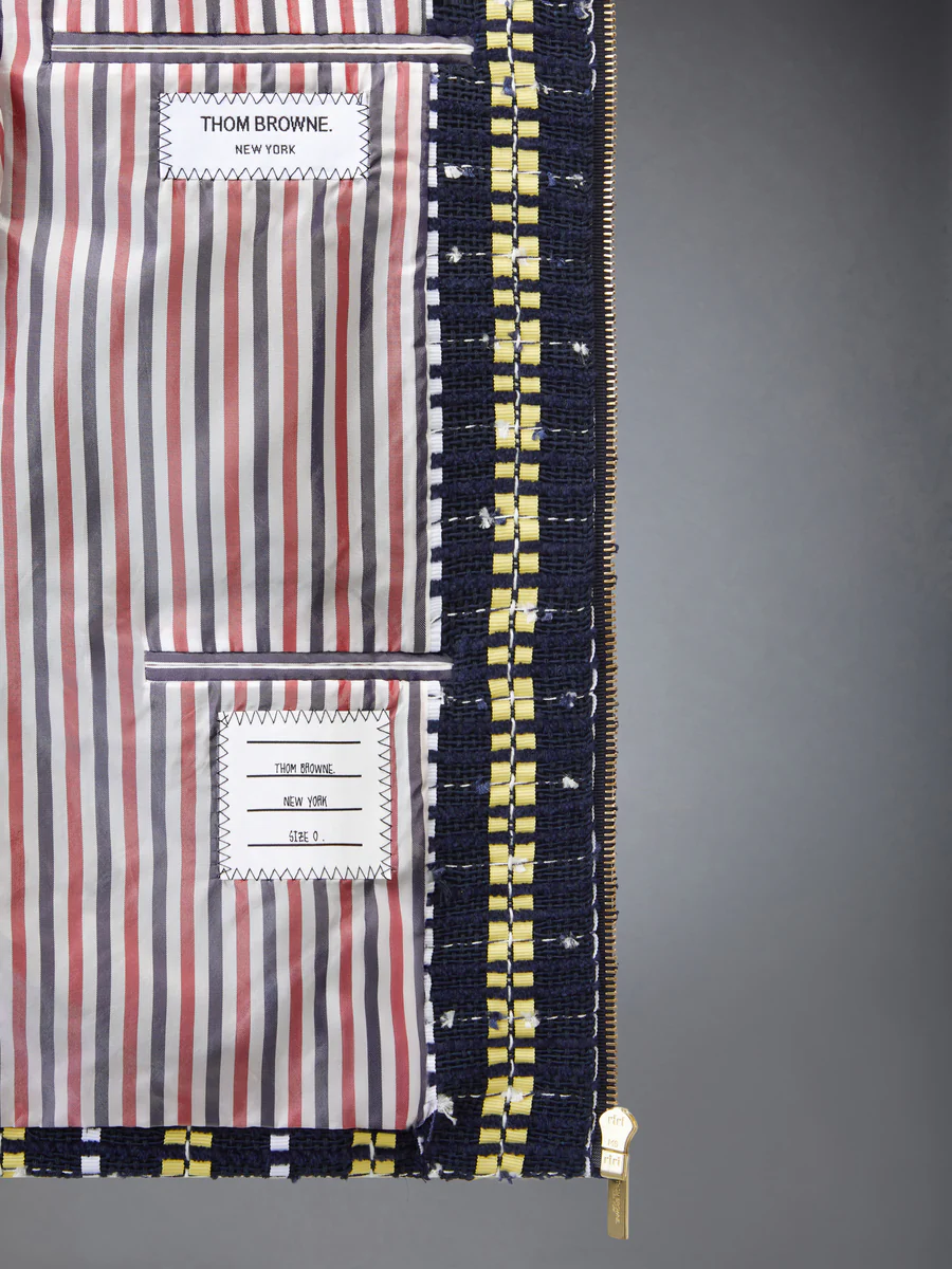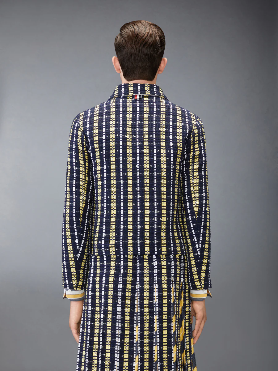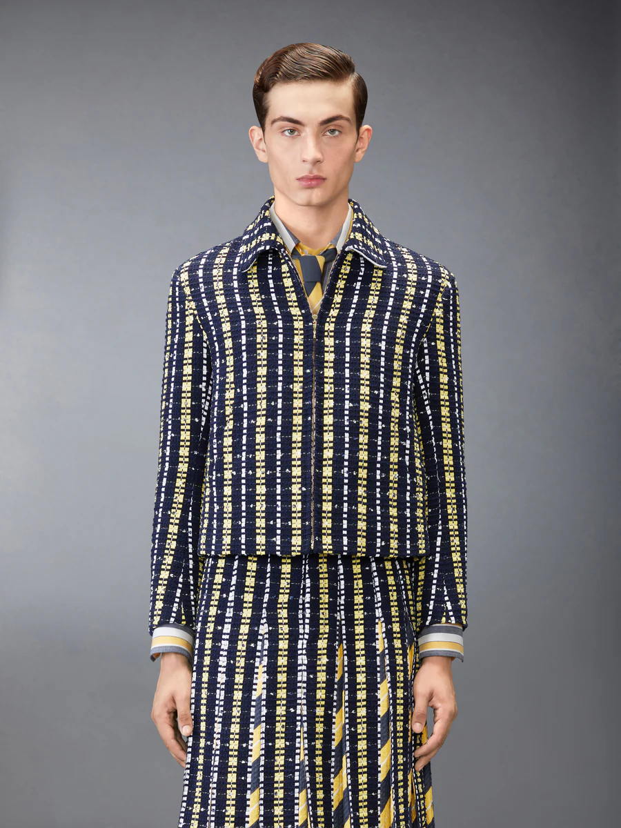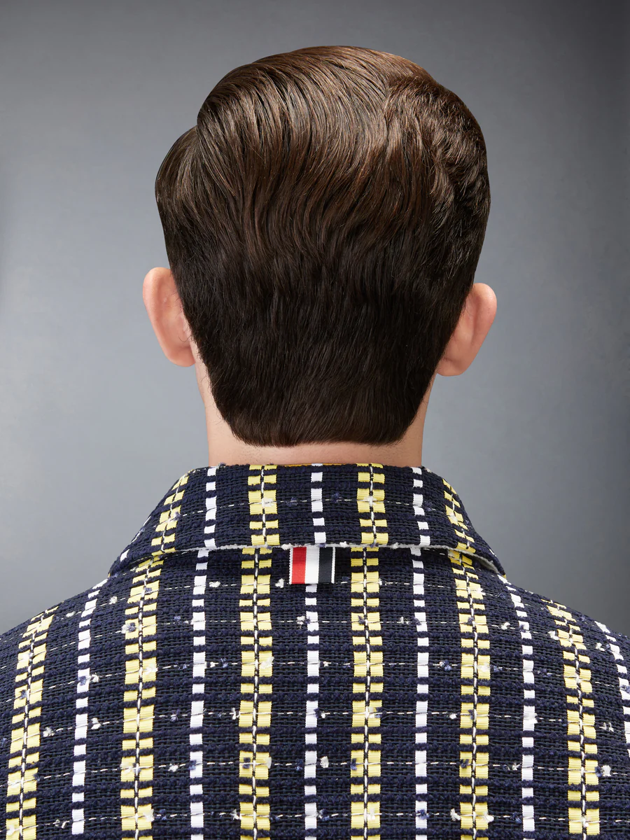 Классический силуэт для гольфа переосмыслен через призму богатой тактильной текстуры. Изготовленный из материала, сочетающего в себе несколько нитей и ленты гросгрейн ручной работы, демонстрирует объемную поверхность с тонкой структурой. Сочетая текстуру и точность, легко сочетается с соответствующей плиссированной юбкой из твида Repp Stripe Grosgrain, создавая завершенное воплощение дизайнерского языка Thom Browne.