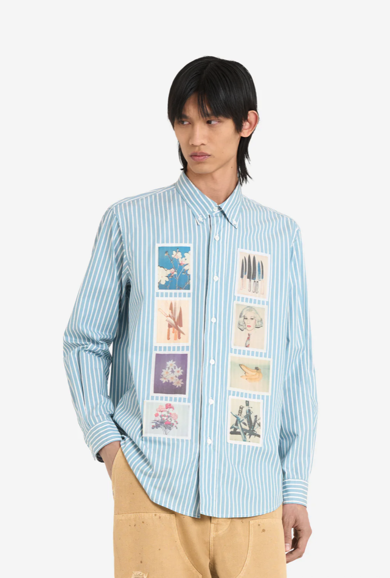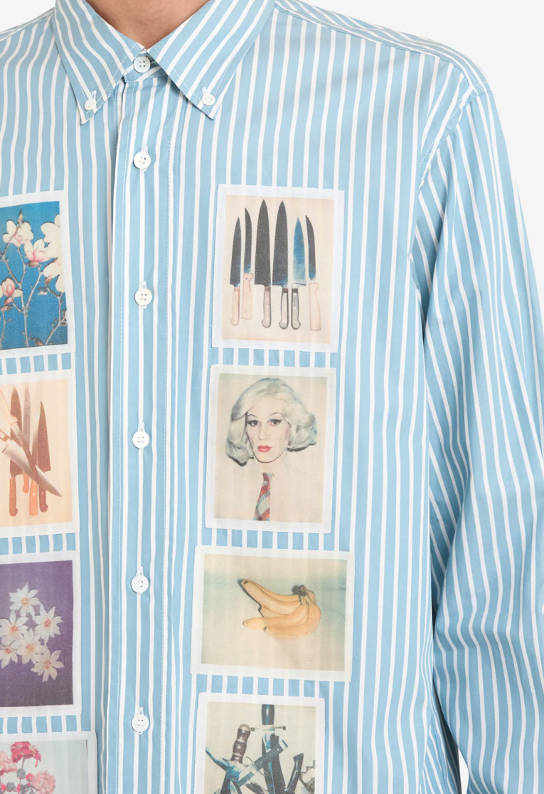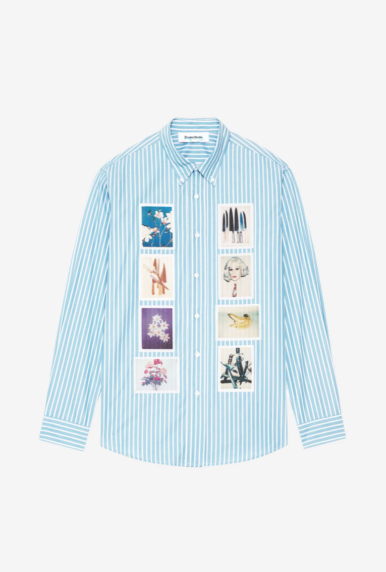 В результате сотрудничества Энди Уорхола и Études Studio, рубашка Andy Warhol Relax Shirt — свободная рубашка на пуговицах из 100% хлопка. С обеих сторон рубашки изображены полароидные снимки Энди Уорхола, контрастирующие с вертикальными синими полосами.