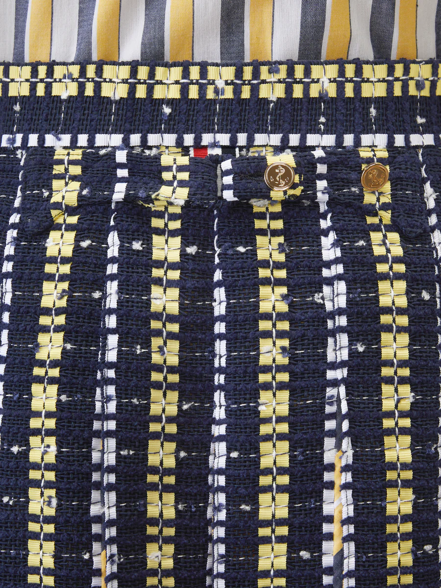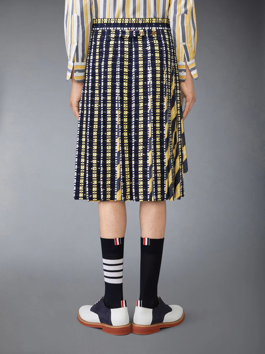 Плиссированная юбка переосмысливает дисциплину униформы, используя богатую тактильную палитру. Изготовленная из материала, сочетающего в себе несколько нитей и ленты гросгрейн ручной работы, объёмная поверхность придаёт движение силуэту длиной до колена. Сочетая текстуру и точность, юбка легко сочетается с подходящей твидовой курткой-бомбером Repp Stripe Grosgrain Tweed Golf Jacket, создавая завершенный образ в стиле Thom Browne.