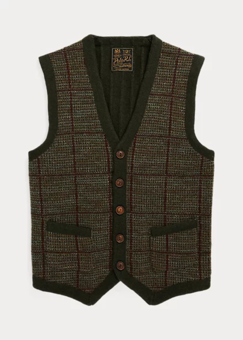 Жилет-свитер, украшенный настоящими роговыми пуговицами, воссоздает галантерейный узор из пяти различных шерстяных нитей. Сзади имеется трикотажная вставка в рубчик и регулируемый ремень с D-образным кольцом.