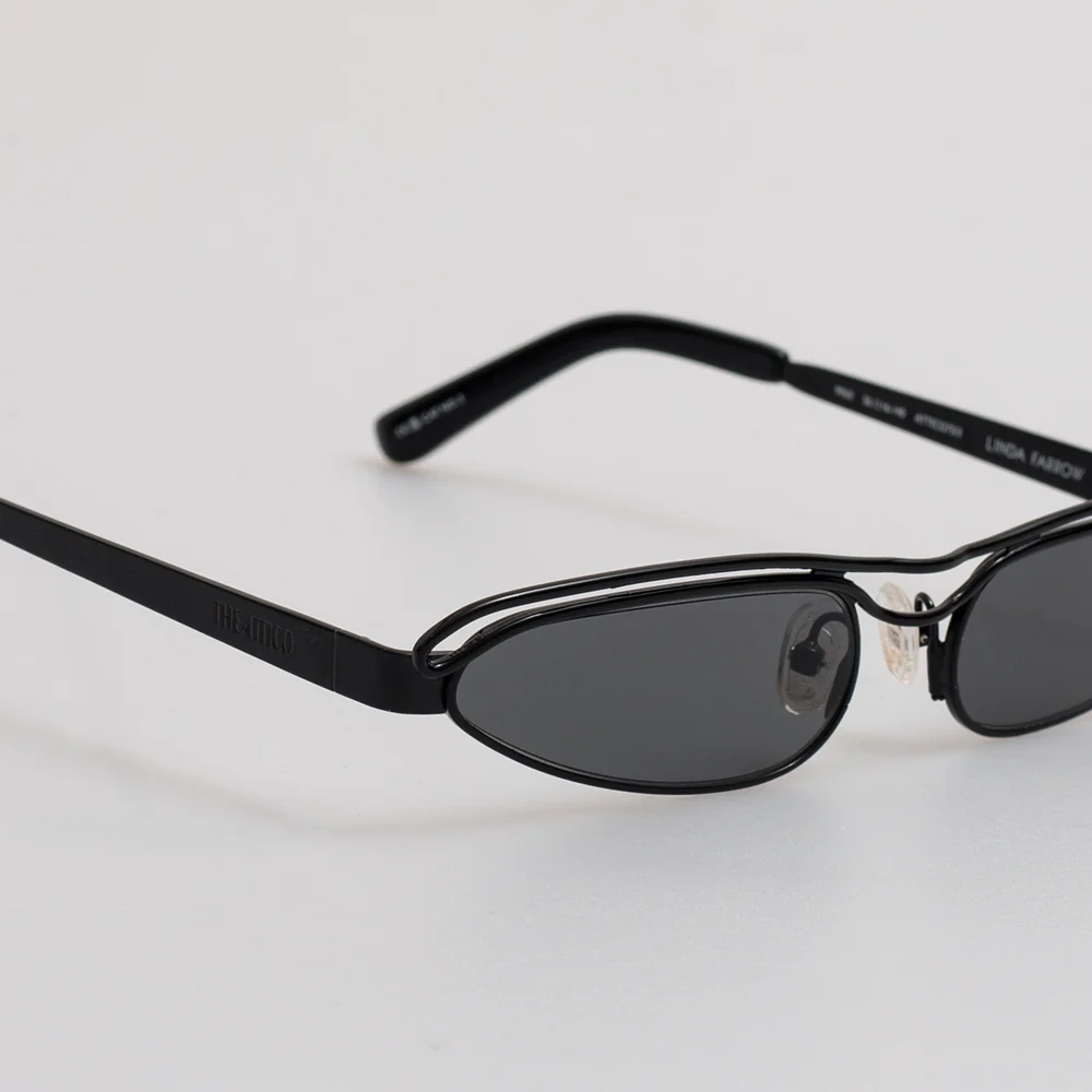 Представляем модель Norma, созданную в сотрудничестве с модным домом Linda Farrow. Cолнцезащитные очки в форме «кошачьих глаз» выполнены из нержавеющей стали с черным покрытием и оснащены серыми линзами. Регулируемые носовые упоры обеспечивают индивидуальную посадку, позволяя настроить положение для максимального комфорта.