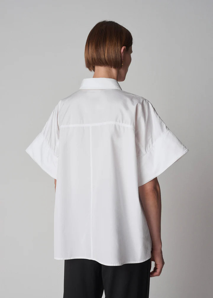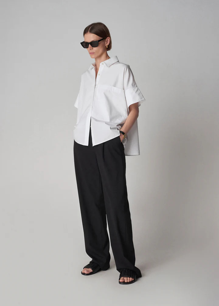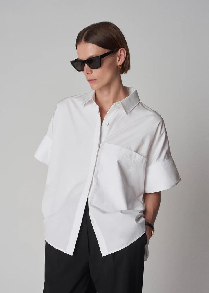 Точно сшитая, но удобная по фигуре хлопковая рубашка с короткими рукавами. Его можно легко носить навыпуск или элегантно заправить в юбку-карандаш, где сжатый объем может создать самые соблазнительные формы. Потайная планка посередине переда.