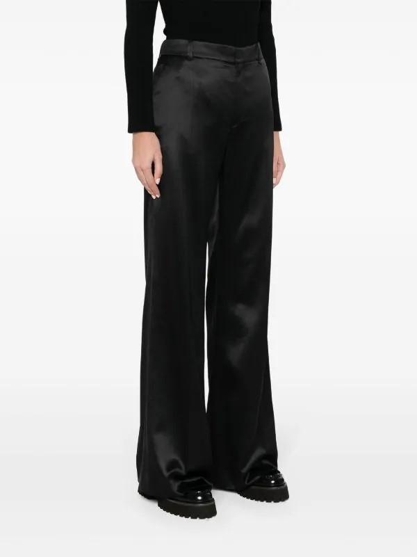 Раслешенные брюки выполнены из премиальной смеси шерсти и шелка с атласным финишем. Модель дополнена бархатными деталями.
