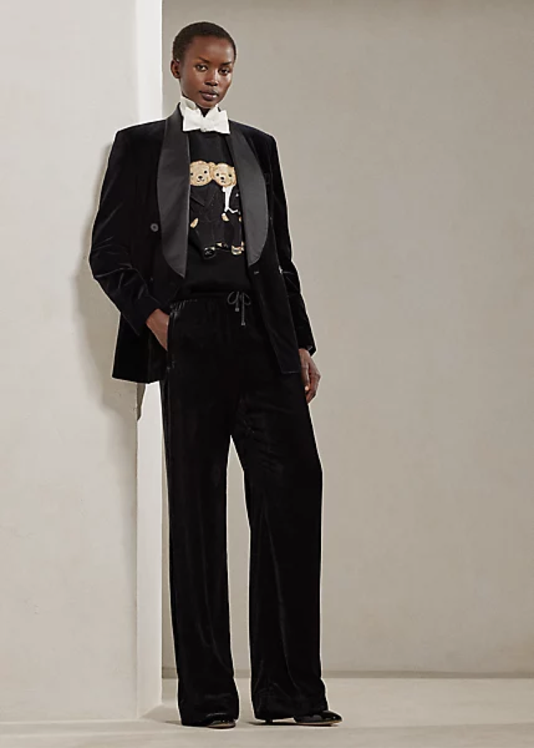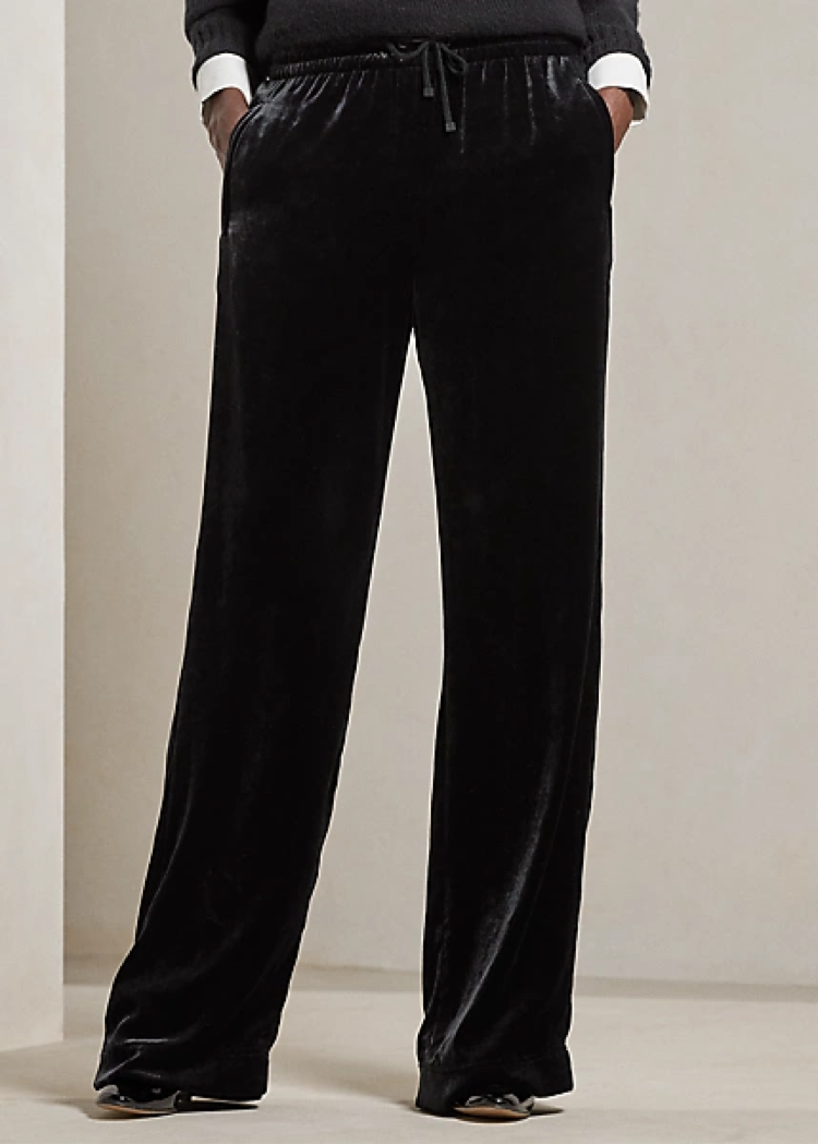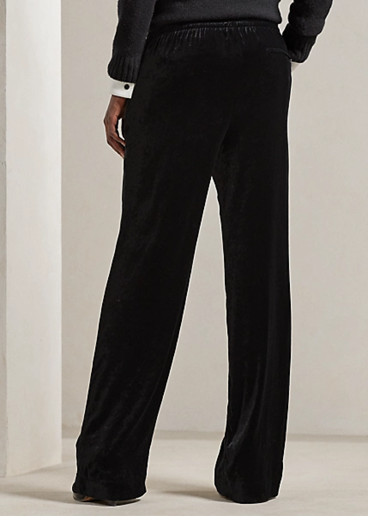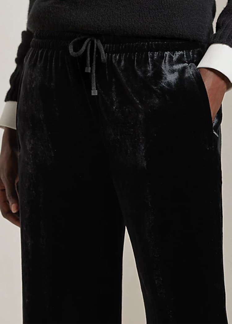 Брюки свободного кроя, подходящие для дневного или вечернего образа, имеют удобный эластичный пояс с замшевым шнурком и эластичную бархатную ткань, которая отличается струящейся драпировкой и потрясающим блеском.
