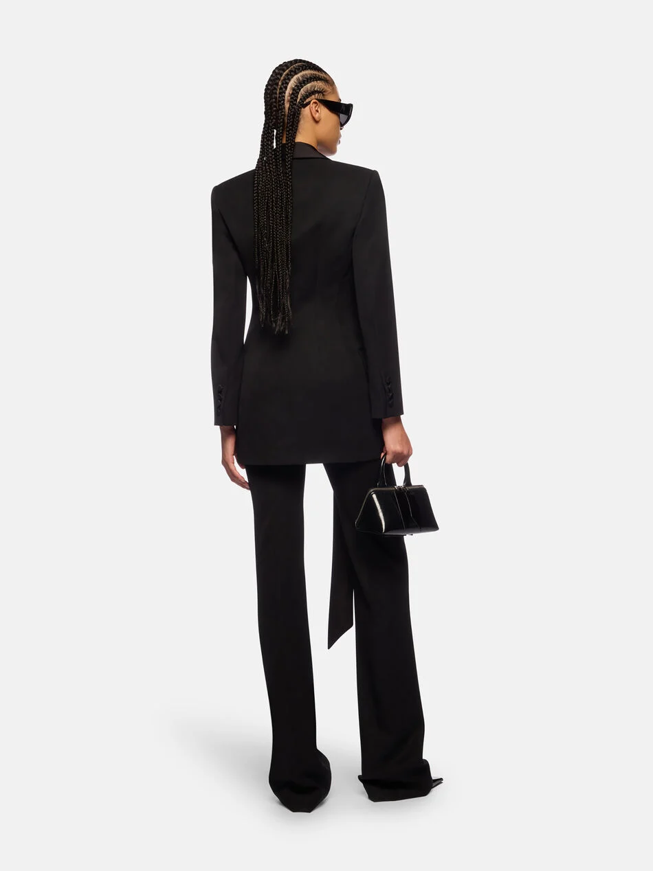 Длинные брюки из черного шерстяного габардина.