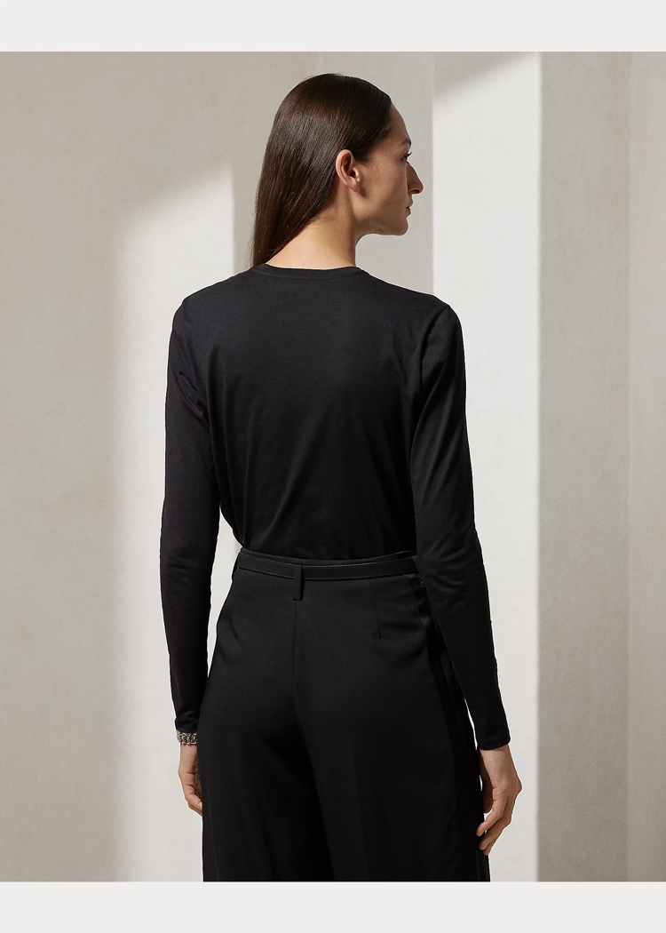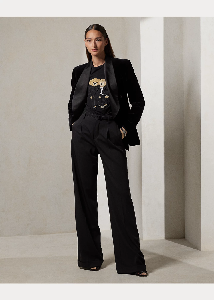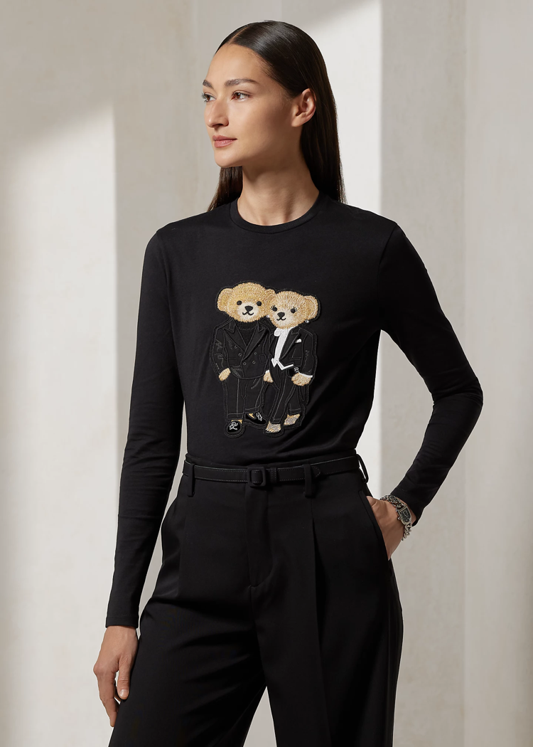 На этой футболке с длинными рукавами демонстрирующей первую нашивку Polo Bear для пар, изображены два медведя Polo в традиционных смокингах — образ, вдохновленный фотографией мистера Лорена рядом с его женой и музой Рикки Лорен. Команда из пяти технических специалистов использовала сочетание техник вышивки и коллекцию высококачественных материалов, чтобы создать индивидуальный образ каждого медведя. На одном из медведей свитер с высоким воротником и резьбовыми деталями, шерстяной смокинг из баратеи с шелковыми лацканами из фая и бархатные лоферы с фирменной монограммой Ральфа Лорена. Другой медведь одет в строгий фрак с носовым платком, строгий жилет из хлопкового пике, хлопковую рубашку с воротником-стойкой, галстук-бабочку из стираного шелка и небольшую сумку с фирменной монограммой Ральфа Лорена. Дополнительные детали, в том числе отдельно стоящие элементы и серьги со стразами, придают мишкам трехмерный эффект. Эта футболка с длинными рукавами изготовлена из хлопкового джерси и украшена вышивкой с надписью «Ralph Lauren».
