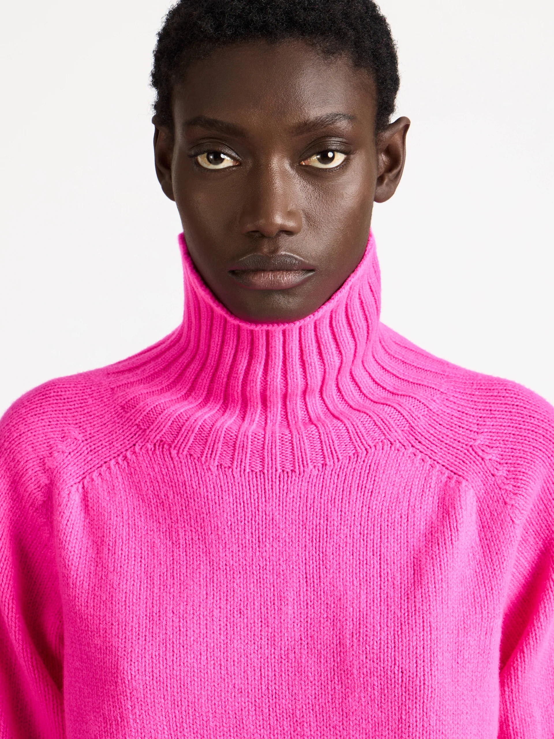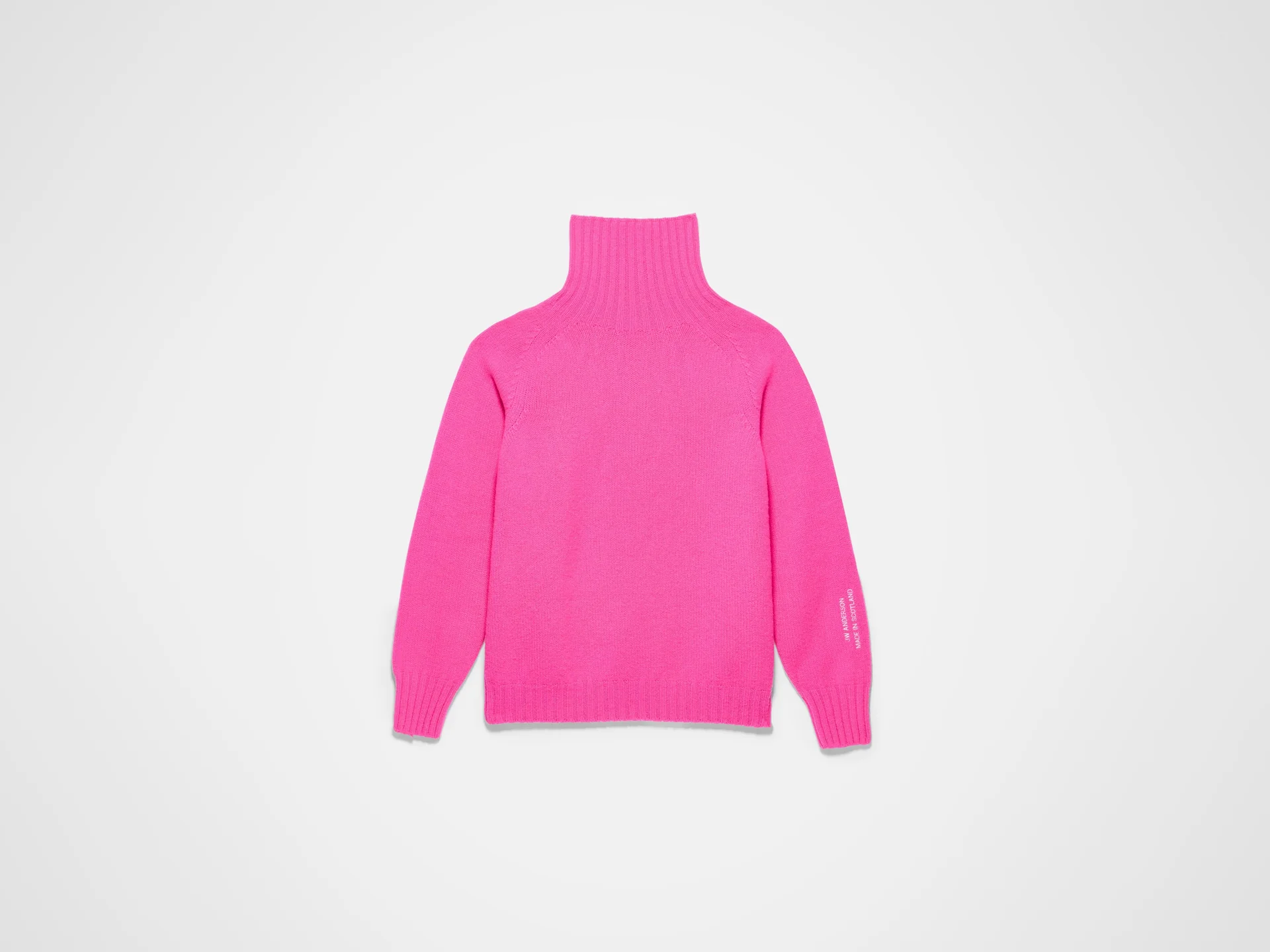 Свитер с высоким воротником из неоново-розового трикотажа средней плотности.