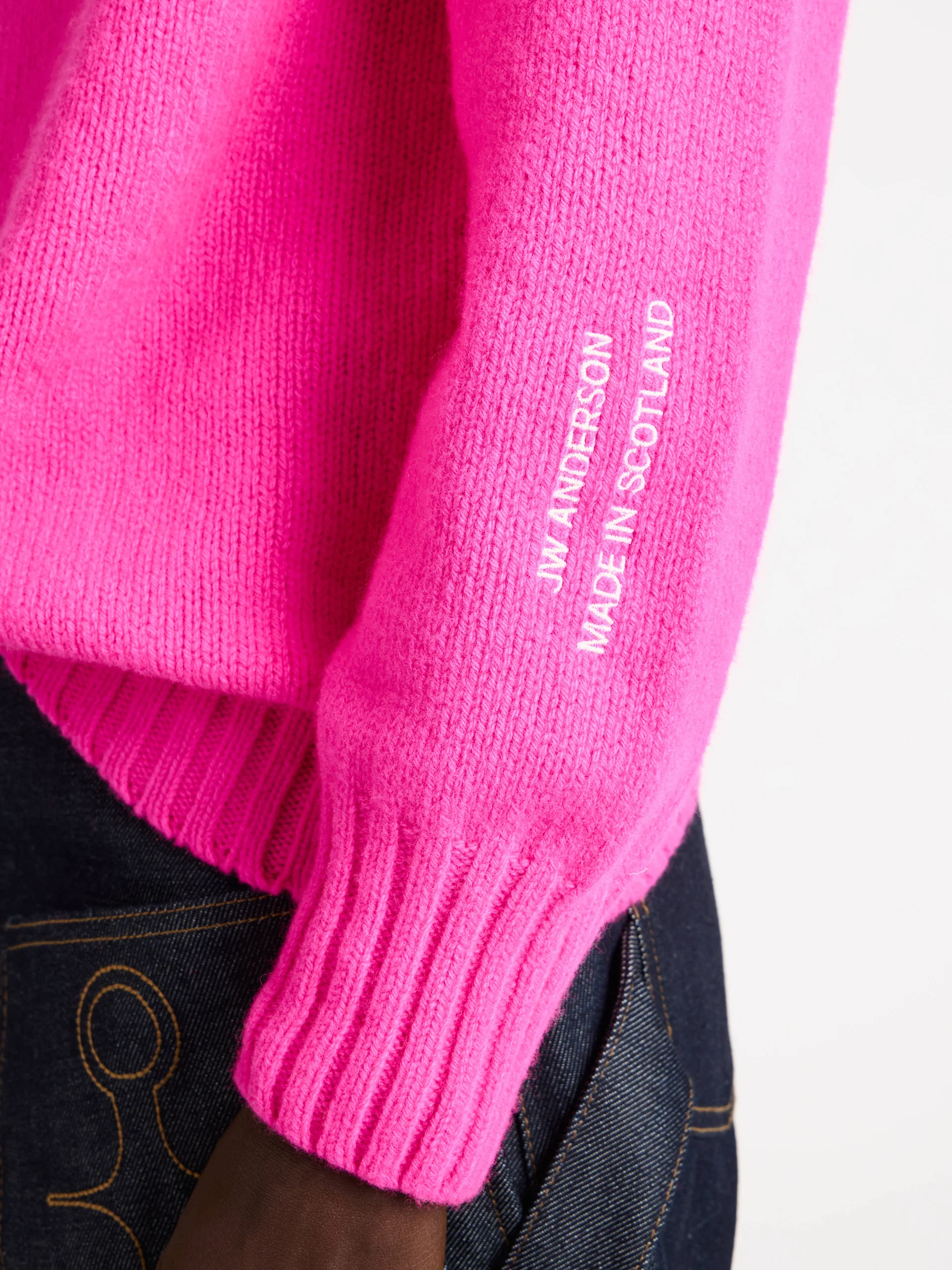 Украшен вышивкой «JW Anderson made in Scotland» на рукаве и ребристой отделкой.