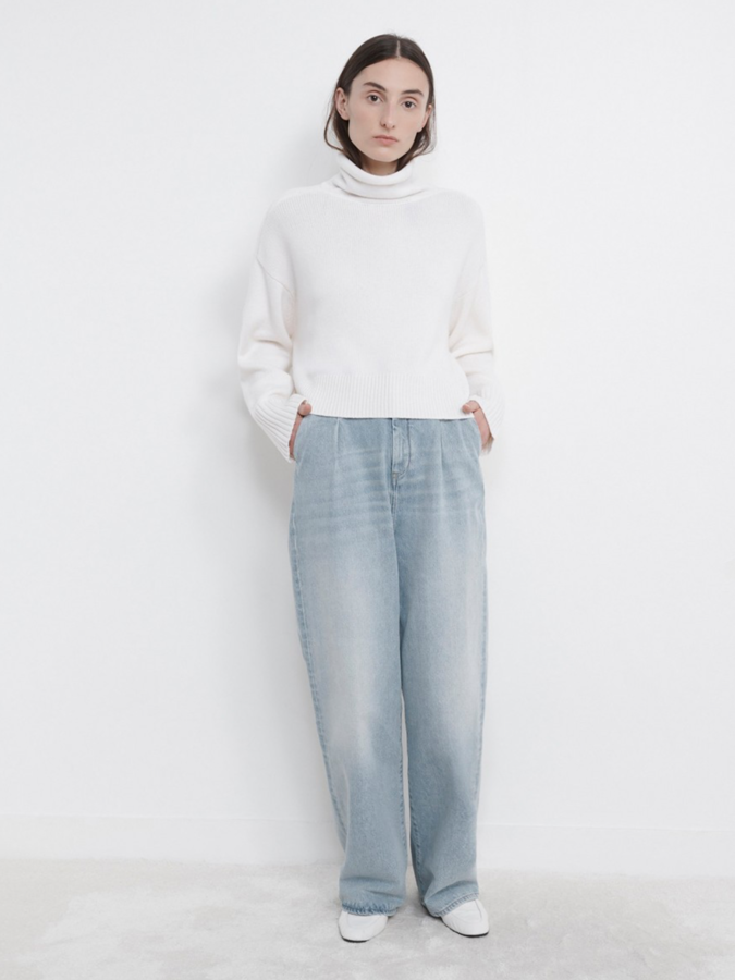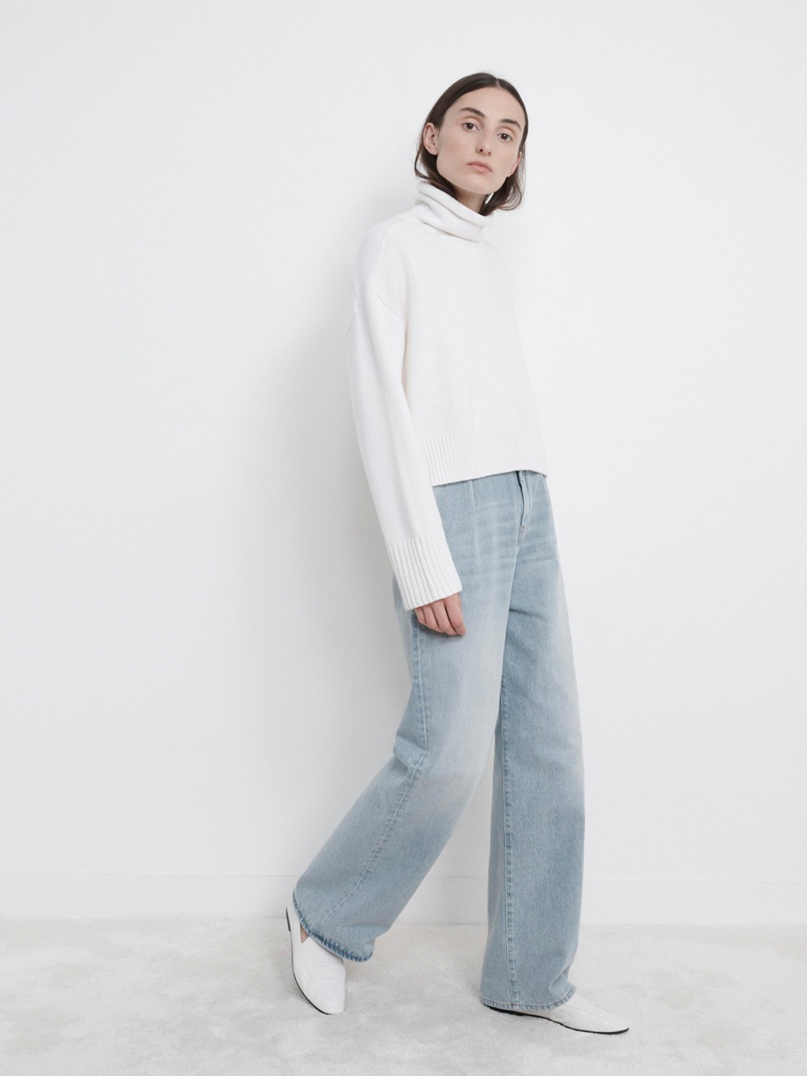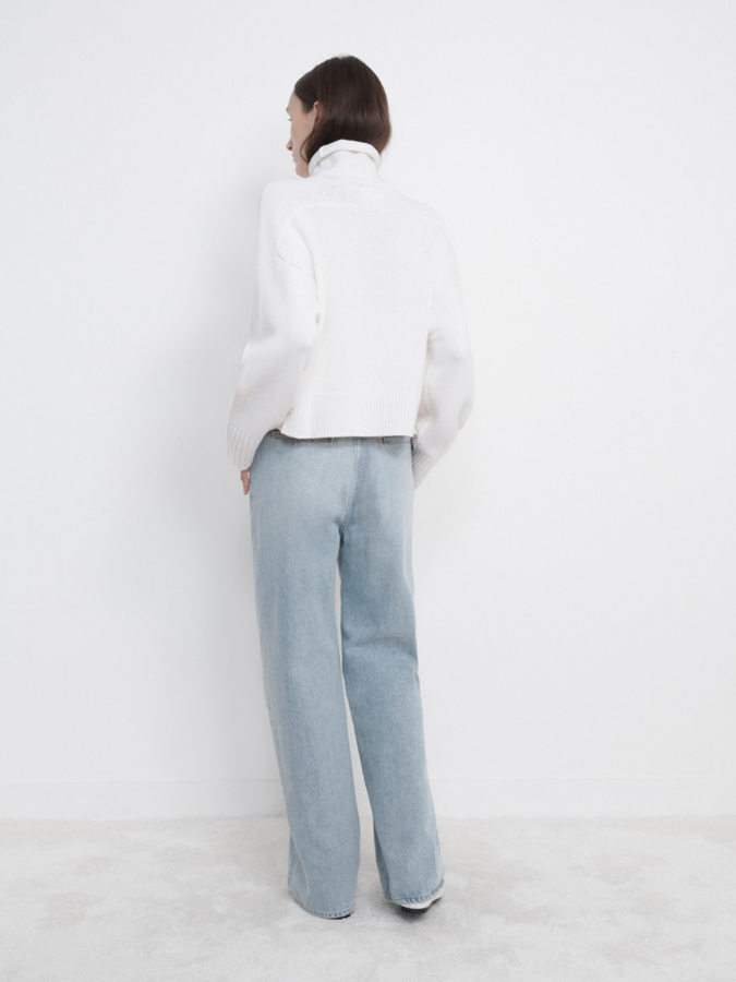 Свитер — классическая вещь Loulou Studio, выполненная из мягкой смеси шерсти и кашемира. Свободный крой, слегка укороченный крой, высокий воротник, ребристыми краями и фирменной морской ракушкой Loulou Studio, вышитой в нижней левой части.