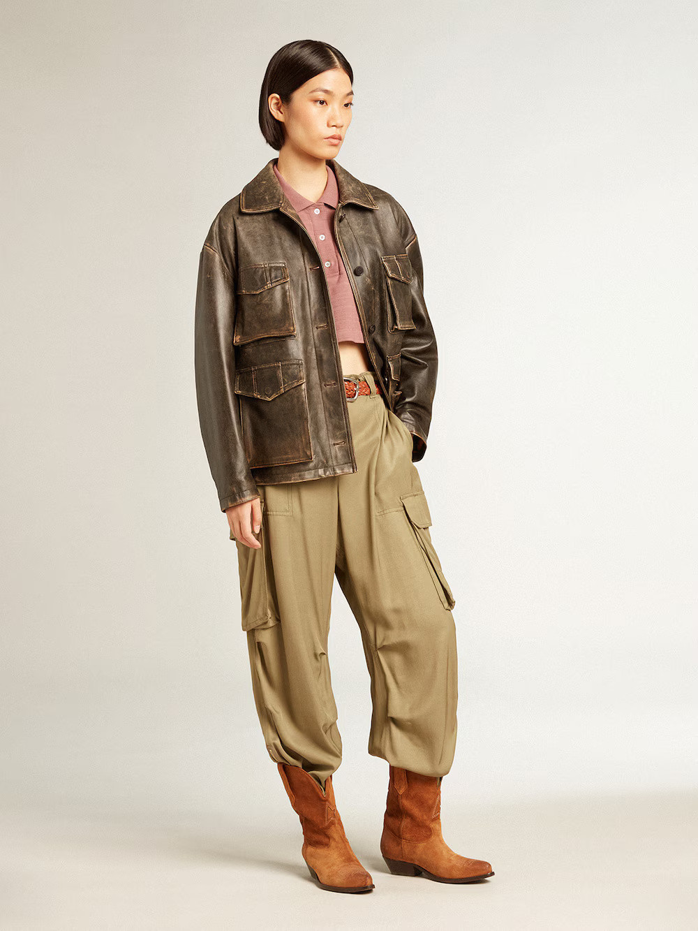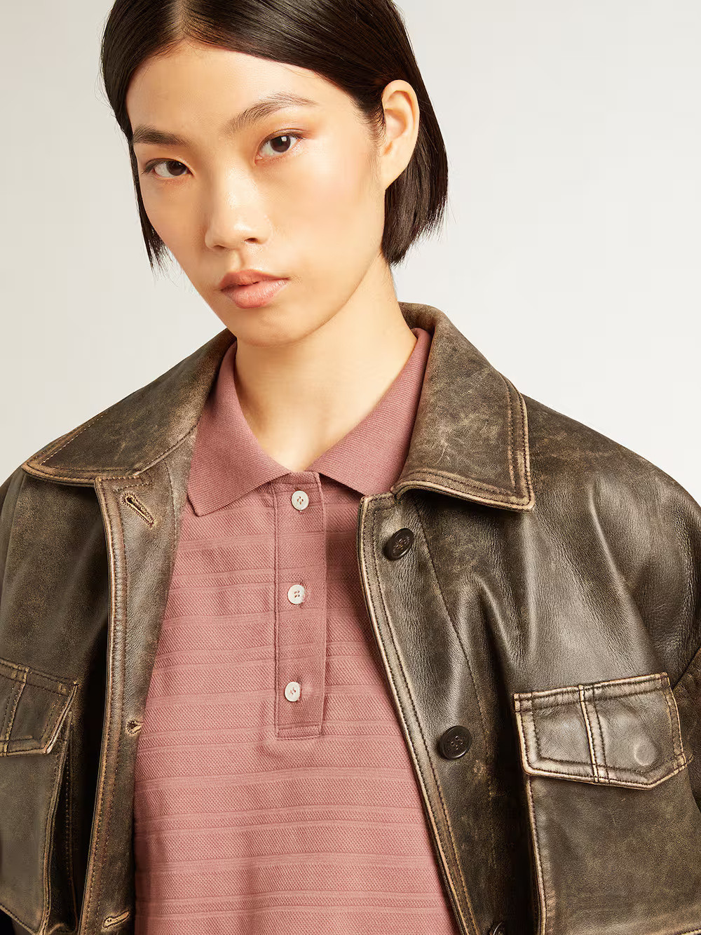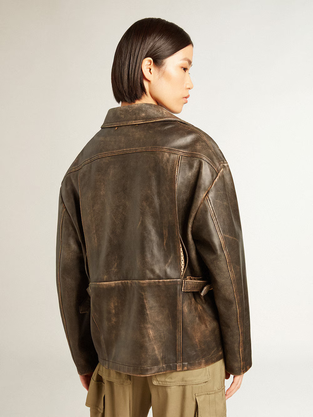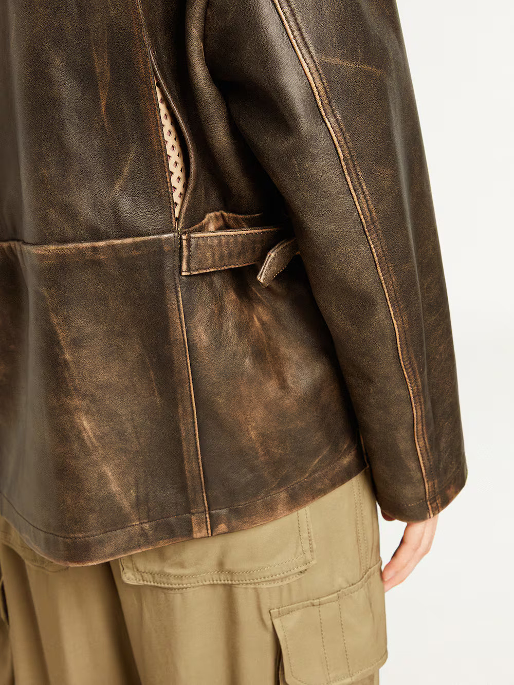 Эта коллекция Journey отражает суть и красоту повседневных моментов в Городе огней, погруженном в завораживающую атмосферу, пульсирующей душой которой являются близость, подлинность и любопытство. Куртка из состаренной коричневой кожи наппа с регулируемым ремнем, потертой отделкой и четырьмя карманами спереди.