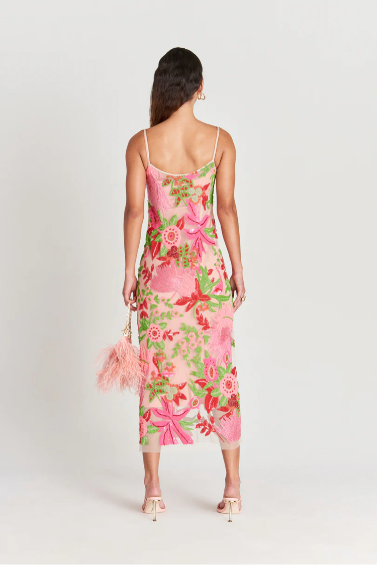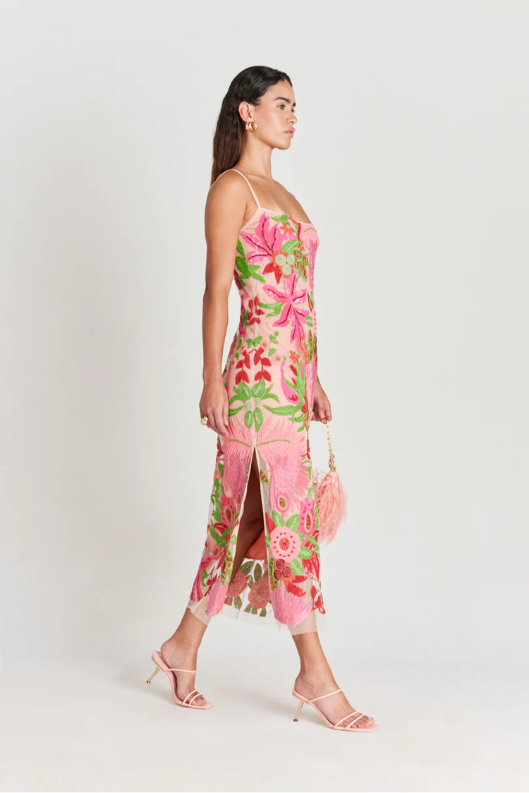 Платье Kennedy Gown яркого цвета La Selva, созданное из уникальных растительных узоров из разноцветных стеклянных бусин. Абсолютно элегантное платье длиной до щиколотки имеет более светлую внутреннюю часть, но все же прекрасно сочетается с платьем-комбинацией темно-розового оттенка, скрывающим прозрачную внешнюю сторону, расшитую бисером. Потайная молния сбоку и разрезы по обеим сторонам юбки позволяют легко надевать и снимать платье, бретельки нерегулируемые. Сетчатая отделка с необработанным краем не осыпается, но придает кромке естественный край.