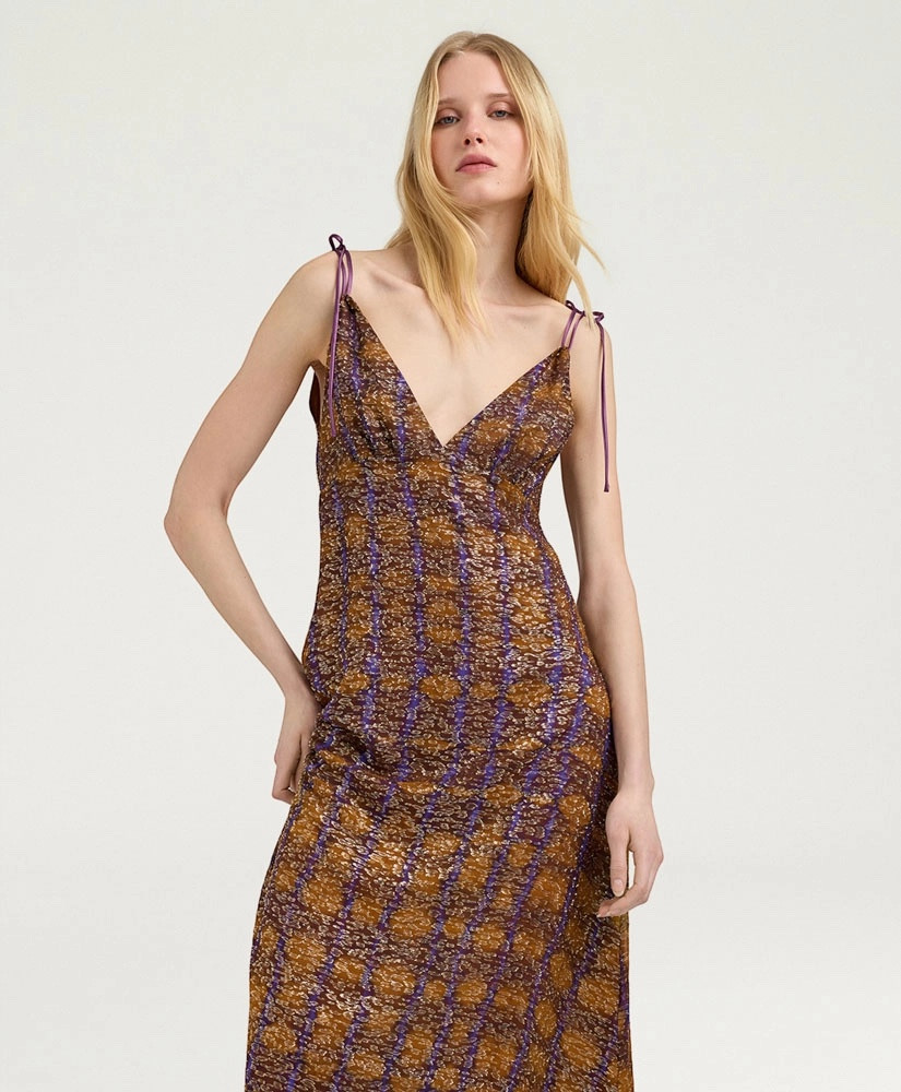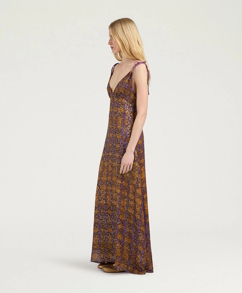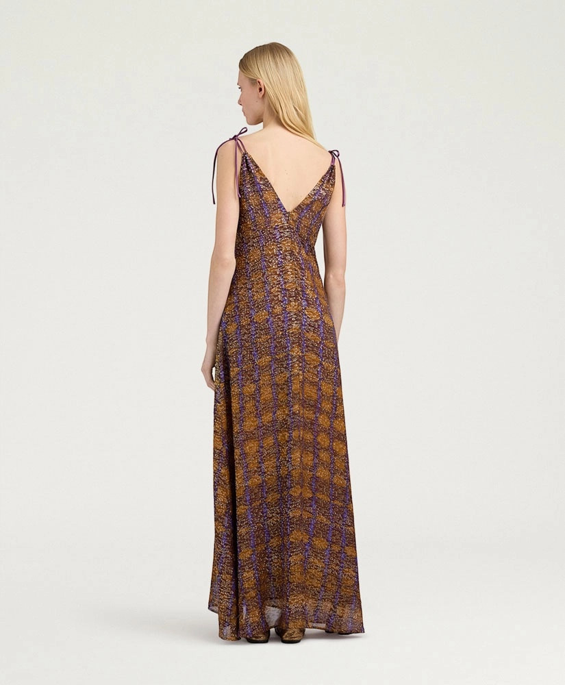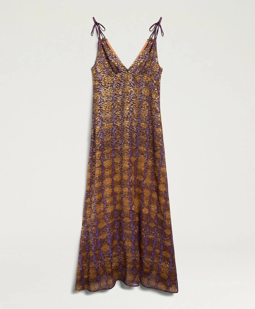Длинное платье-комбинация из блестящего вискозного/люрексового жоржета с принтом. Сборчатый скользящий топ-халтер с двойными атласными завязками и облегающая расклешенная юбка делают Dulce платьем, которое произведет фурор летом, позволяя вам блистать на мероприятии или просто почувствовать себя неповторимой. V-образный вырез на спине. Полностью на подкладке.