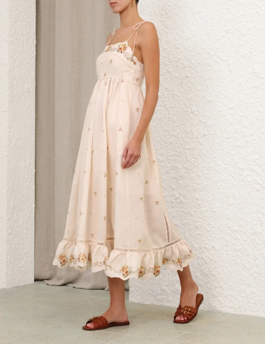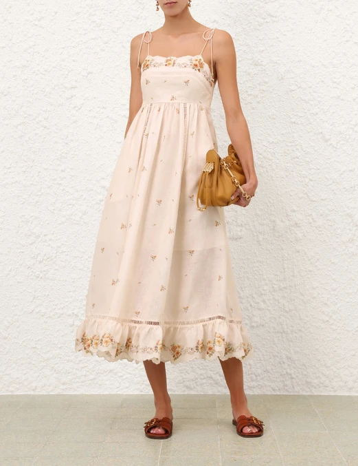 Льняное платье-миди с прямым вырезом, завязками на бретелях и функциональными боковыми карманами, застежкой-молнией по центру спины и плиссированной юбкой.