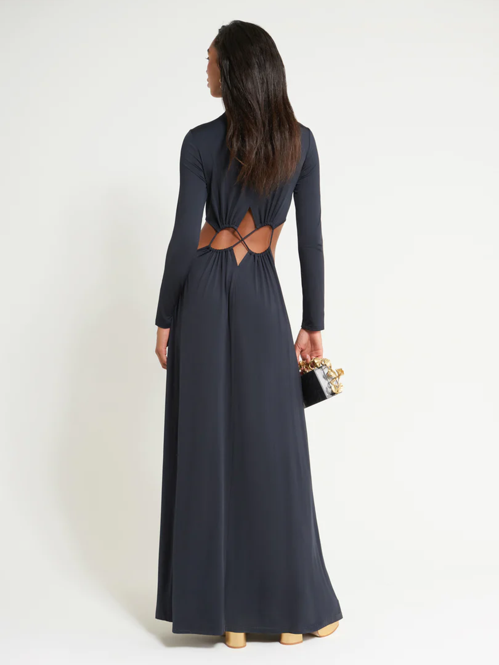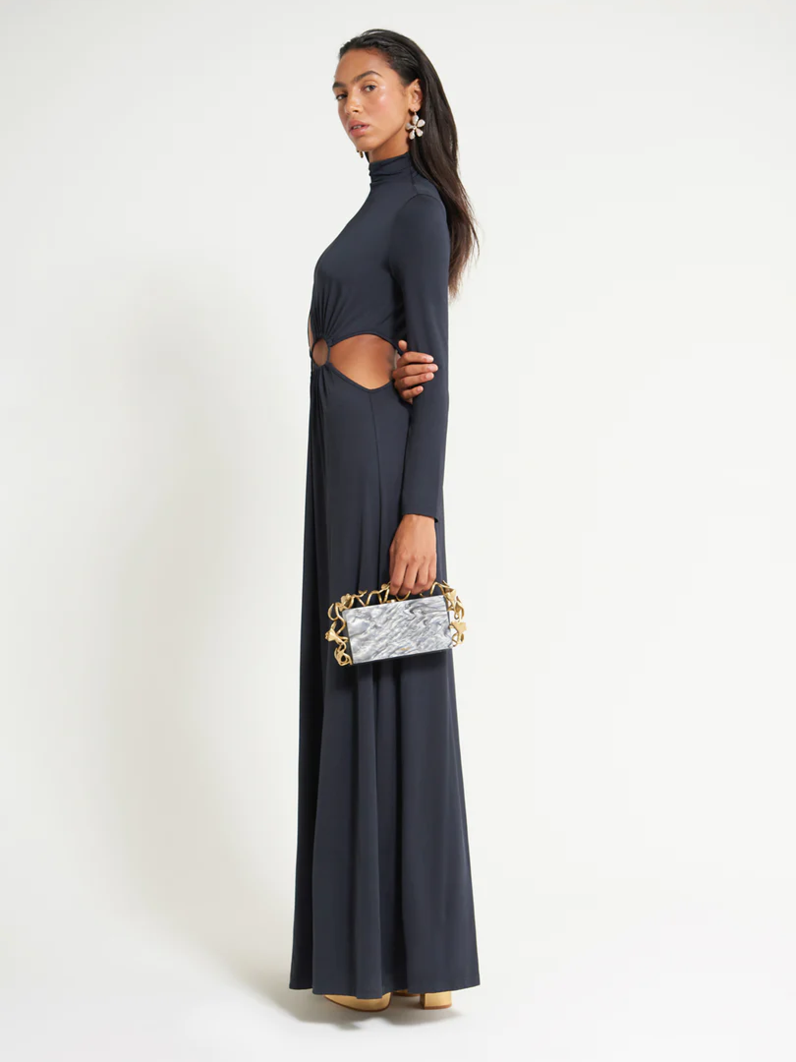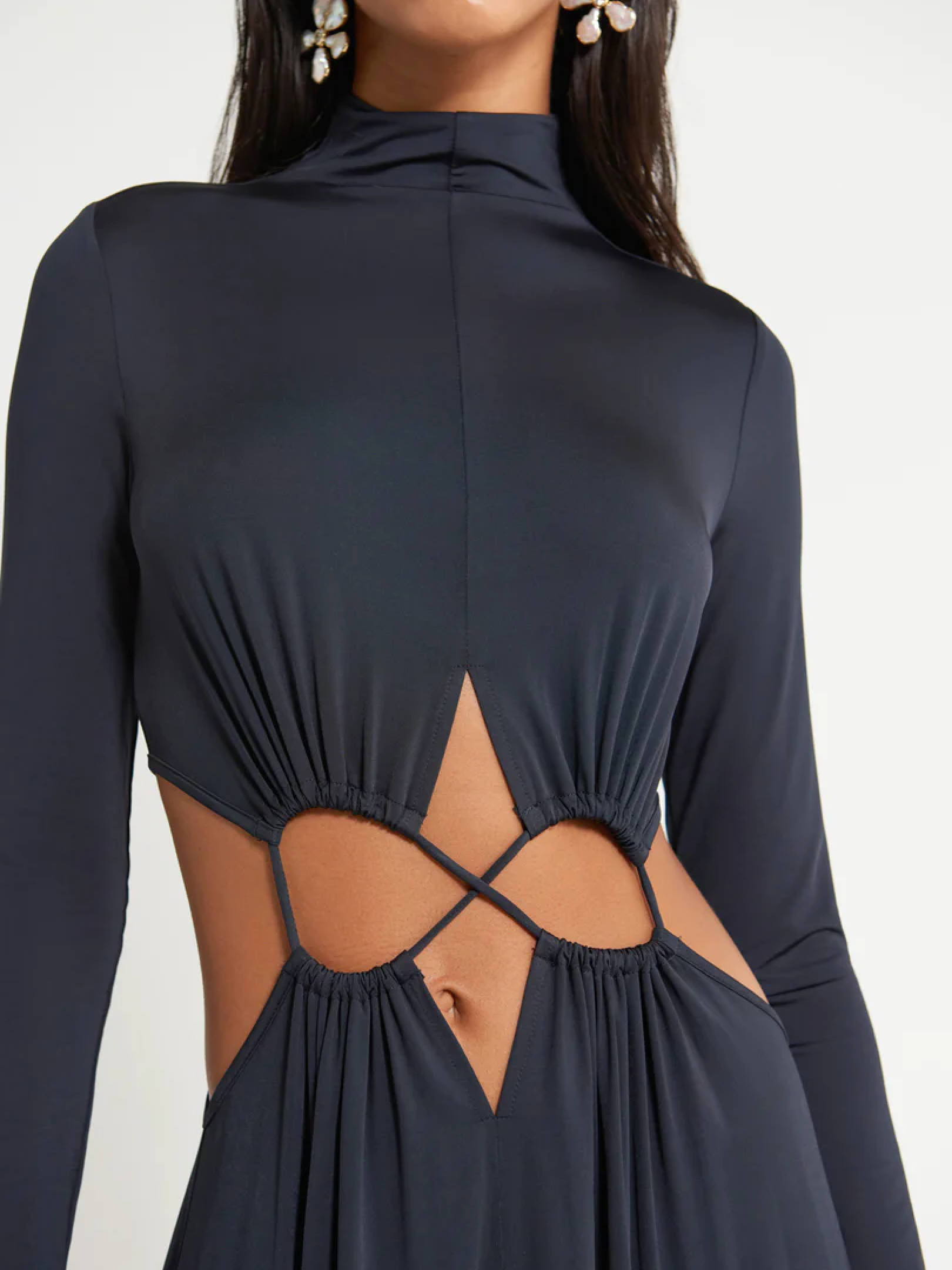 Pippa — это приподнятое платье макси-длины с вырезом в форме восьмерки на талии, соединяющим верх и юбку. Гладкая трикотажная ткань юбки с высоким воротником-стойкой и длинными рукавами создает соблазнительную подвижность, которая дополняет облегающие длинные рукава.