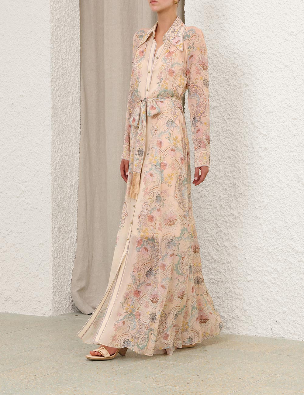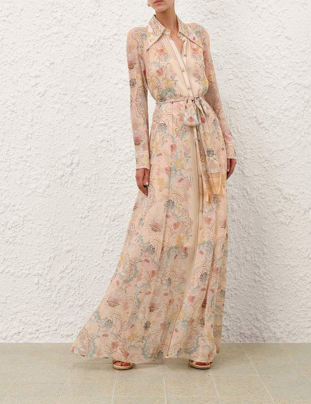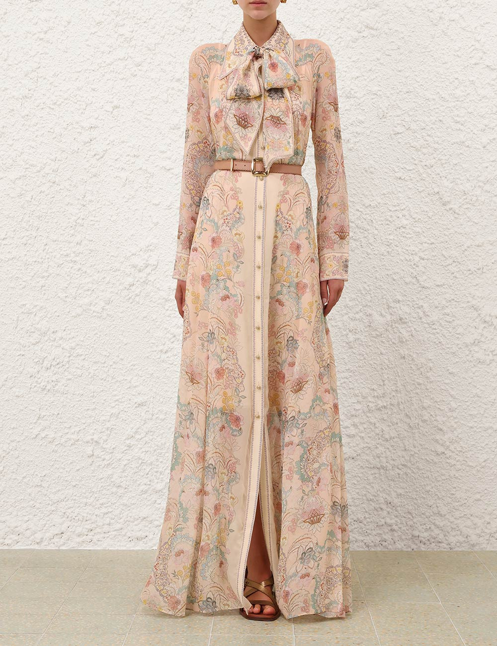 Длинное платье-макси с рукавами, классическим воротником, бантом и пуговицами по центру спереди.