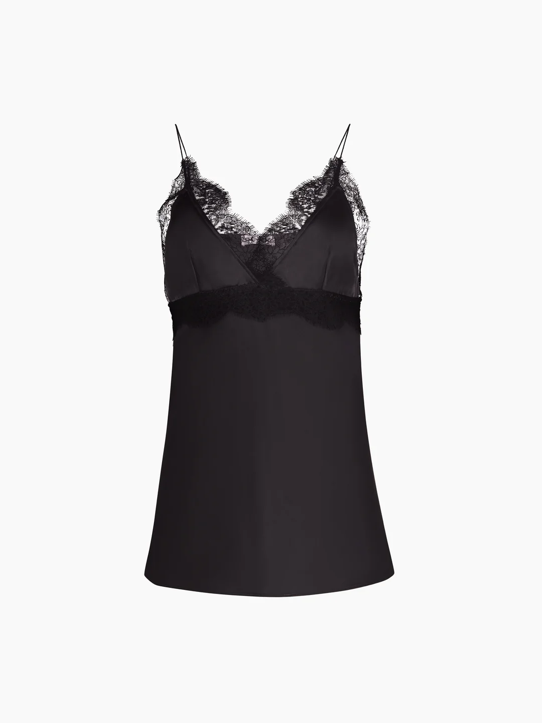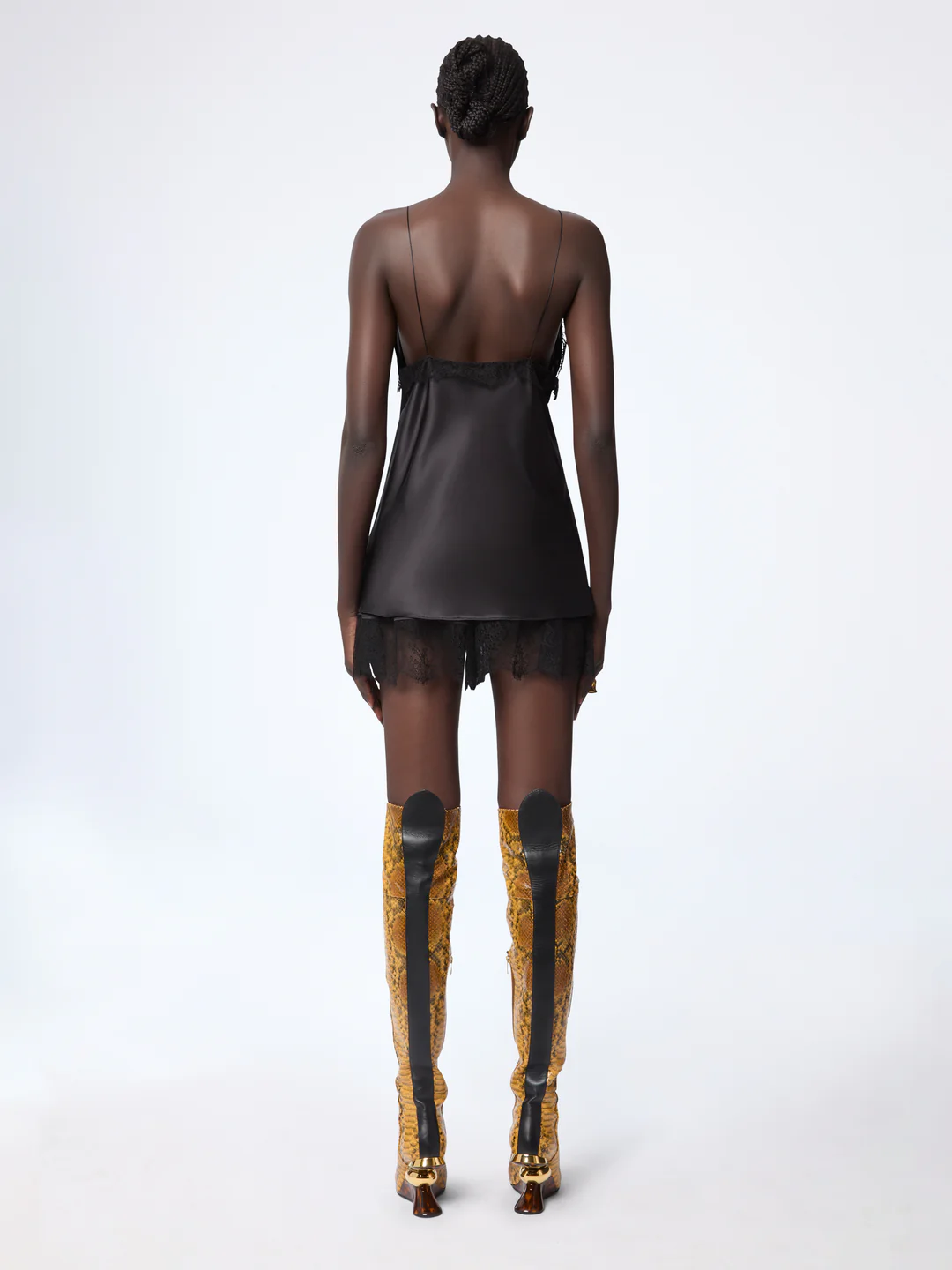 Черный шелковый атласный топ имеет глубокий V-образный вырез, обрамленный нежным кружевом. Силуэт, вдохновленный нижним бельем, сочетает мягкость и структуру, играя светом и тенью.