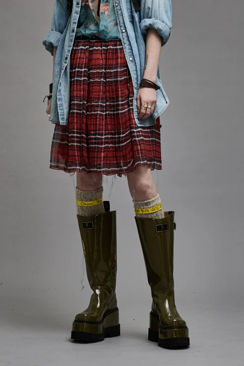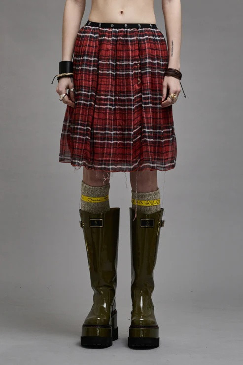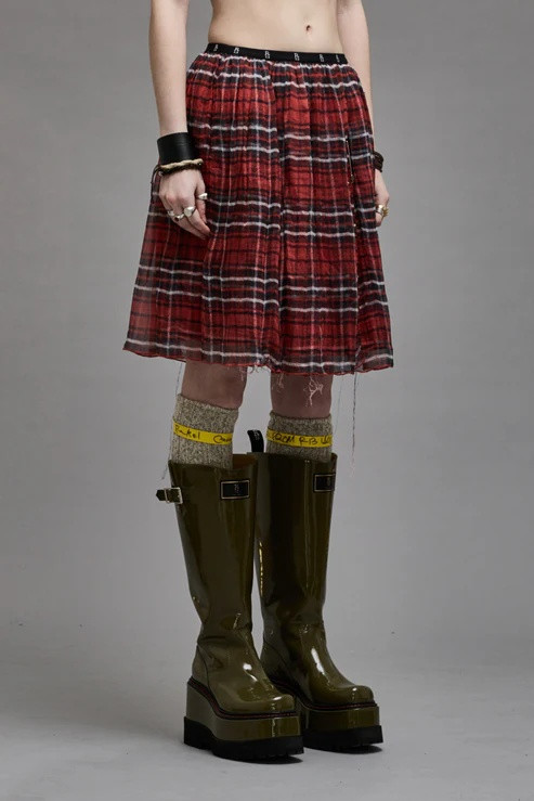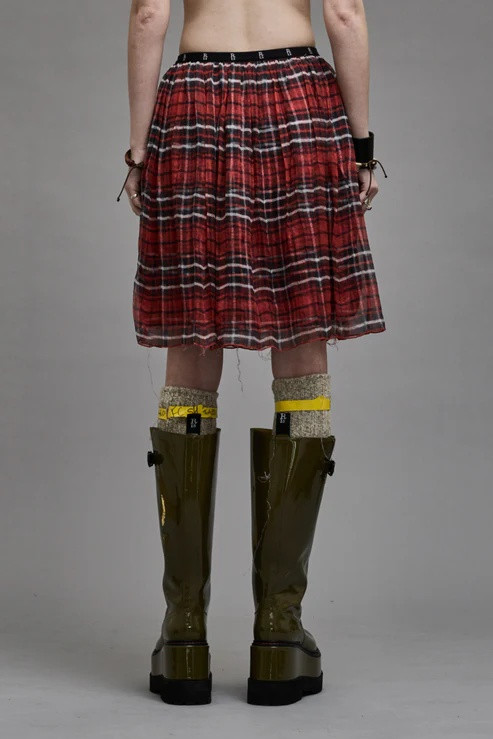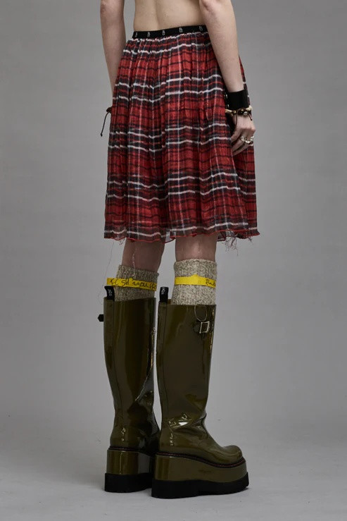 Двухслойная юбка-килт, состоящая из шелкового наружного слоя и льняного нижнего слоя, управляемых вместе эластичным поясом r13 и булавкой.