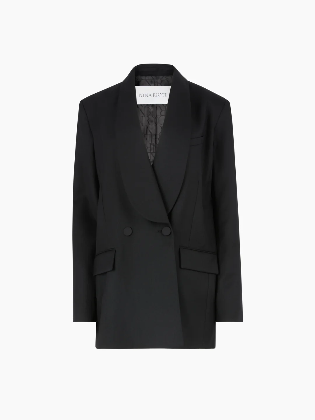 Двубортный блейзер сшитый из черной шерстяной габардины, отличается скульптурным воротником-шалью и точно выверенными линиями. Удлиненный силуэт и четкие плечи создают сильную, но в то же время плавную форму, сочетая элегантность и эффектность.