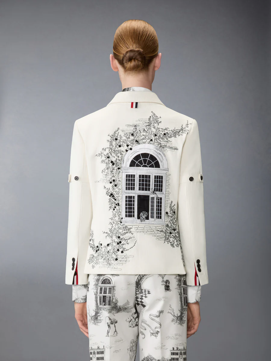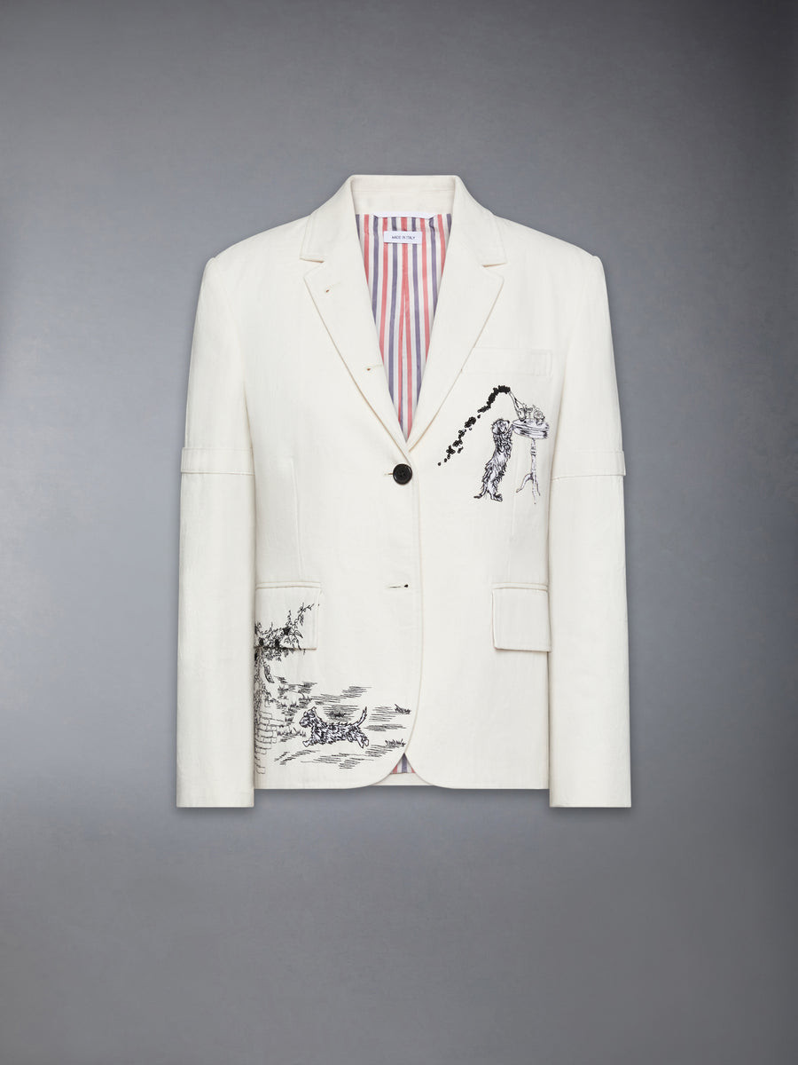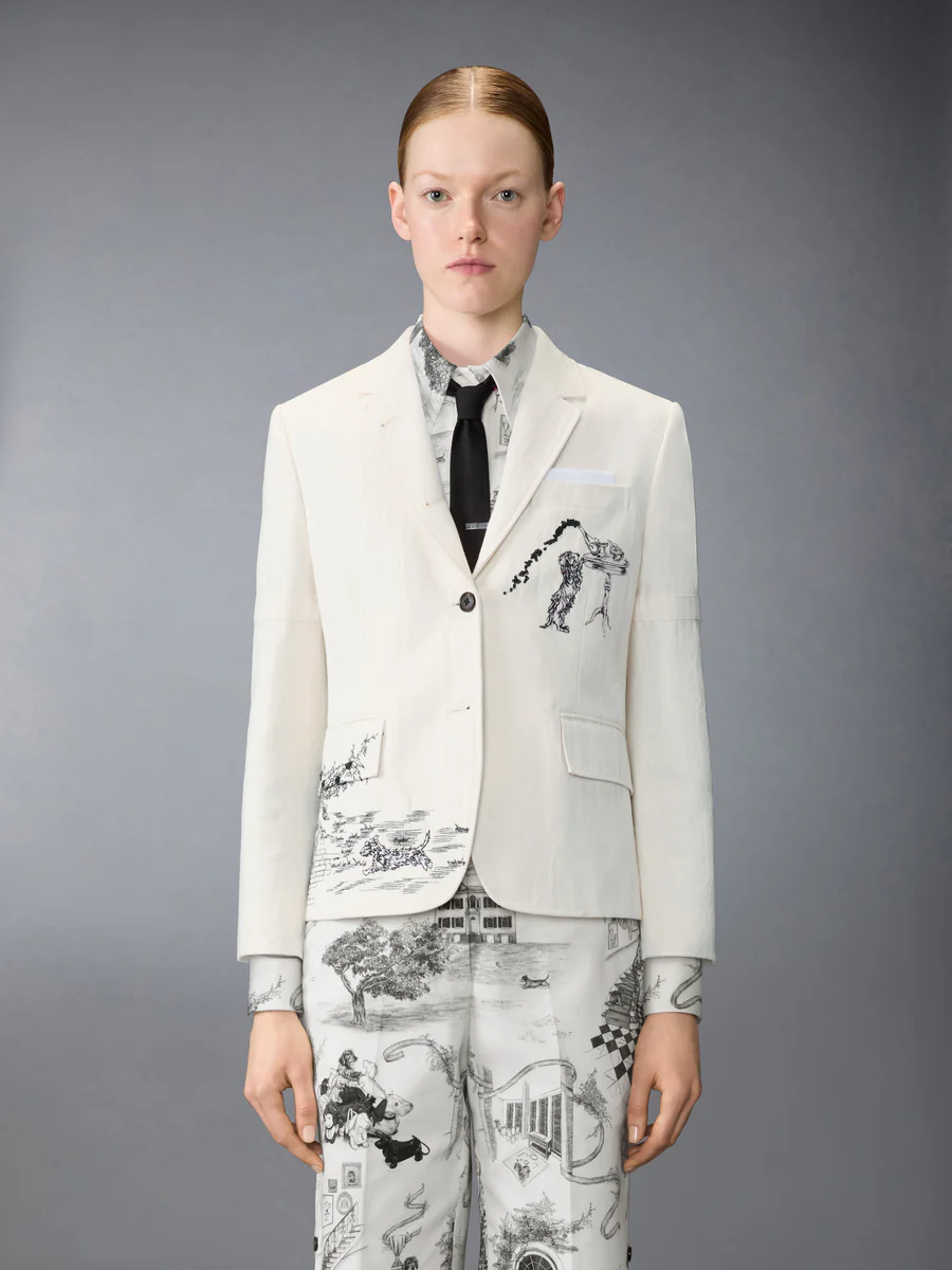 Пиджак из хлопкового холста превращает фирменный силуэт в вышитую историю, посвященную десятой годовщине бренда Hector. Серия причудливых сцен с участием любимой таксы выполнена тонкой карандашной и цепочной вышивкой, а шелковые аппликации и скопления пайеток — включая сверкающие пузырьки шампанского и цветочные акценты добавляют текстуру и объем изделию.