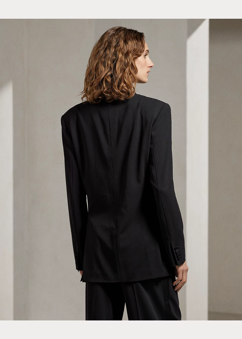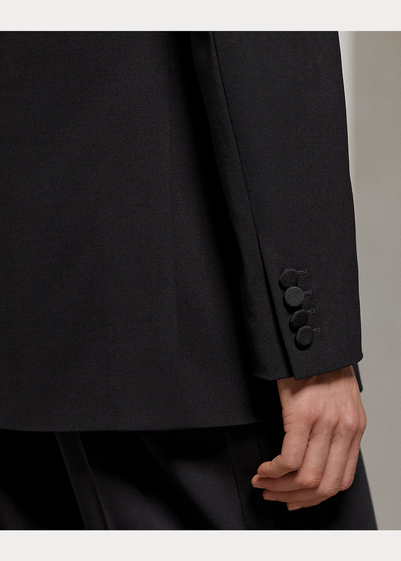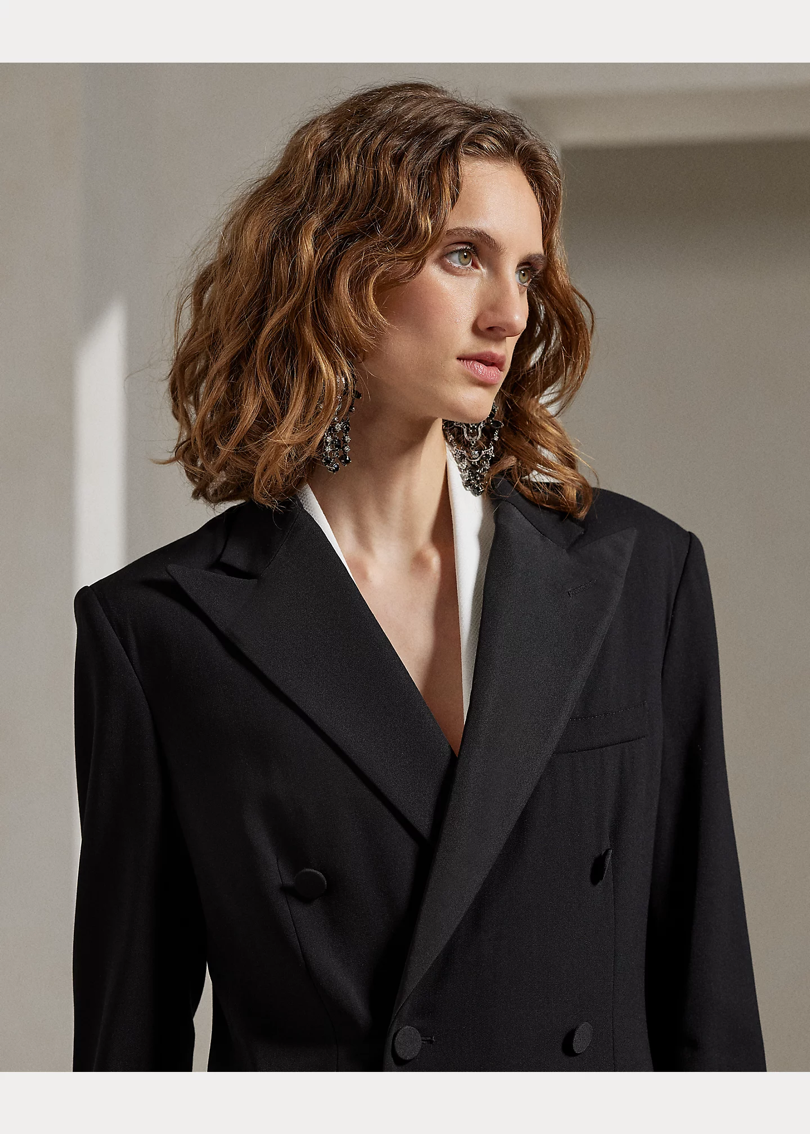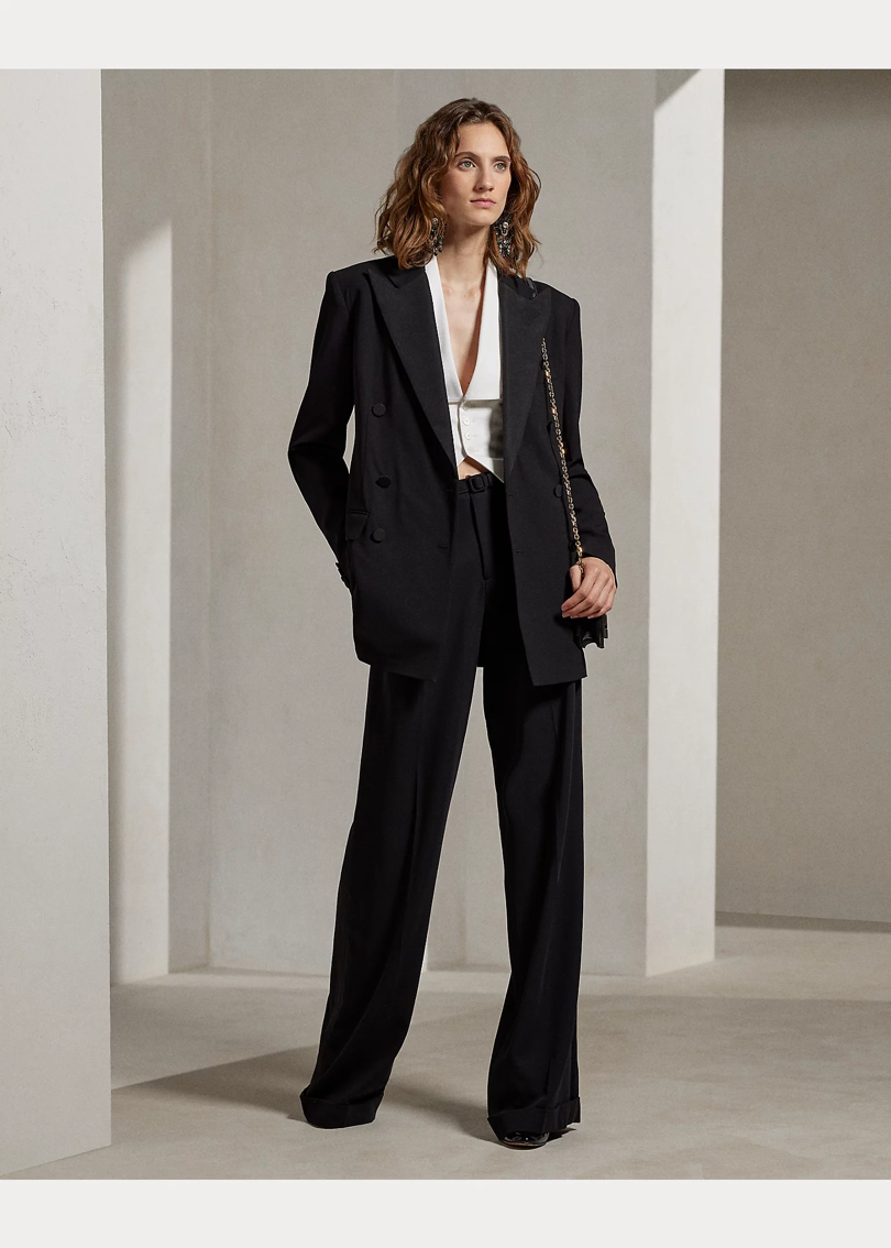 Модель Shelden изготовлена в Америке из эластичного итальянского шерстяного крепа, в этом сезоне переделана в смокинг-жакет оверсайз, о чем свидетельствуют его заостренные лацканы из шелкового фая и пуговицы, обтянутые шелковым фаем.
