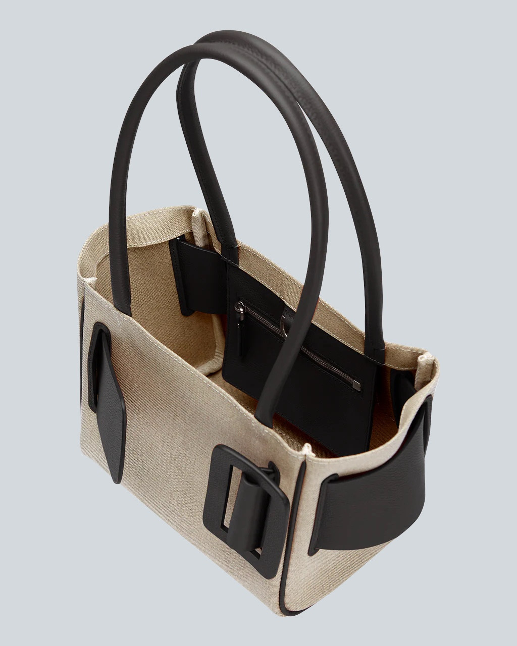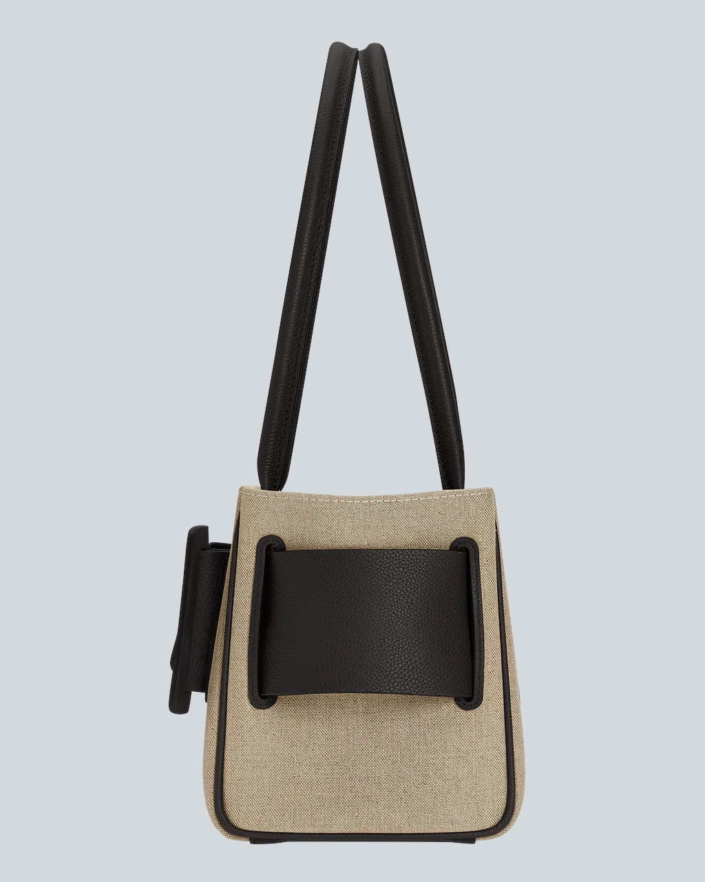 Сумка из парусины с подкладкой из парусины. Кожаная окантовка с металлической застежкой-крючком. Внутренний кожаный карман. Большая кожаная пряжка и кожаный ремень с двумя ручками для переноски.