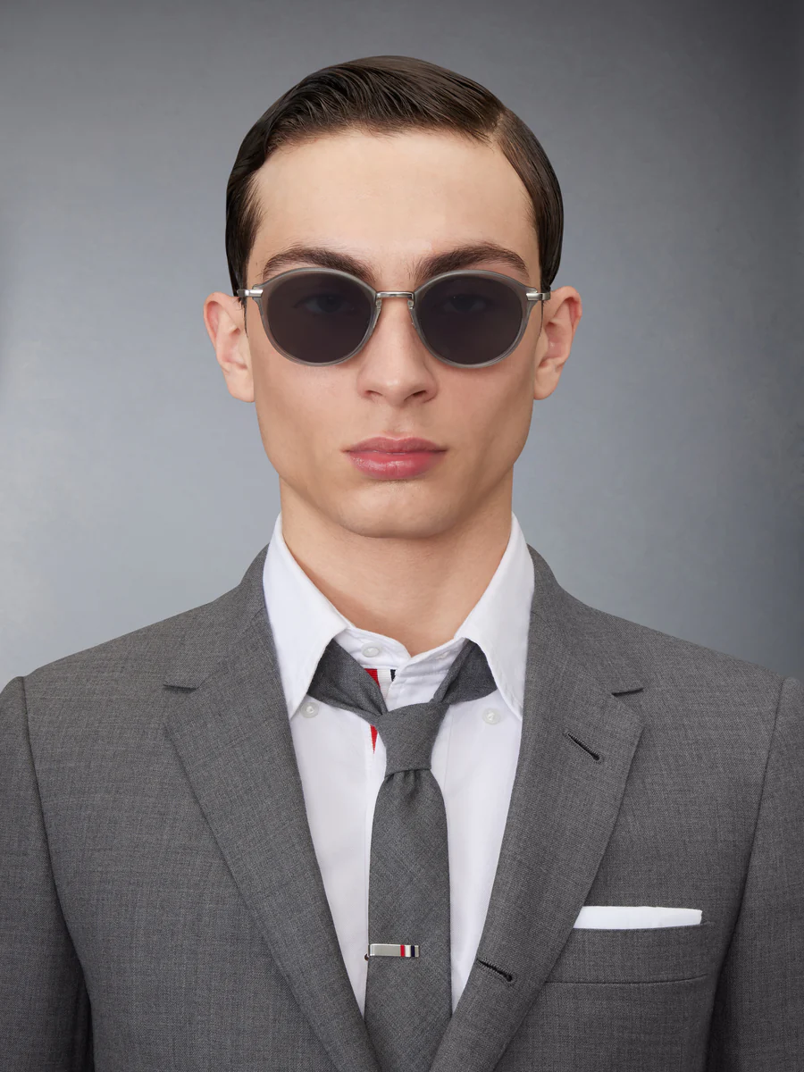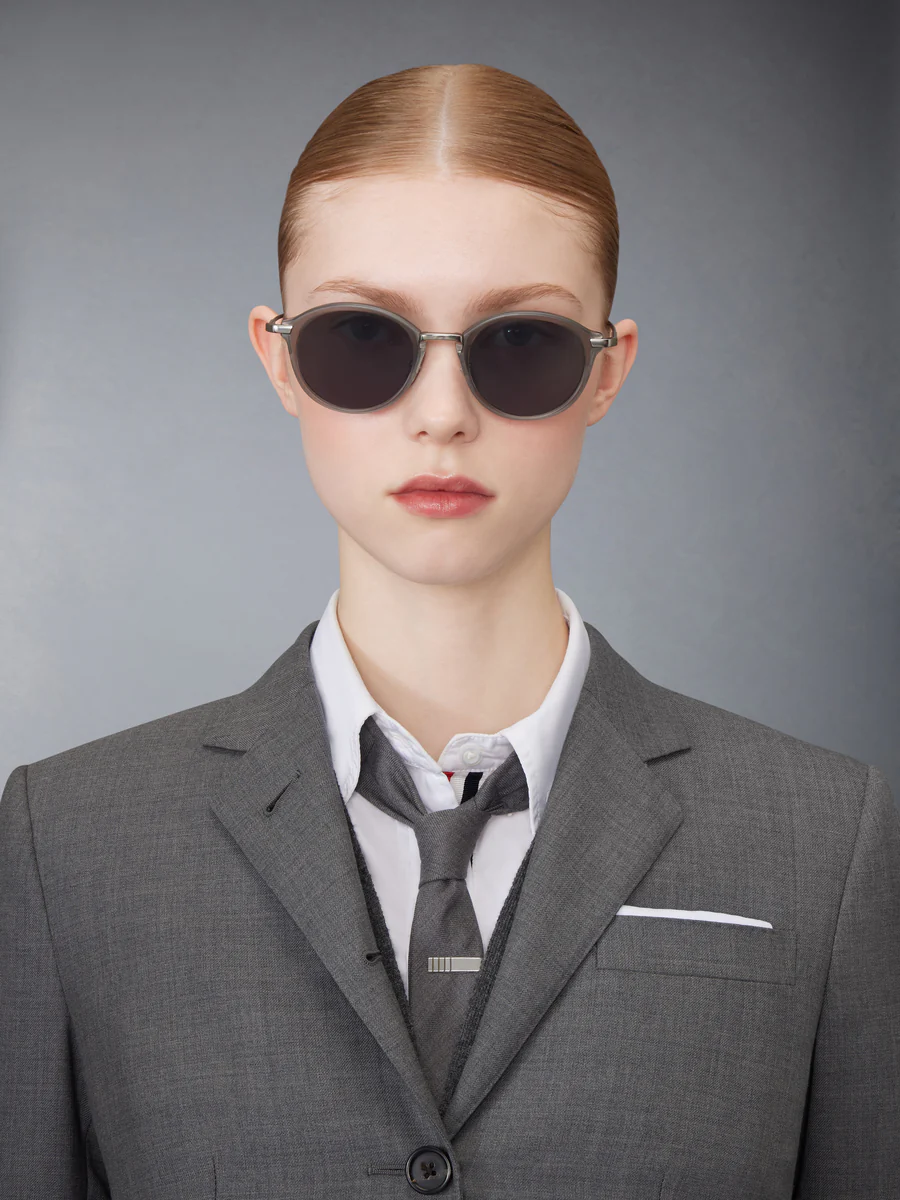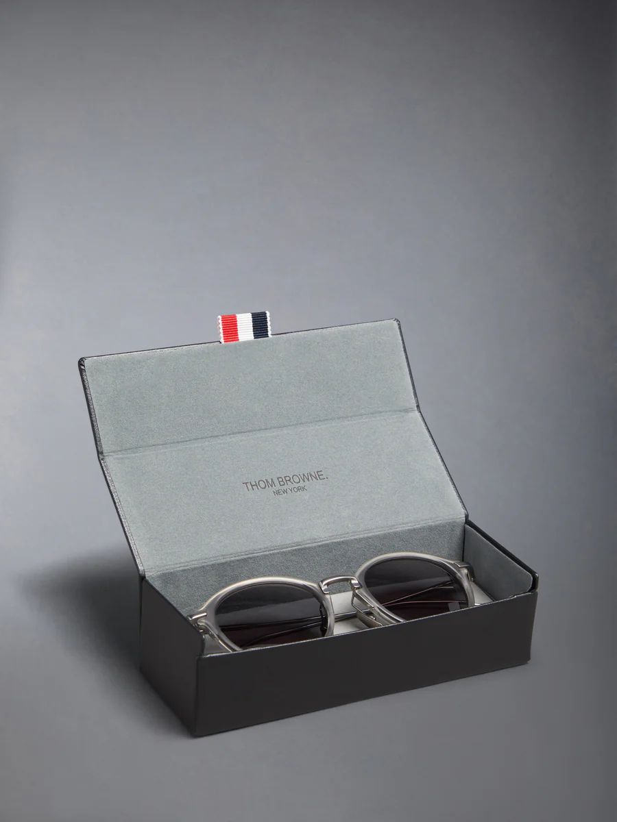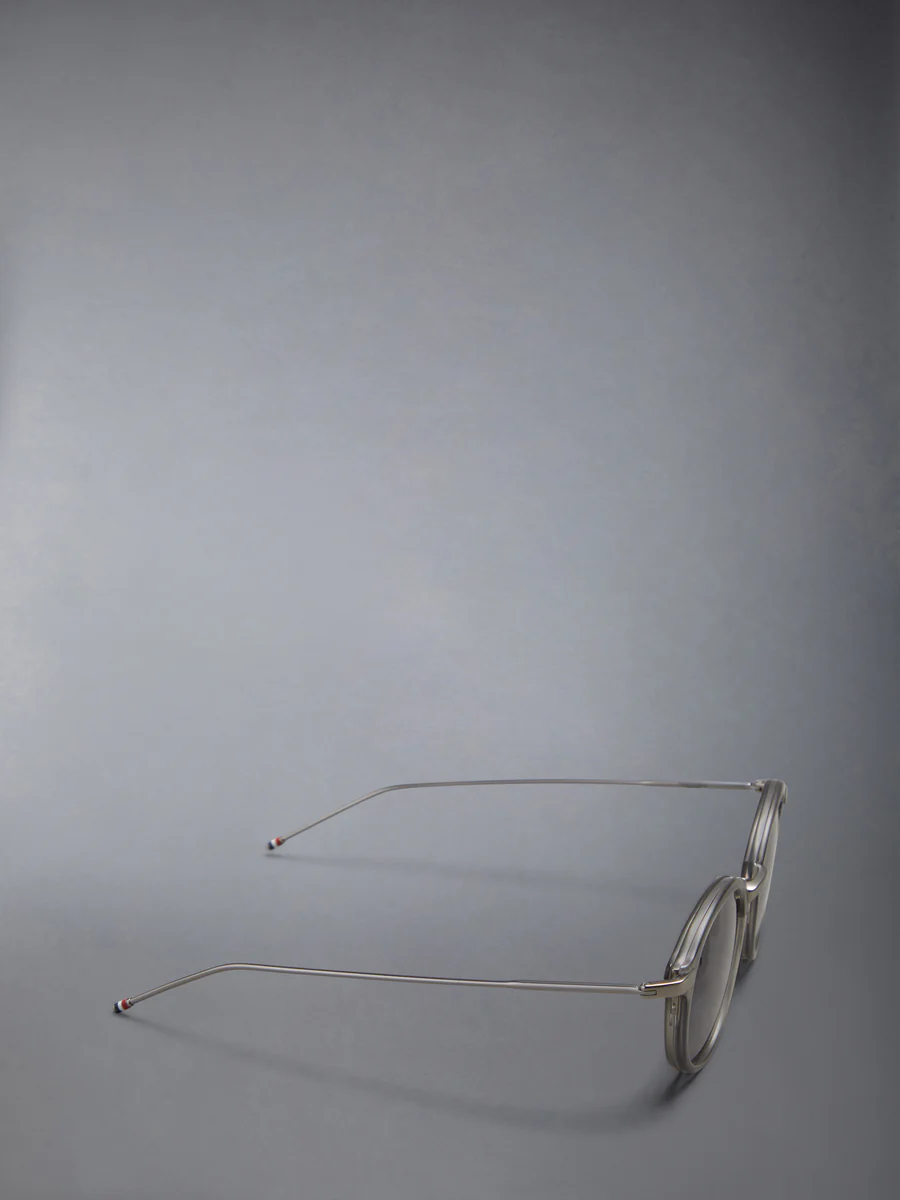 Матовый кристально-серый ацетат с черной железной пластиной. Темно-серые линзы. Круглая форма. Фирменная 4-полосная конструкция. Эмалированные заушники в полоску.