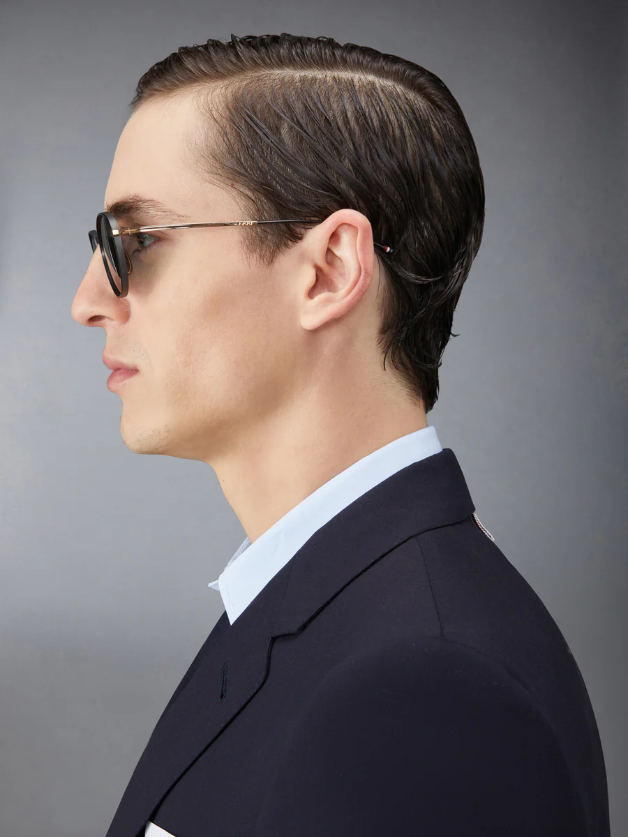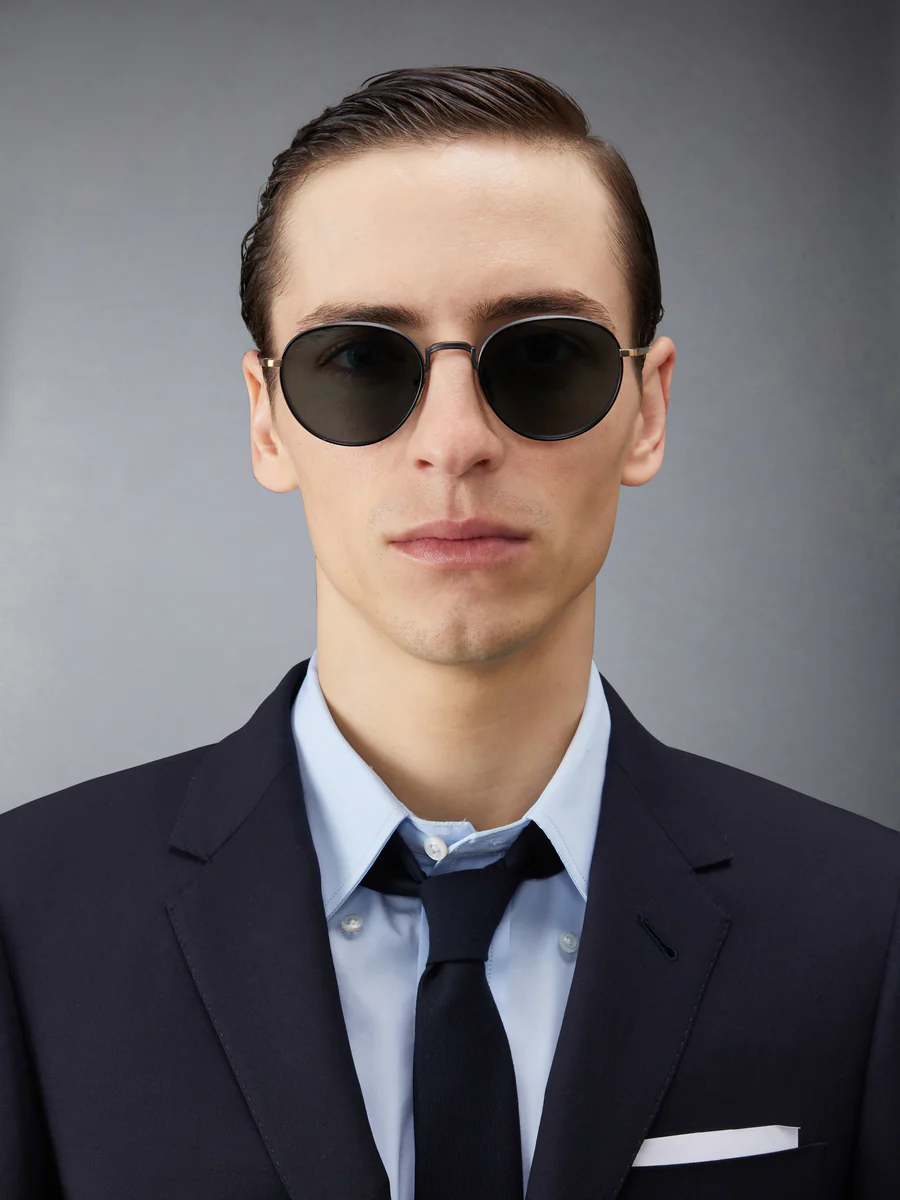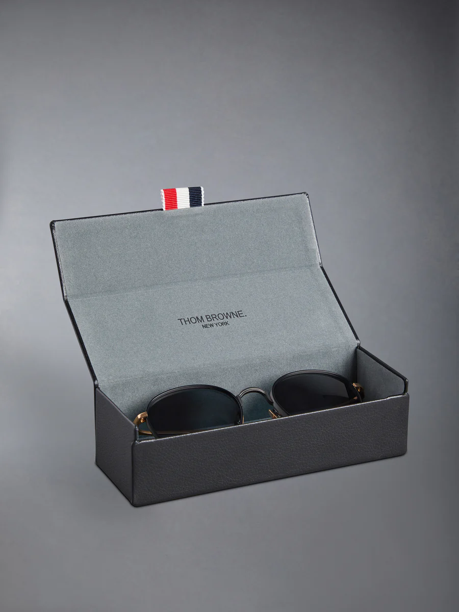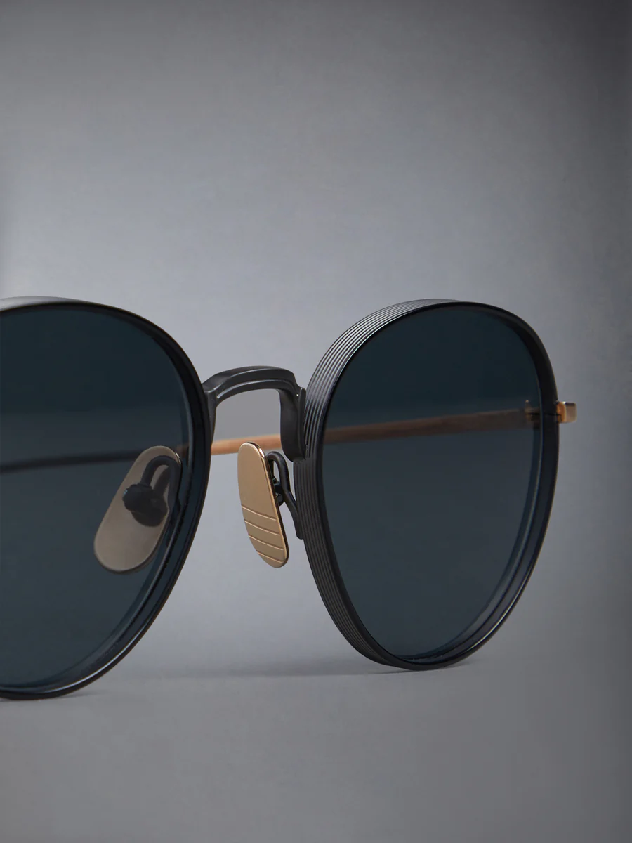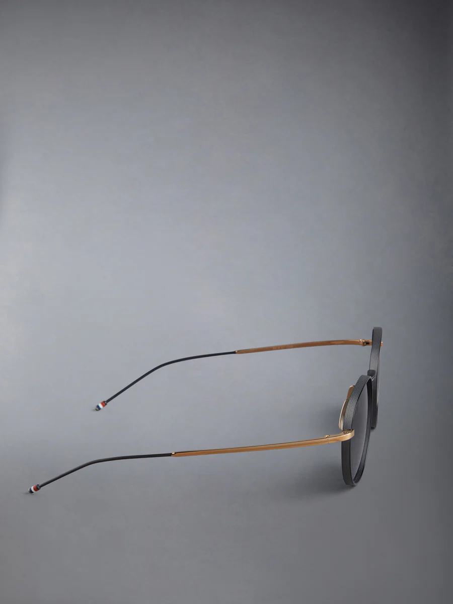 Круглые солнцезащитные очки в матово-черном цвете с отделкой под золотистый титан, линзы с черным тонированием. Текстурированная черная переносица и оправа, носовые упоры золотистого цвета, матово-черные заушники с полосатой эмалевой отделкой. Футляр из эко-кожи с фирменной полосатой петлей из грогрена на входе.
