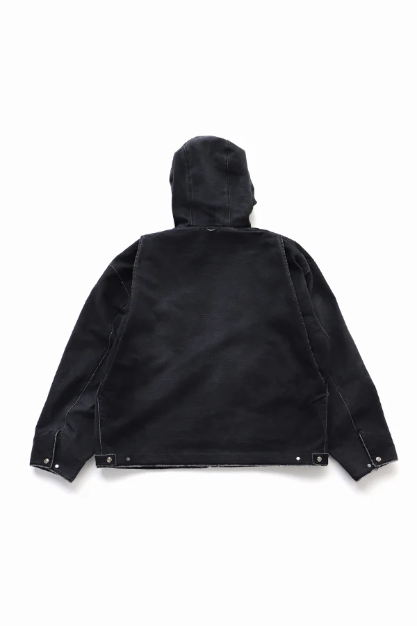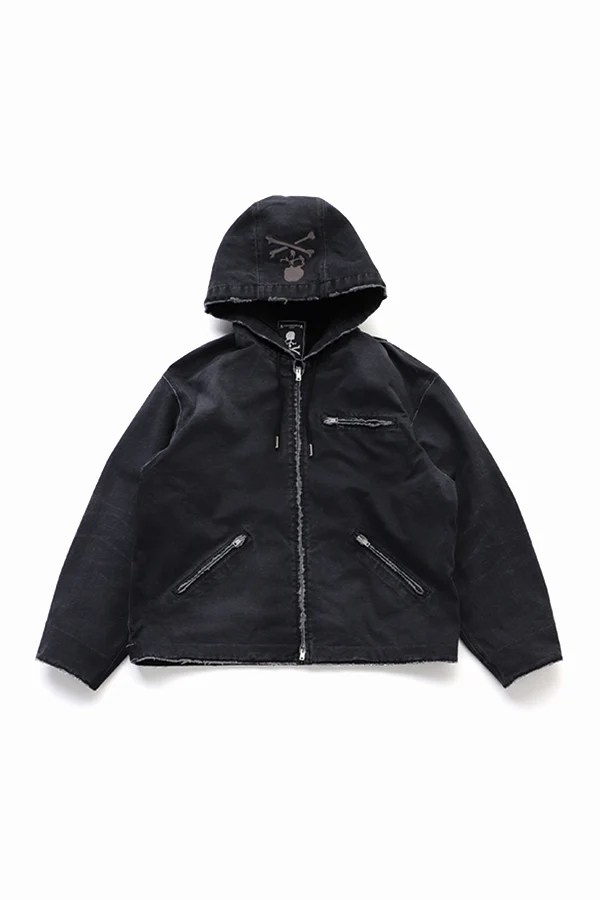 Куртка с капюшоном изготовленная из оригинальной ткани «утиный брезент» с эффектом «пыльной краски» и винтажной обработкой для создания поношенного, аутентичного вида. Вышивка в виде черепа на спине.