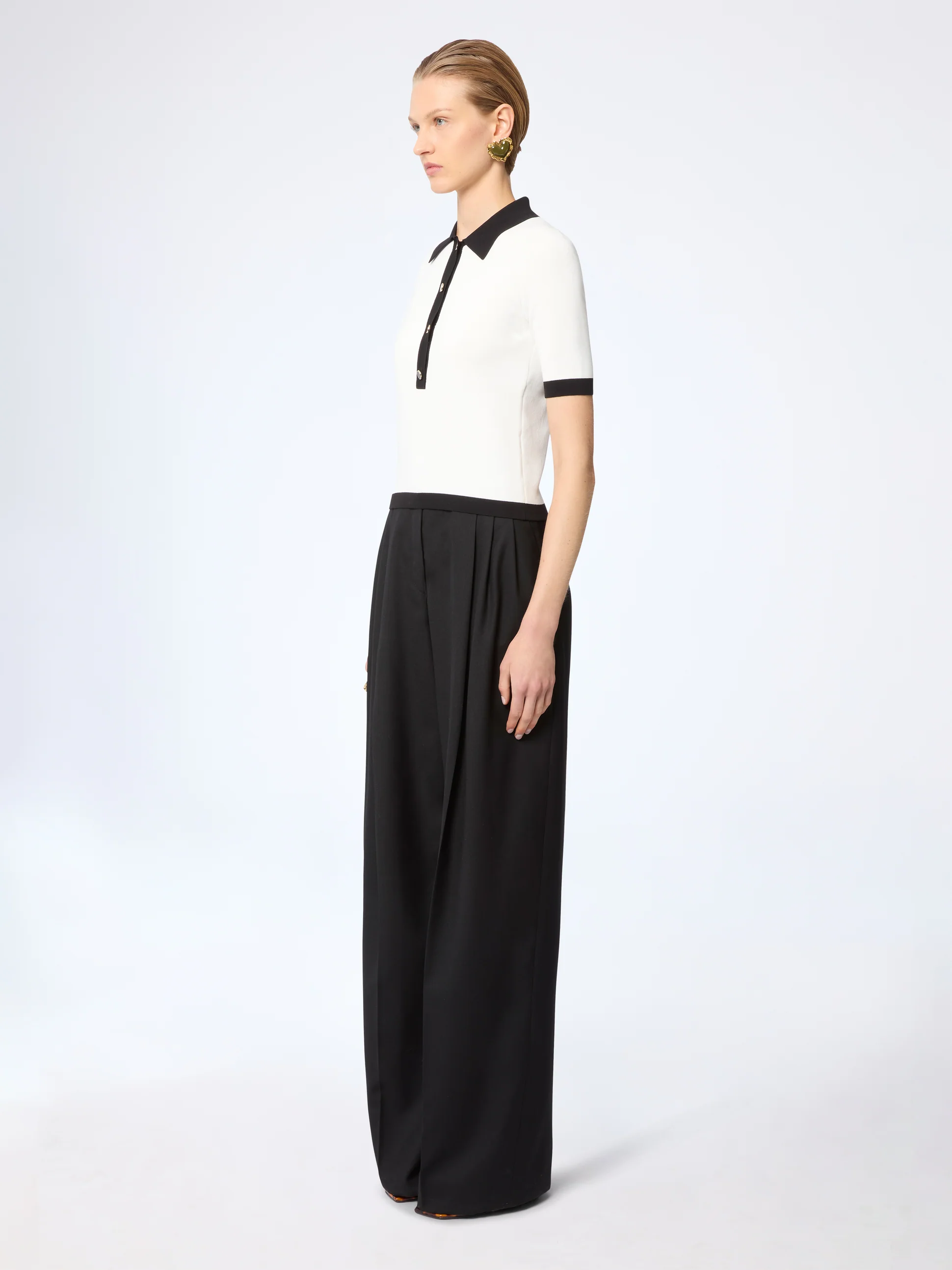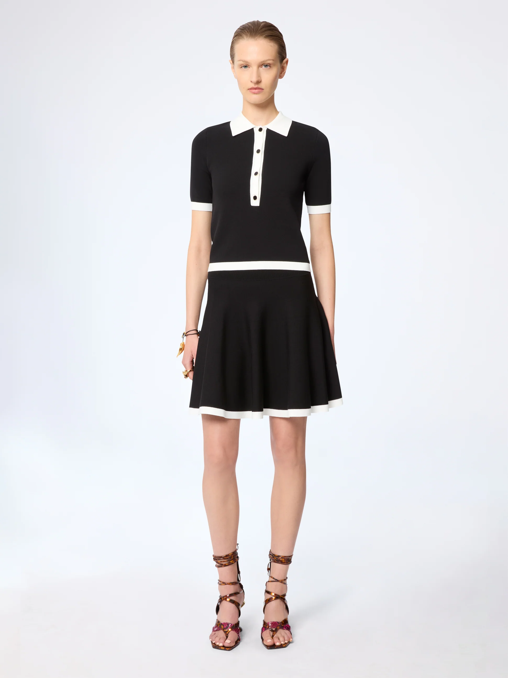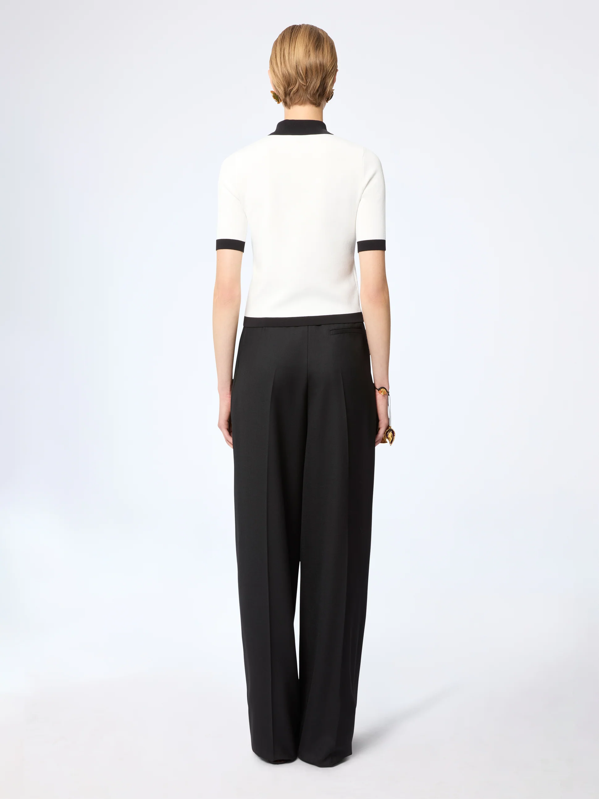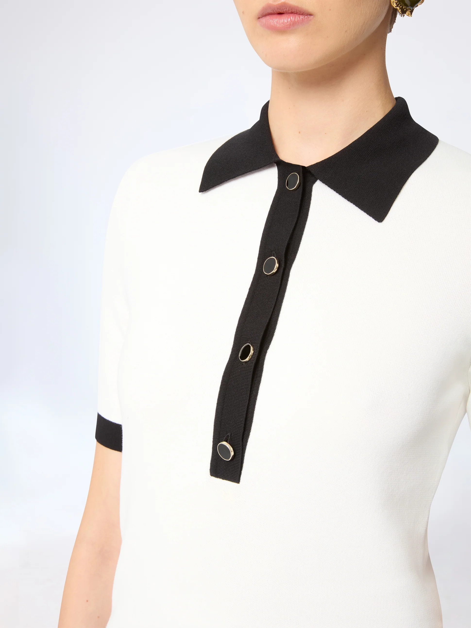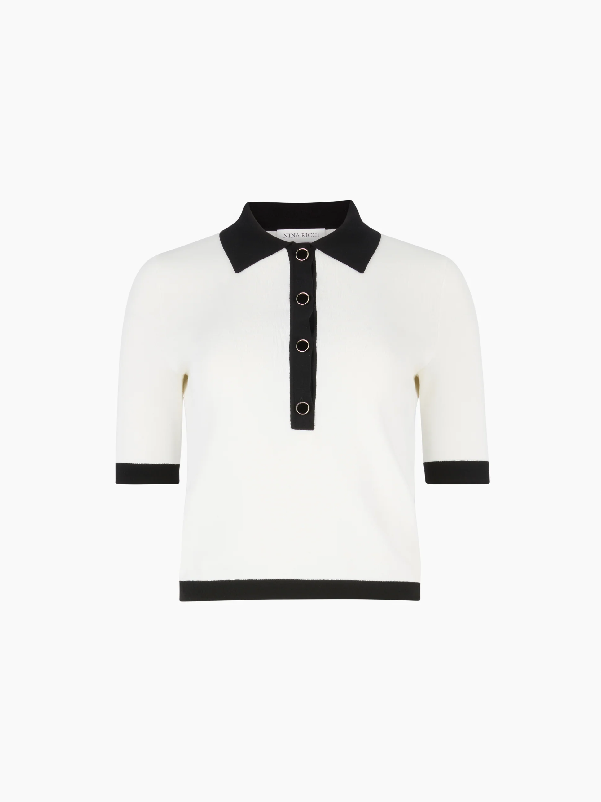 Белая рубашка-поло с коротким рукавом сочетает в себе элементы спортивного стиля и высокой моды. Облегающий силуэт выполнен из эластичного трикотажа и дополнен контрастными черными акцентами на воротнике, планке и манжетах. Лаконичная, но эффектная, она играет на двойственности, сочетая мужские линии и женский крой, создавая непринужденно шикарный образ.