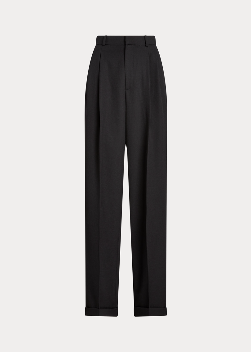 Плиссированная передняя часть и шелковые полоски по бокам в тон определяют стиль этих широких шерстяных брюк в стиле смокинга.