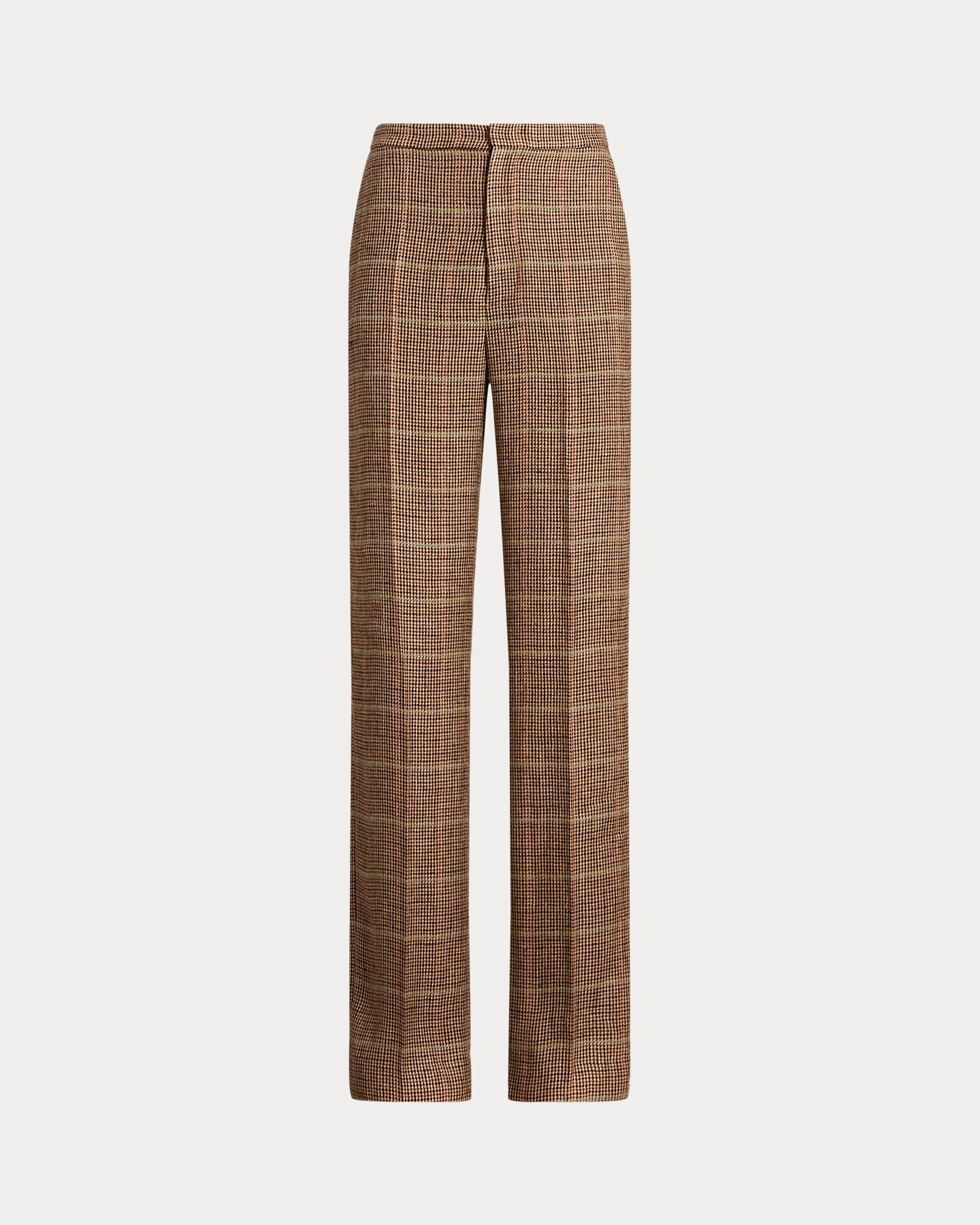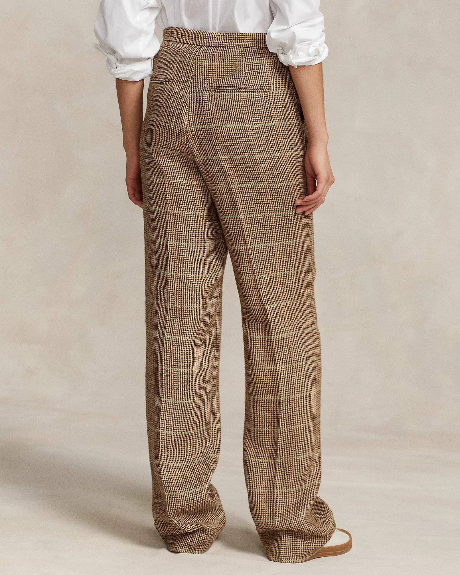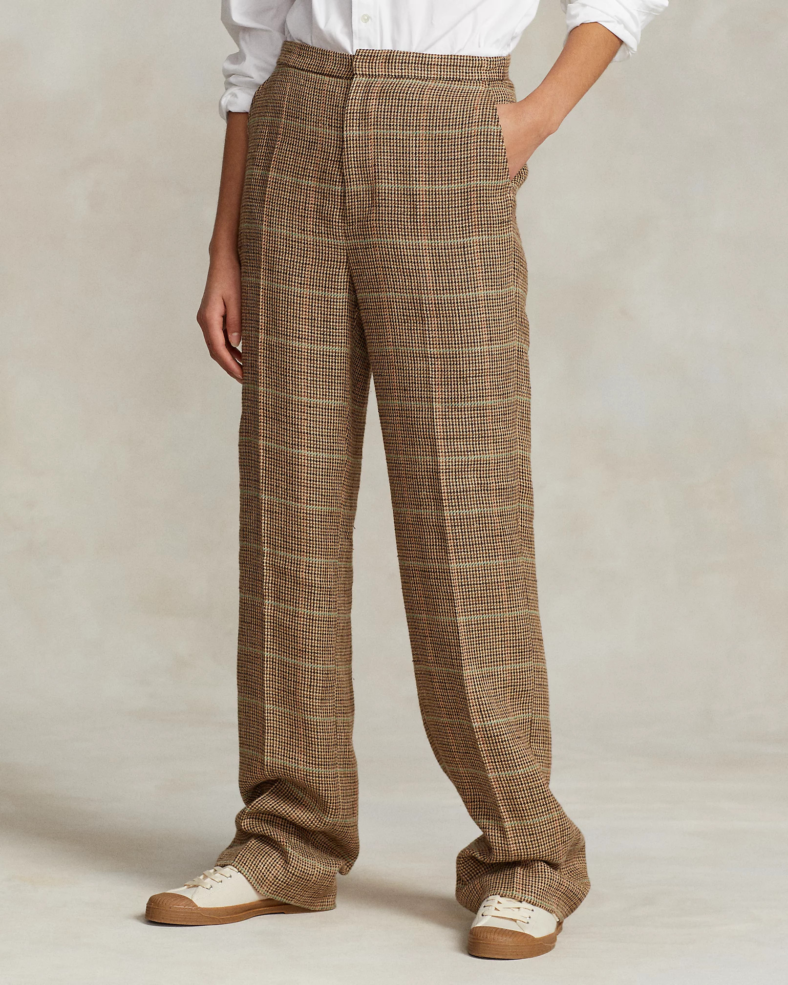 Клетчатые брюки прямого кроя, изготовленные из смеси итальянского льна и шелка, имеют четкую конструкцию с пришитым поясом и четкими складками на каждой штанине.