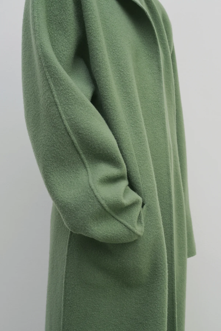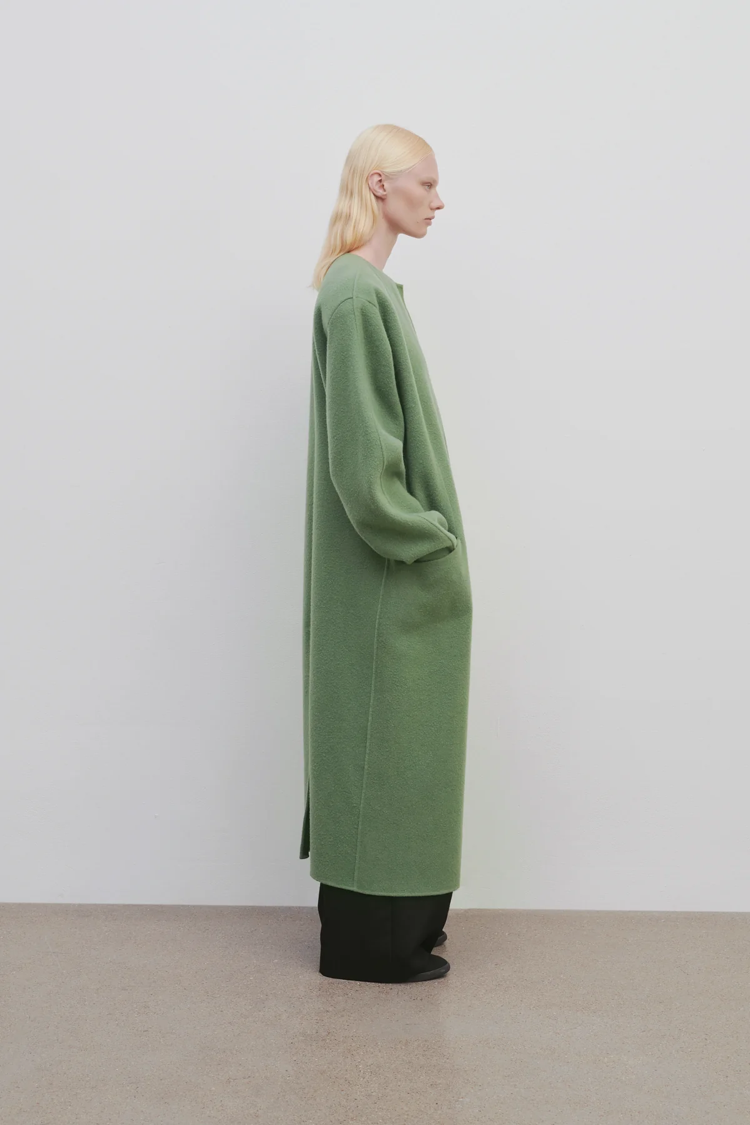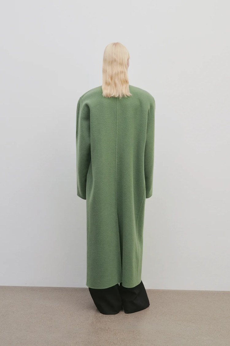 Пальто длиной до икры без воротника из мягкого двустороннего кашемира с перевернутыми лацканами и легкой подкладкой на плечах, подчеркивающей фигуру.