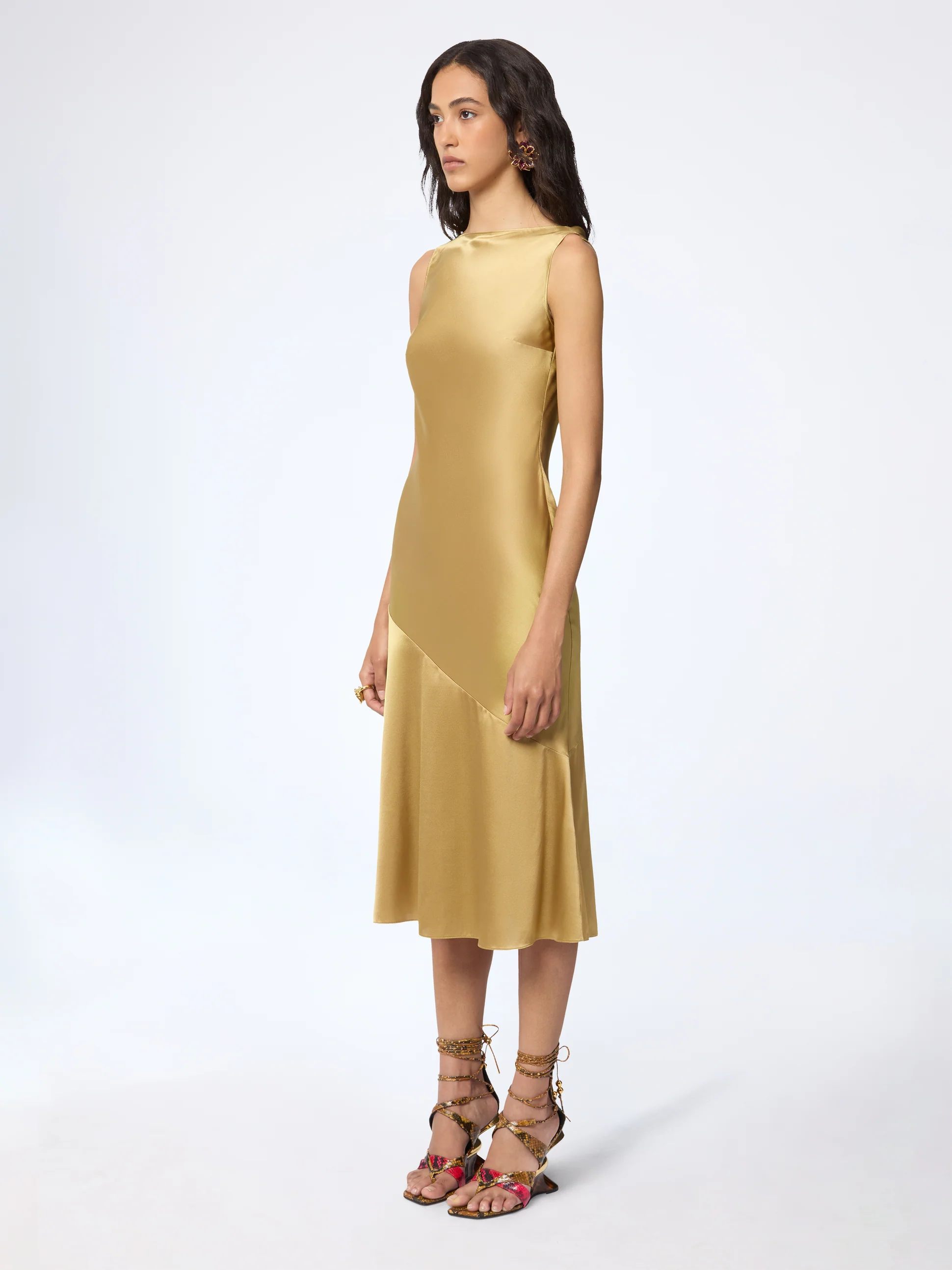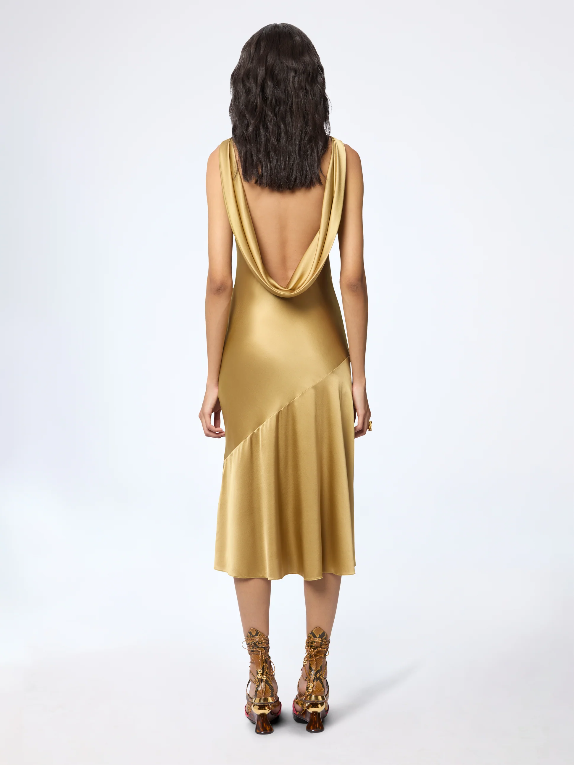 Платье-миди «русалка» с бретелькой через шею, являющееся визитной карточкой силуэта Nina Ricci, воплощает женственность и элегантность.