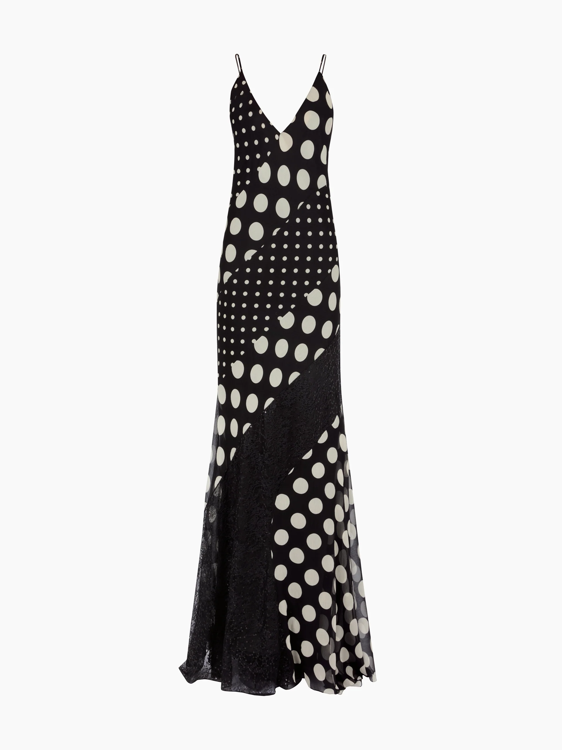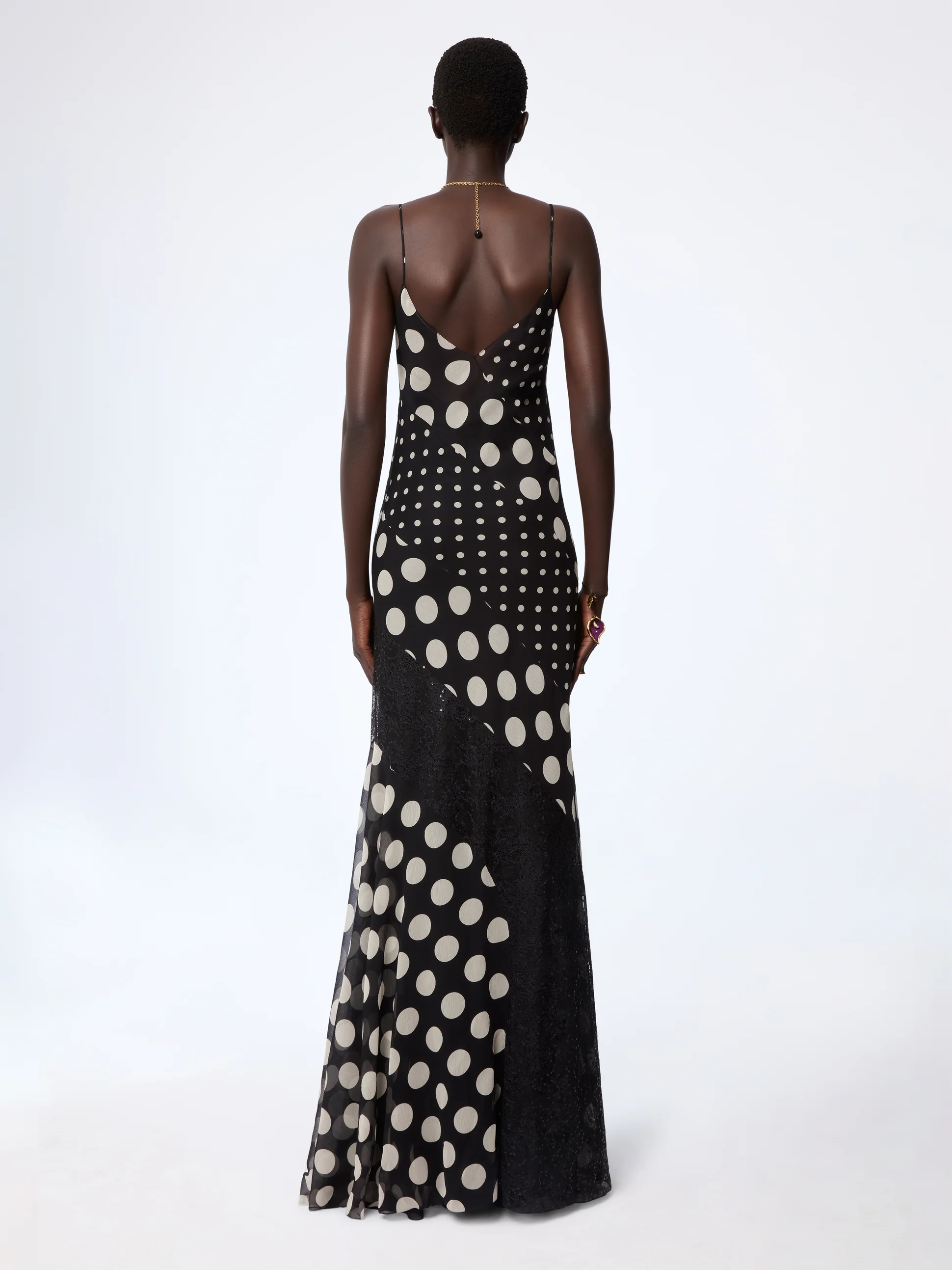 Платье имеет длинный шелковый силуэт, ставший визитной карточкой коллекции, играет с масштабом и ритмом благодаря лоскутному шитью из точек разного размера. Скроенное по косой для изящных движений имеет глубокий вырез и диагональные кружевные вставки, которые подчеркивают фигуру с графической элегантностью.