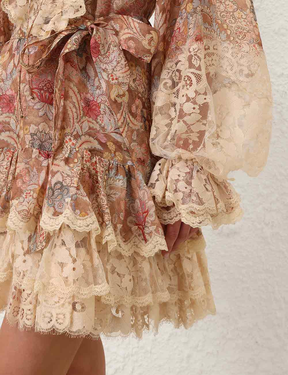 Платье из шелка и льна с глубоким V-образным вырезом и шнуровкой в виде руликов, длинными рукавами-блузонами с эластичными манжетами и многослойной оборкой по вырезу, манжетам и подолу.