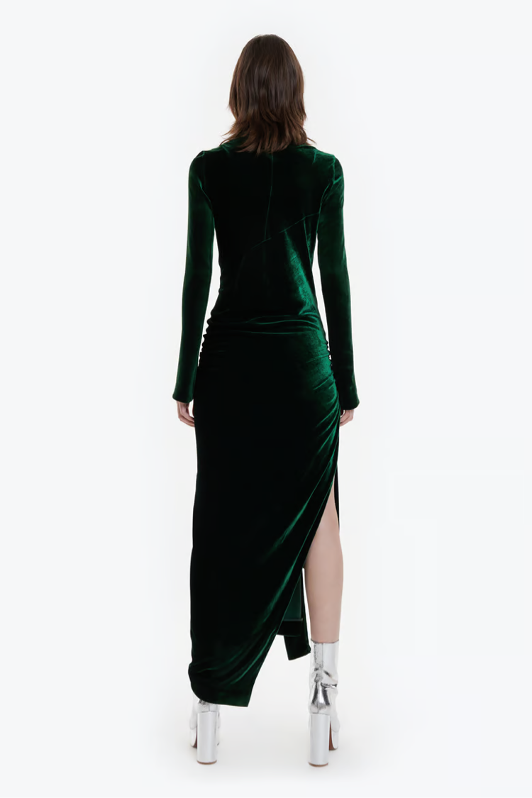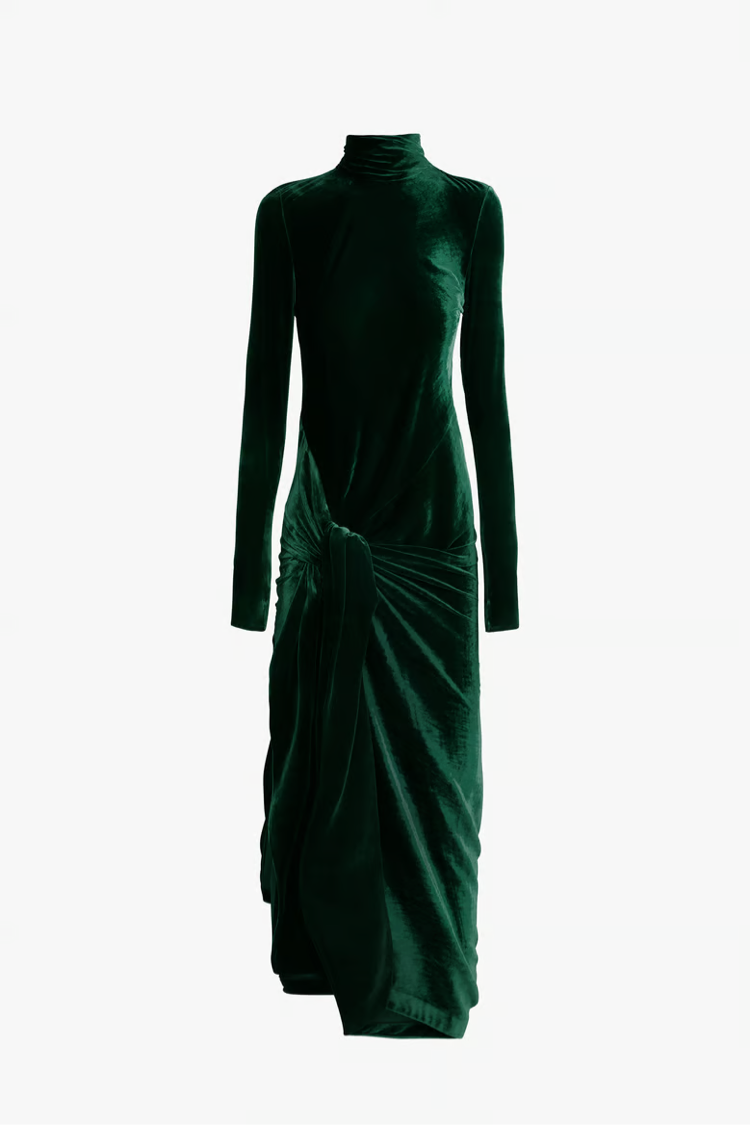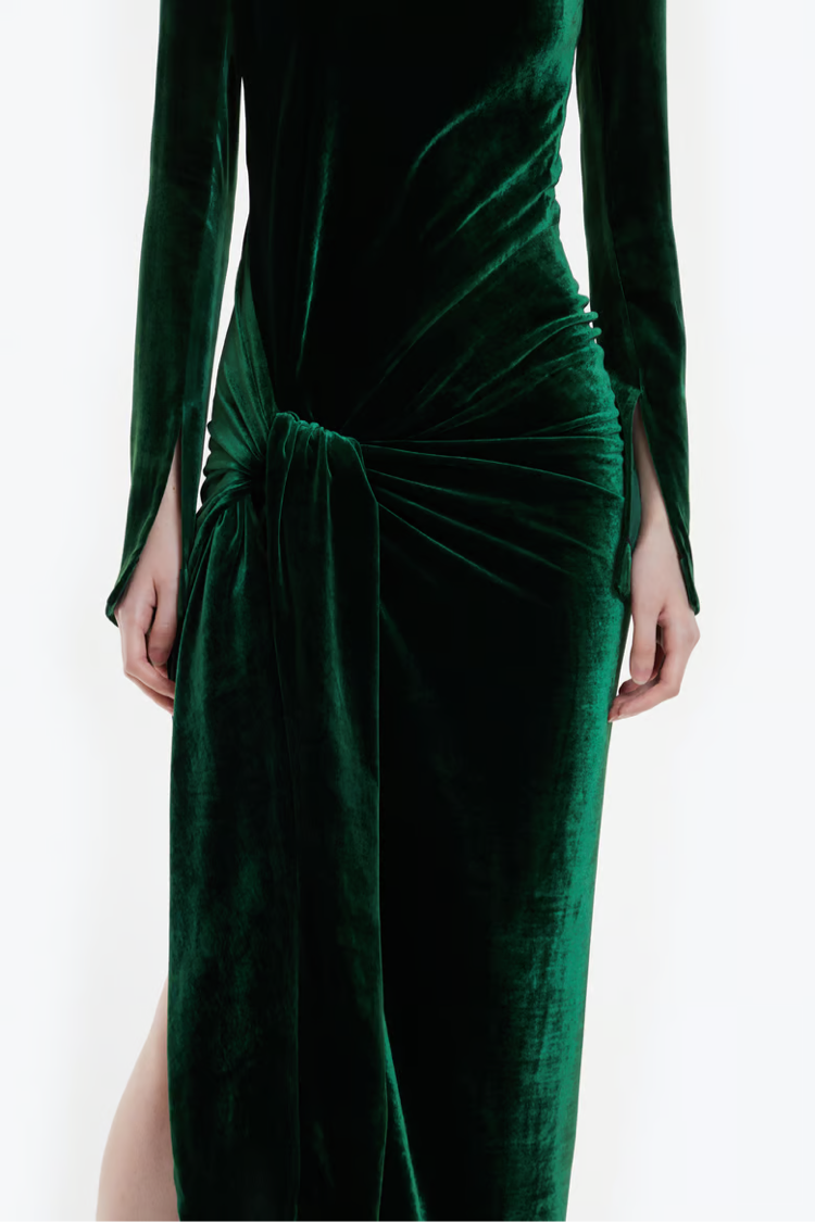 Приталенное длинное бархатное платье со встроенным поясом и облегающим силуэтом с запахом.