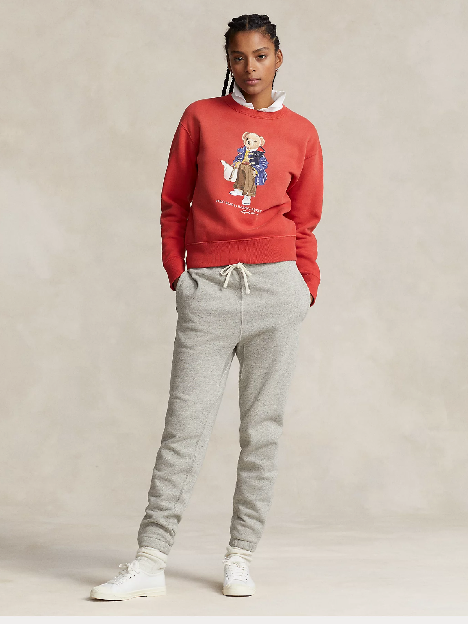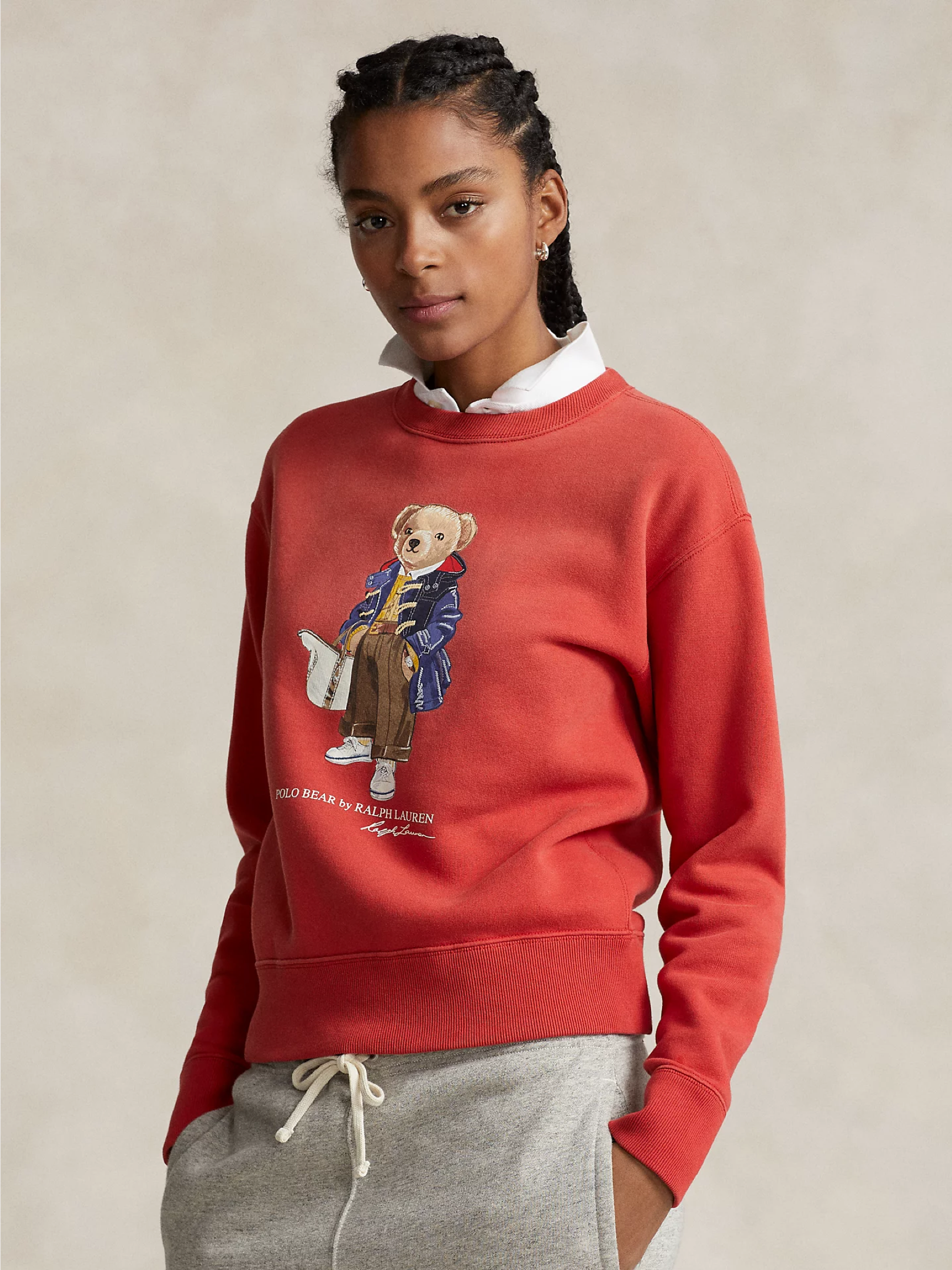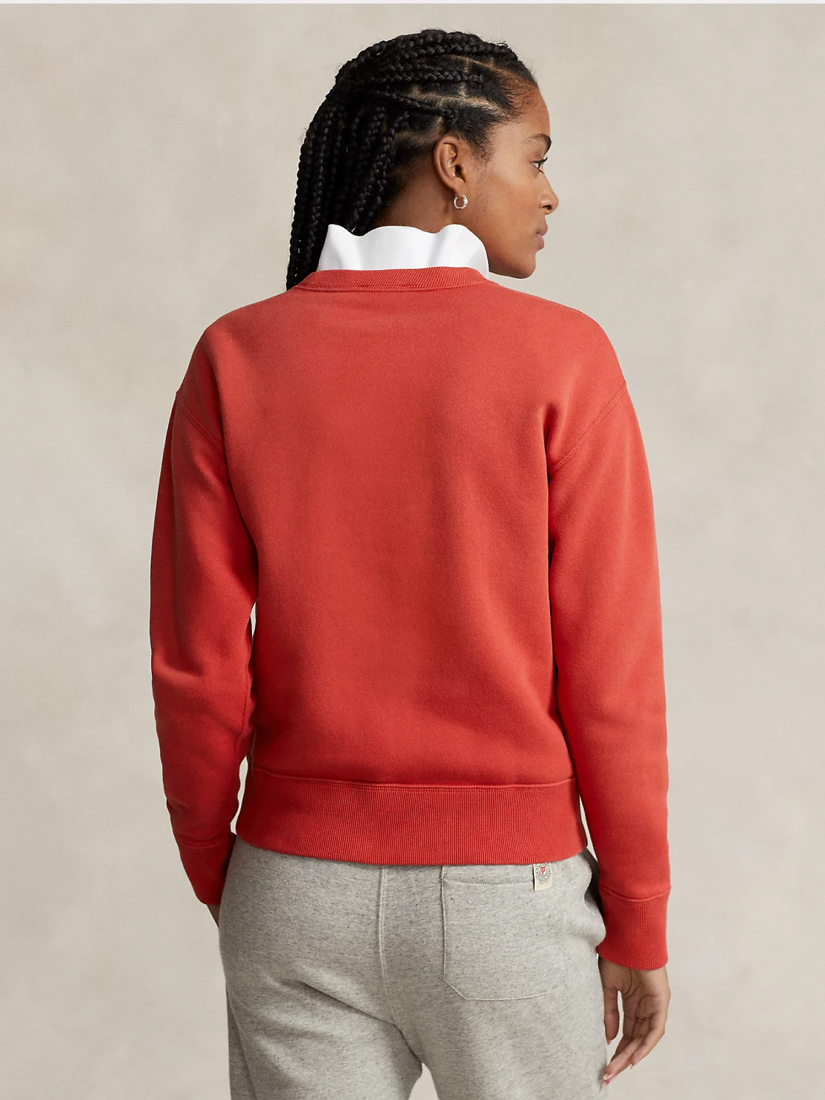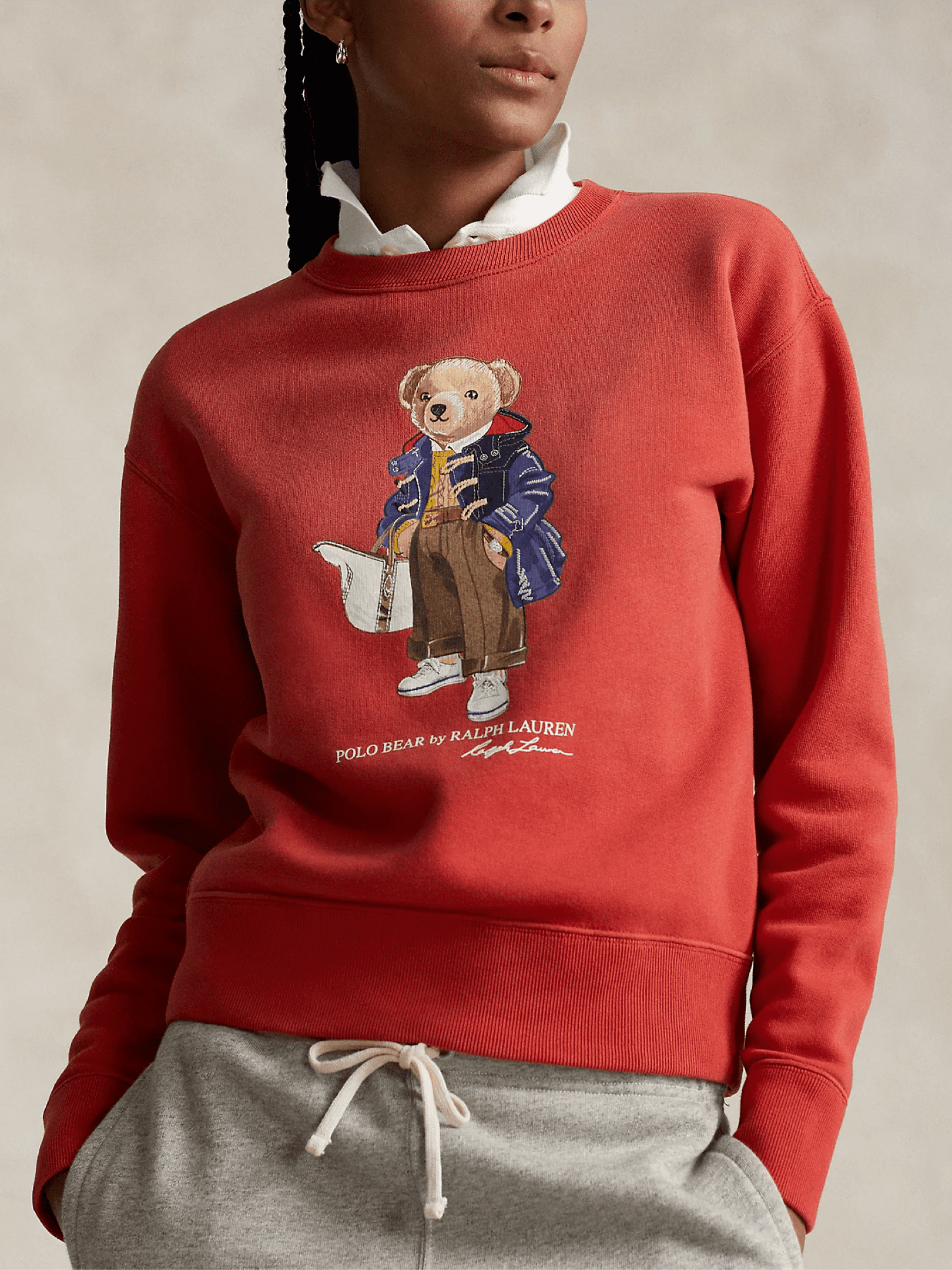 Флисовая модель с круглым вырезом из смесового хлопка искуственно состарена и украшена изображением культового талисмана, одетого в пальто-тоггл и свитер косой вязки. Вышитые детали придают текстуру и объем мотиву Polo Bear.