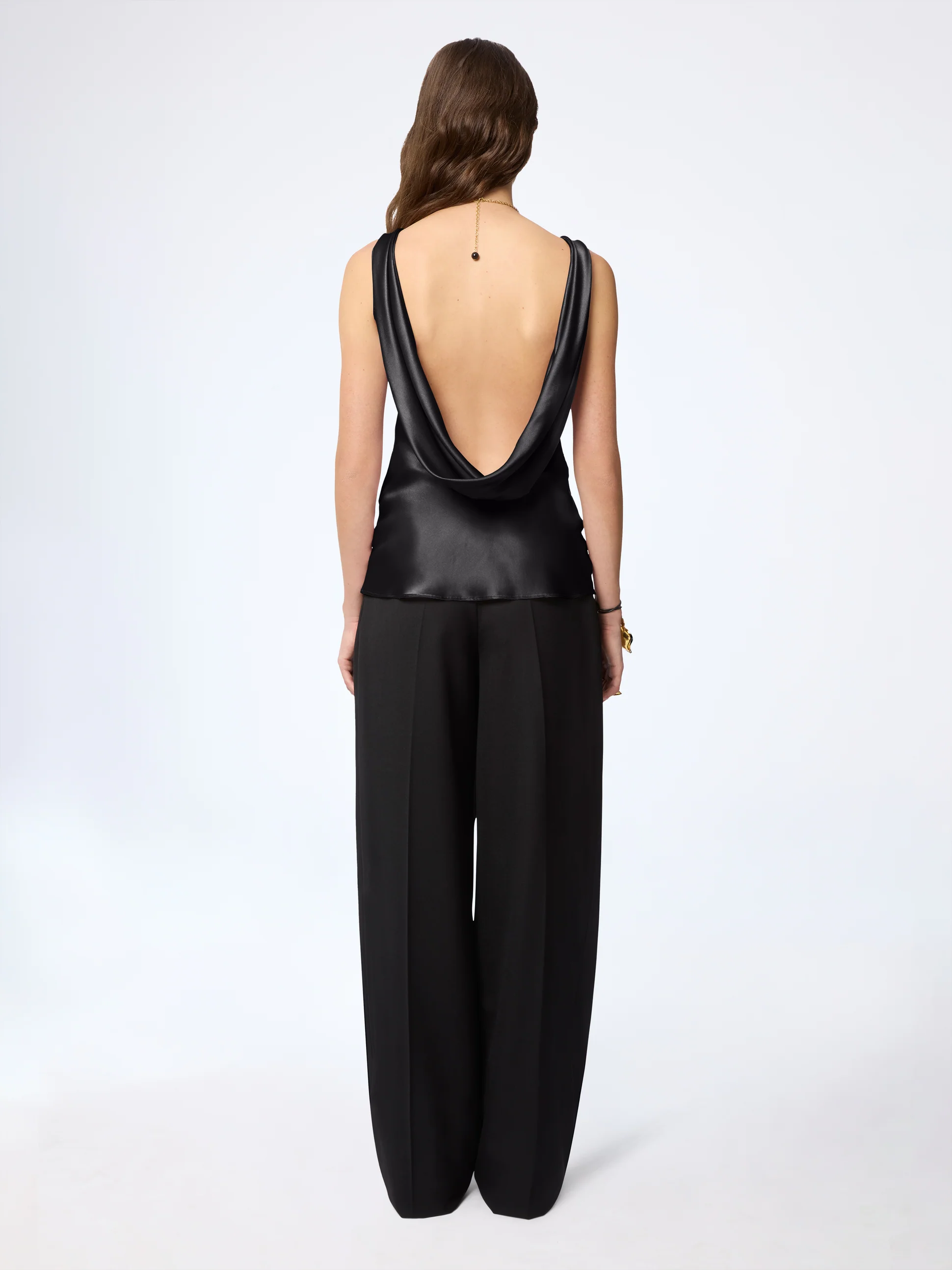 Топ с завязками на шее из черного шелкового атласа воплощает фирменную двойственность дома моды: скульптурный вырез и изящная драпировка, плавно облегающая тело. Минималистичный и чувственный одновременно. Изысканный силуэт, отражающий эволюцию женственности Нины Риччи под творческим руководством Харриса Рида.
