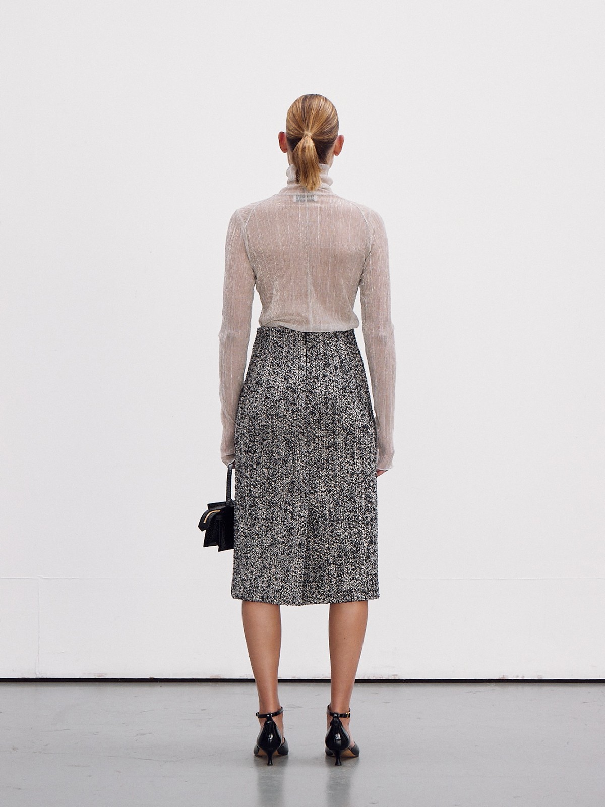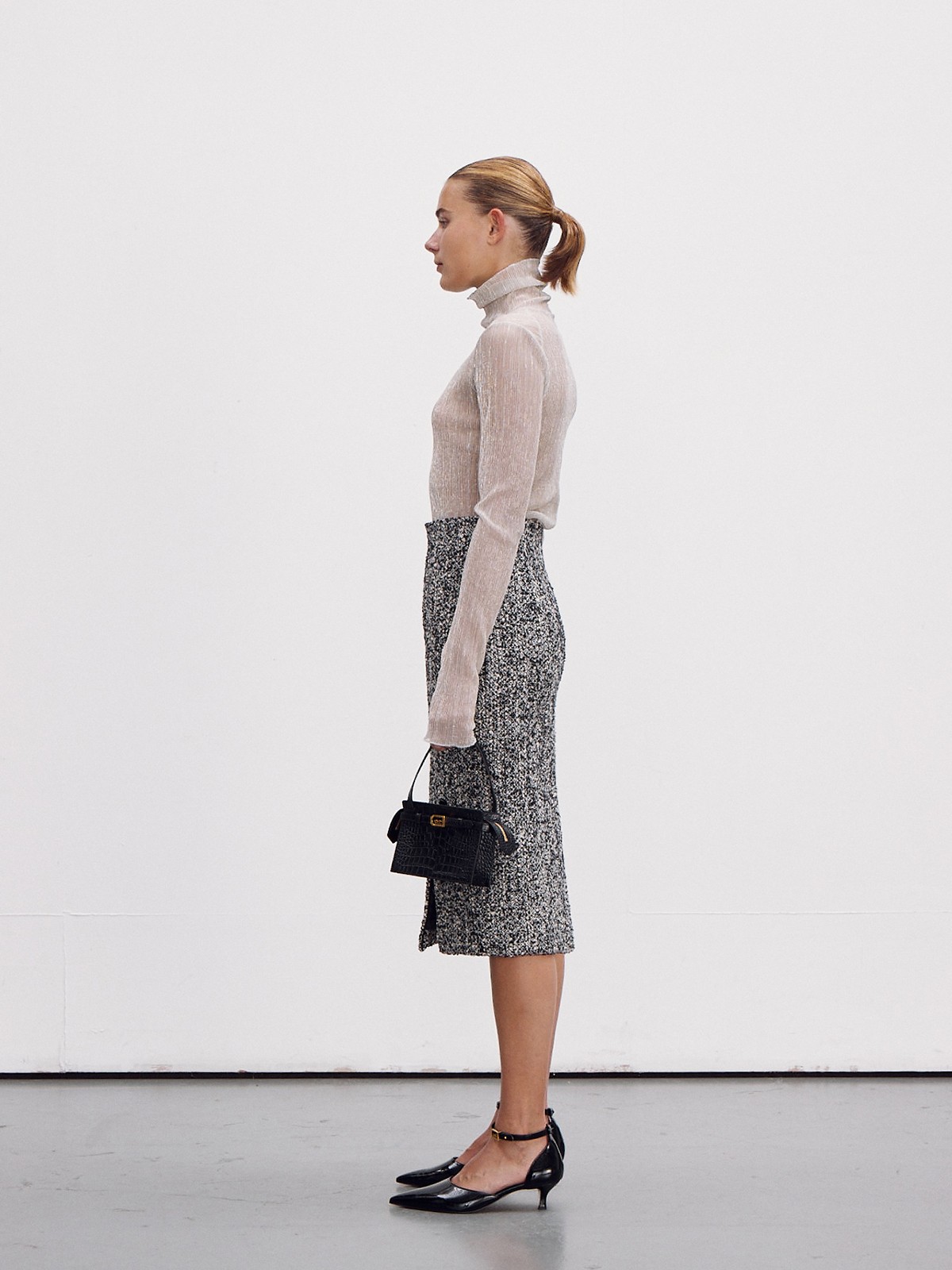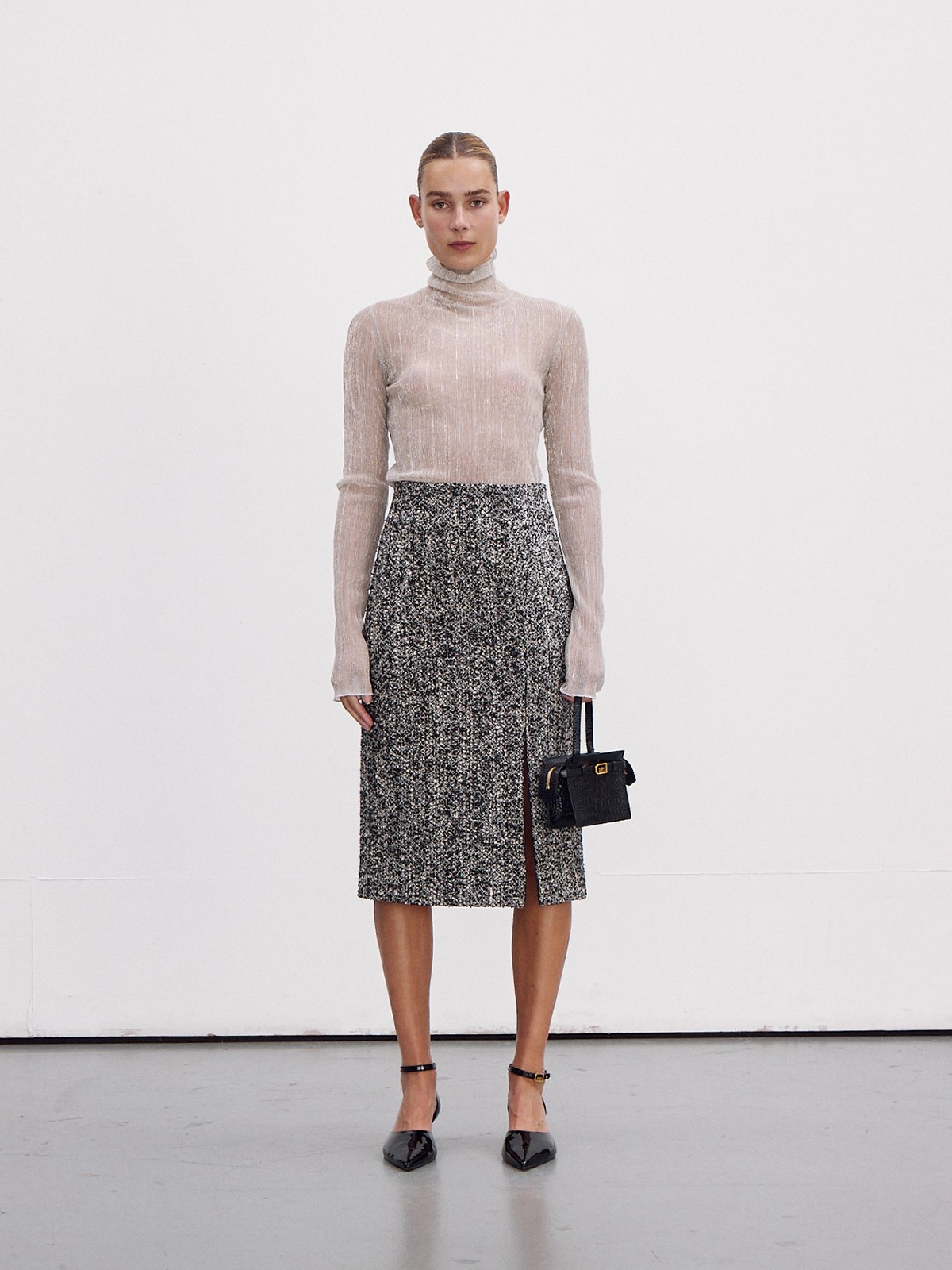 - Топ с подвернутым воротником из блестящей металлизированной ткани.