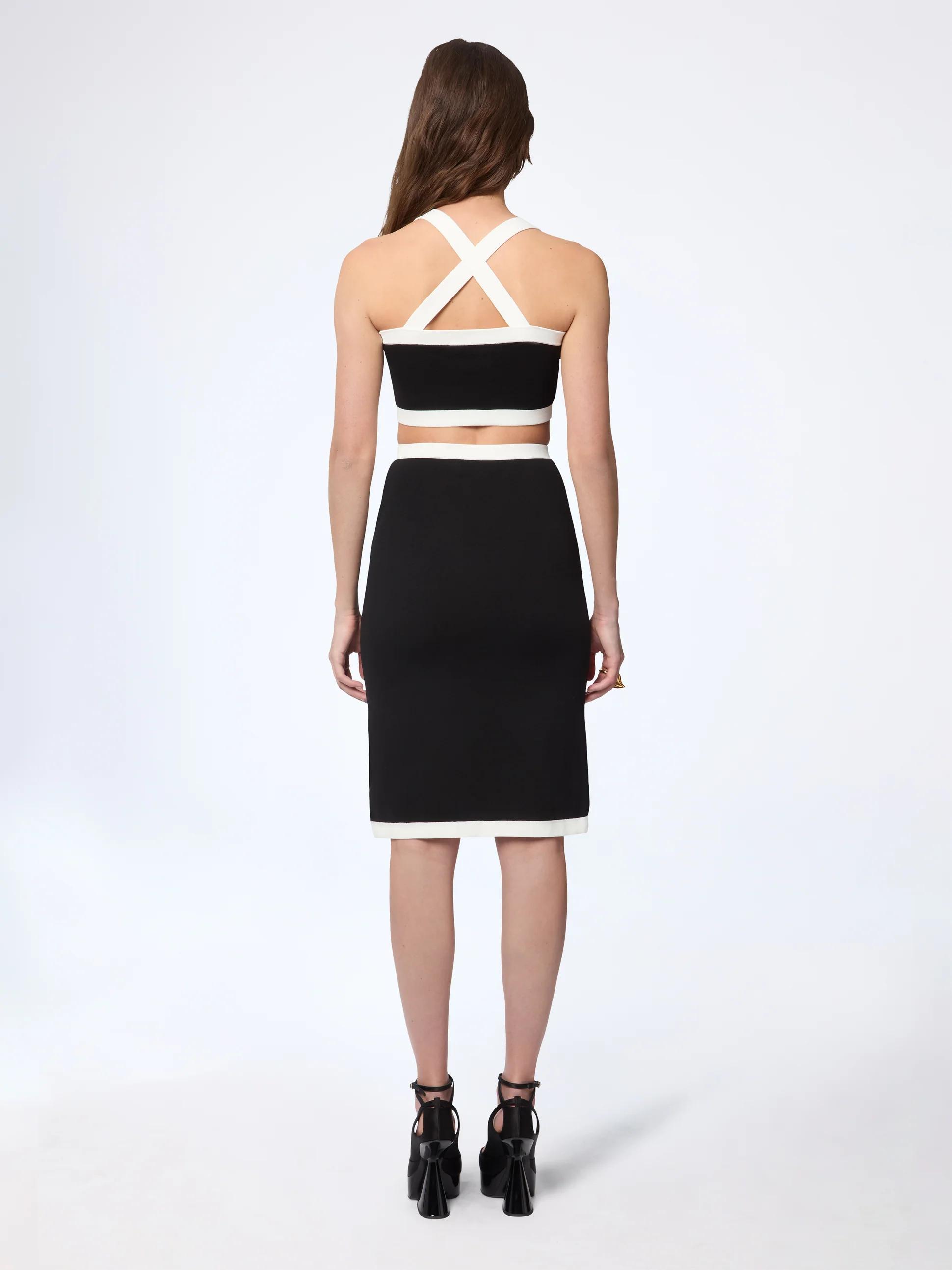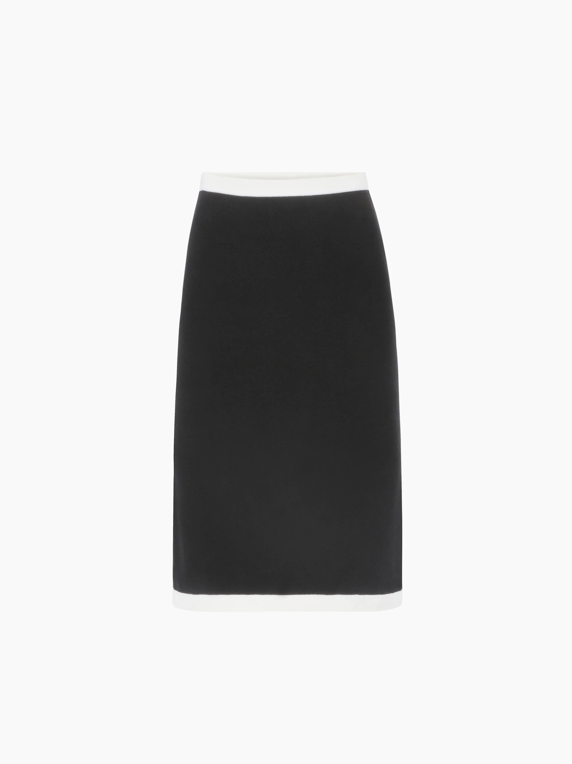 Черная юбка миди выполнена из эластичного трикотажа, обеспечивающего обтекаемую и удобную посадку. Белая контрастная отделка подчеркивает силуэт, добавляя изысканный графический акцент. Универсальная вещь, которая сочетается со всем: от мягкой рубашки до подходящего бюстгальтера.