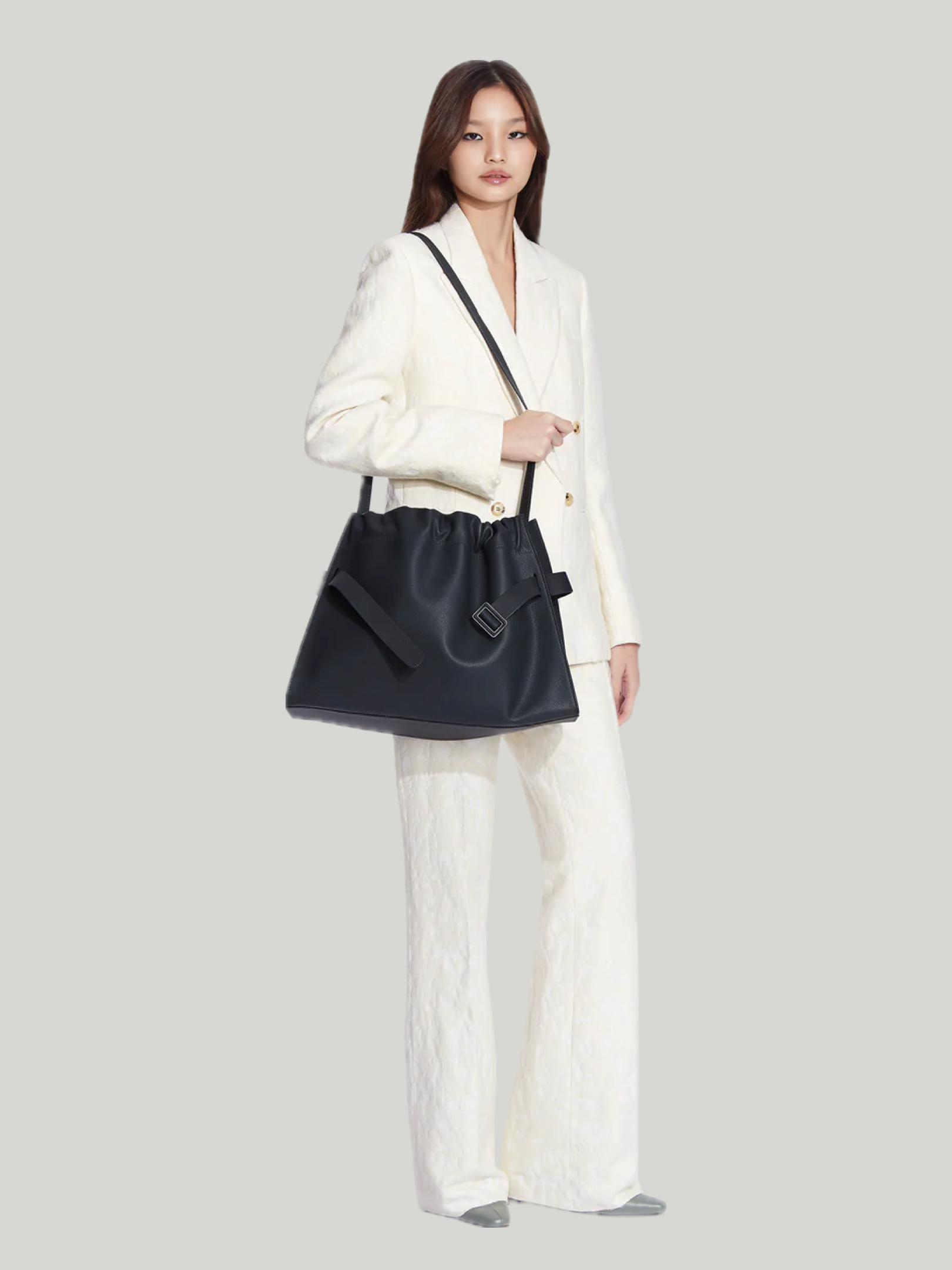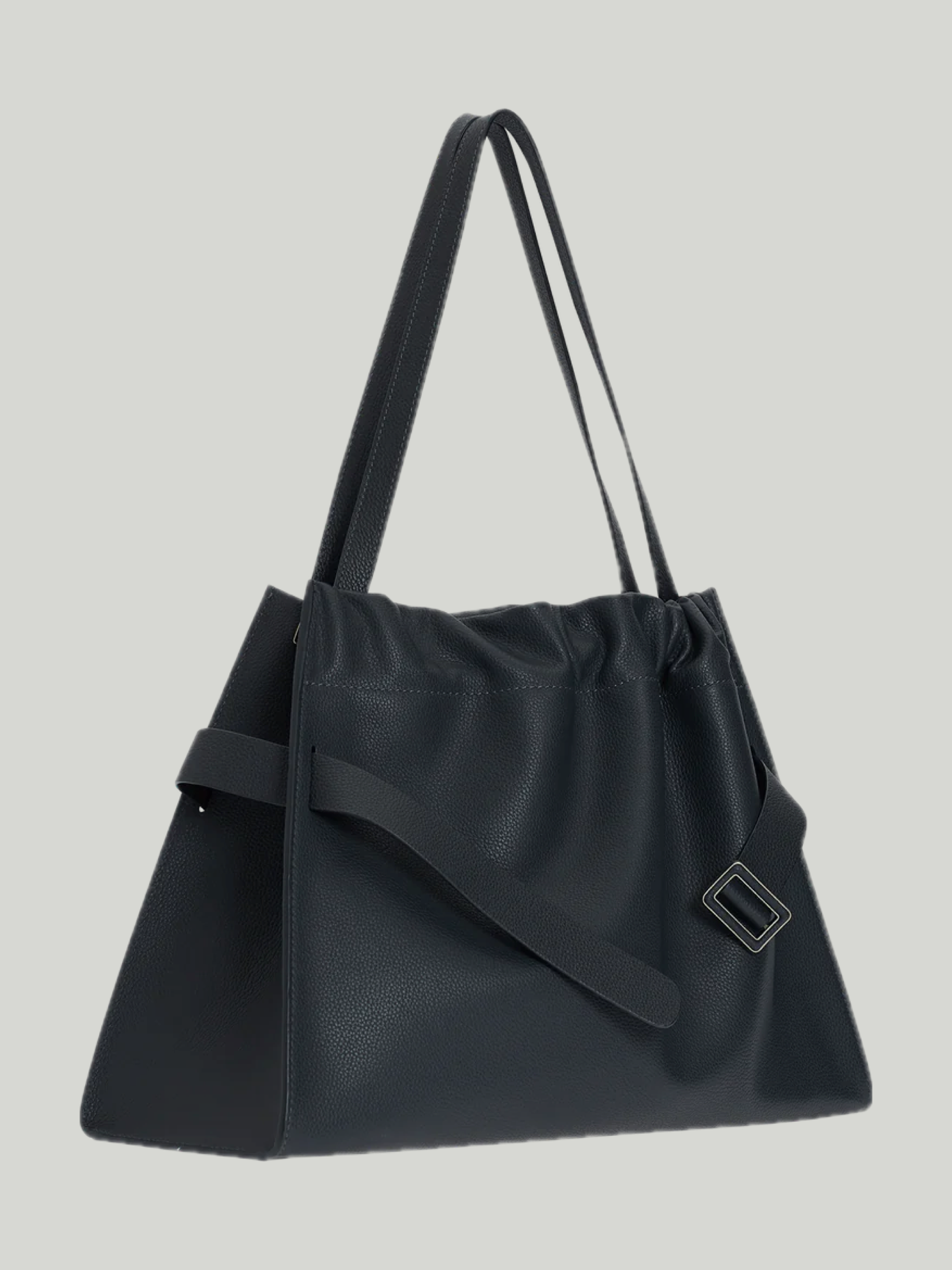 В тон и кожаная пряжка, и кожаный ремень. Регулируемый двусторонний кожаный ремень через плечо.